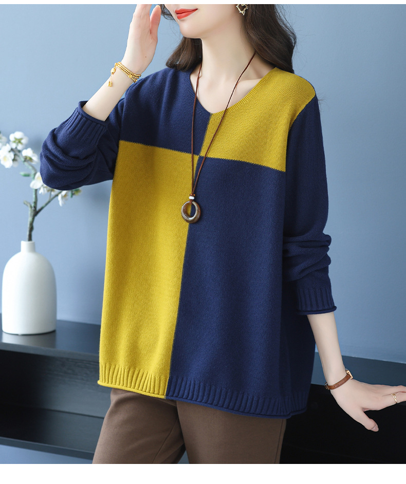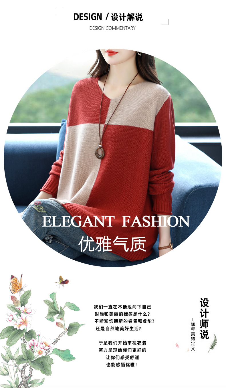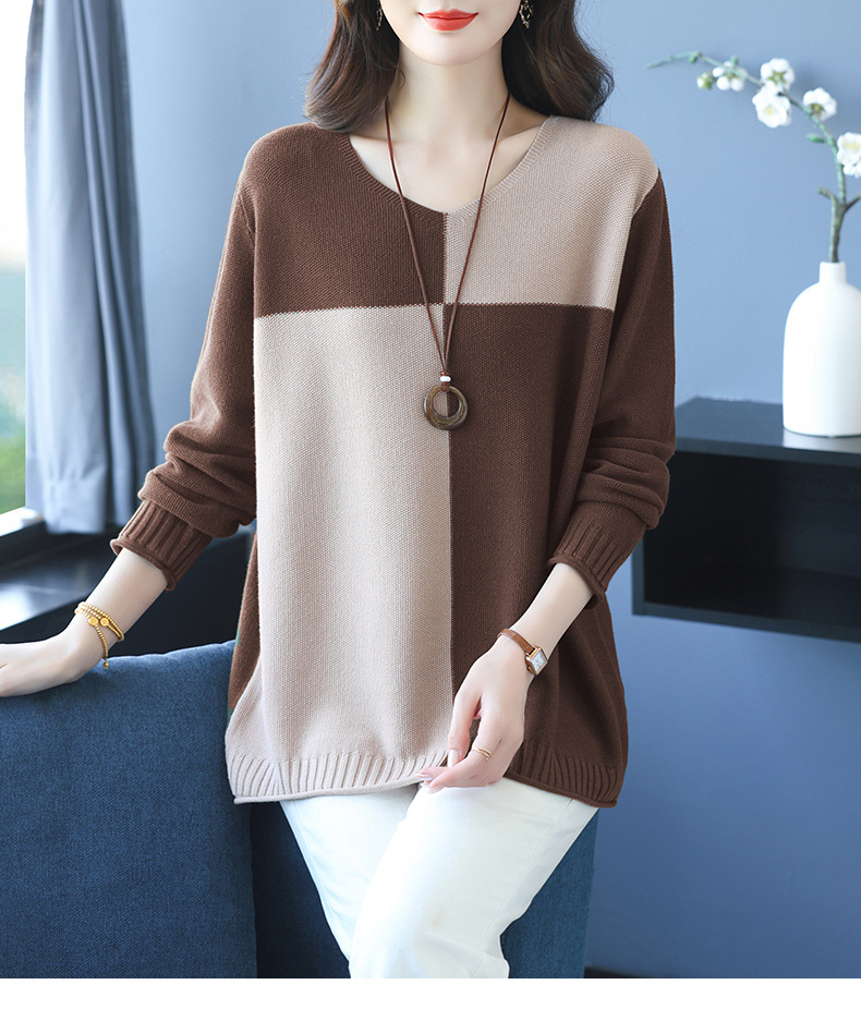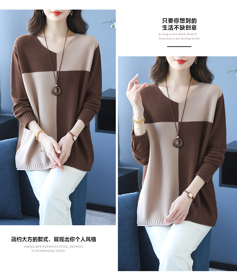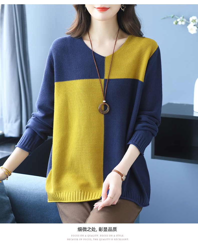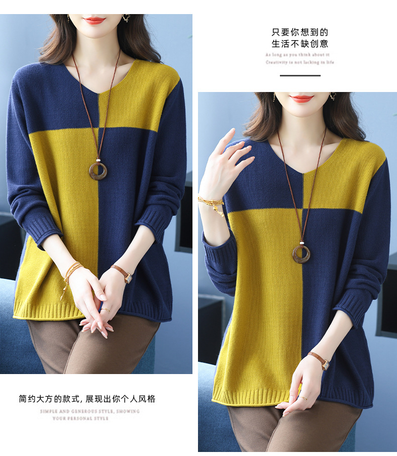CC 37-3130拼色V领长袖针织衫气质宽松大码