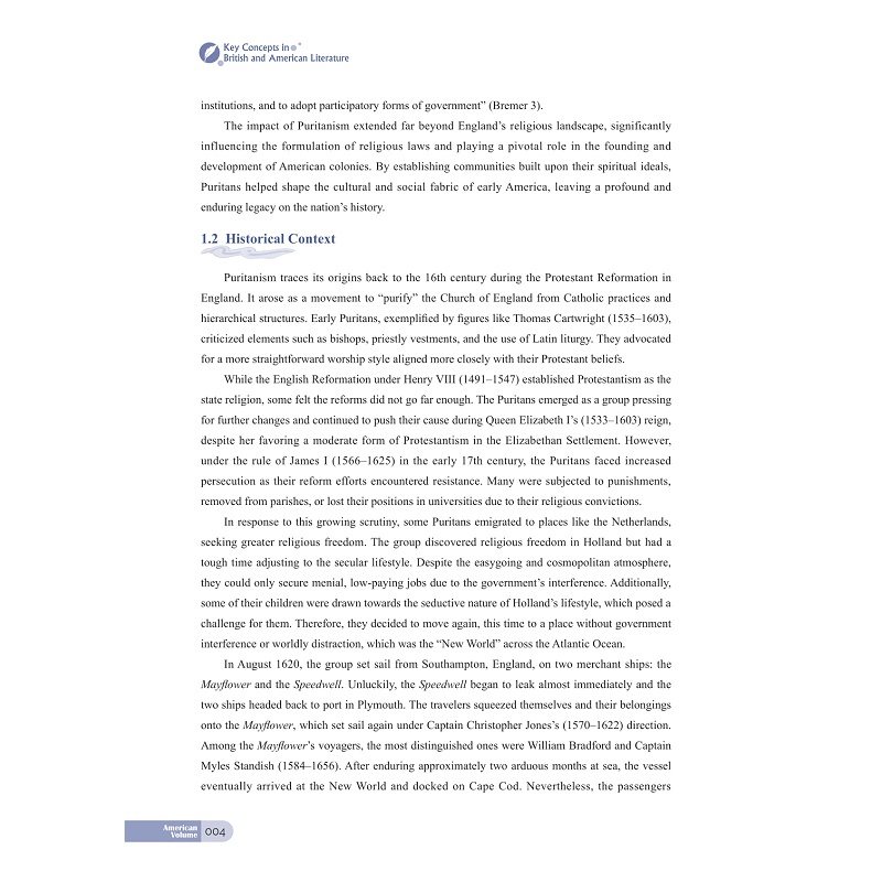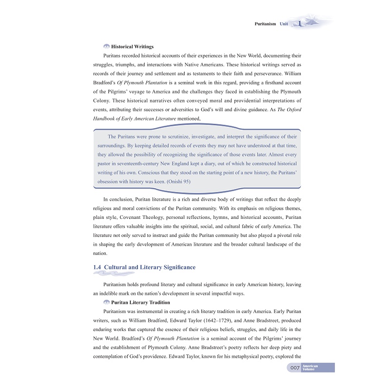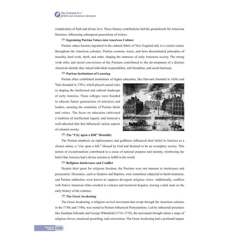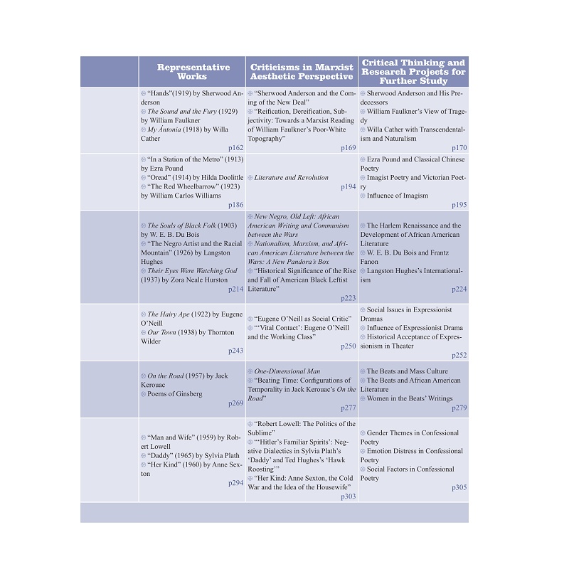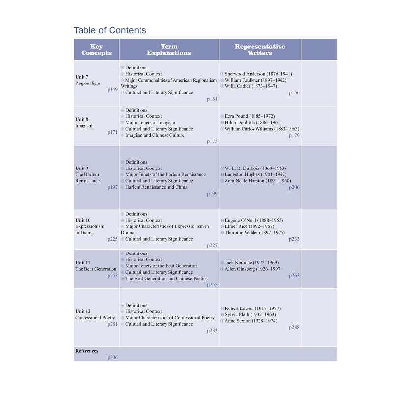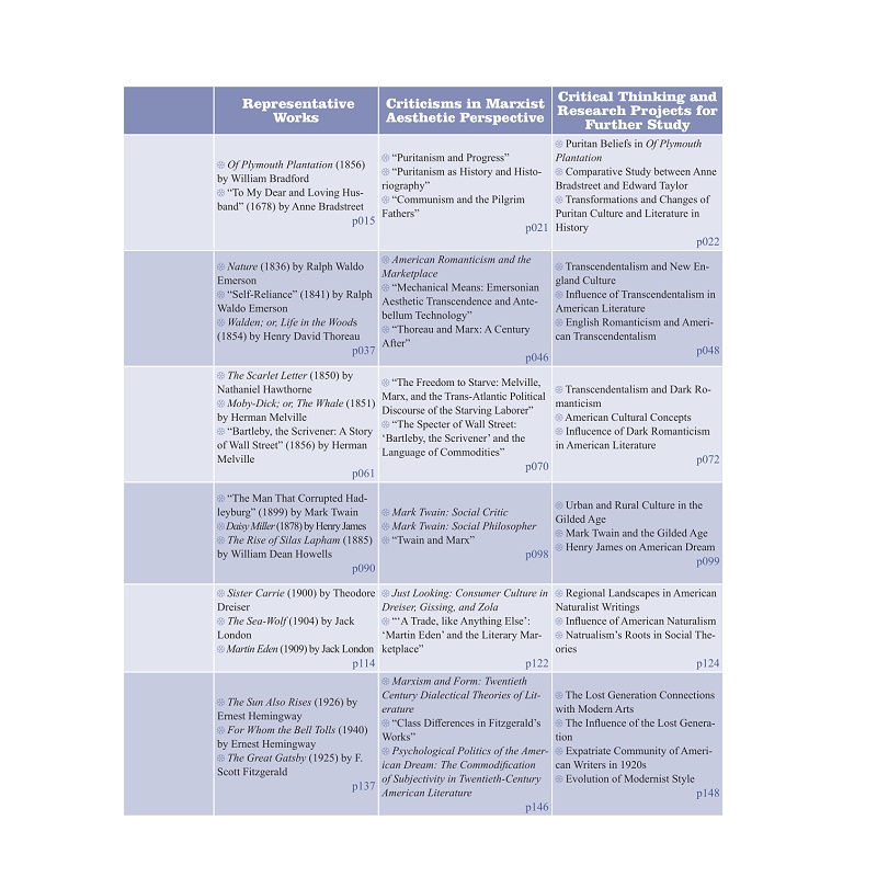 本教材围绕1.Puritanism 2. Manifest Destiny 3. Transcendentalism 4. Dark Romanticism 5. The Gilded Age 6. American Naturalism 7. The Progressive Era 8. The Jazz Age 9. The Lost Generation 10. Local Colorism/Regionalism 11. Imagism 12. Harlem Renaissance 13. Expressionism (in drama) 14. The Beat Generation 15. Black Humor 16. Cosmopolitanism/Multiculturalism这16个关键词分为16个章节,每章从关键词的界定出发,探讨关键词在美国文学史中的内涵、产生的历史背景和文化背景、以及对文学史发展产生的文化意义。在此基础上,每章围绕关键词介绍与此词密切相关的作家及代表性作品,选取作家作品的经典章节进行赏析批评,在文本赏析的过程中既关注培养学生的文本细读能力。