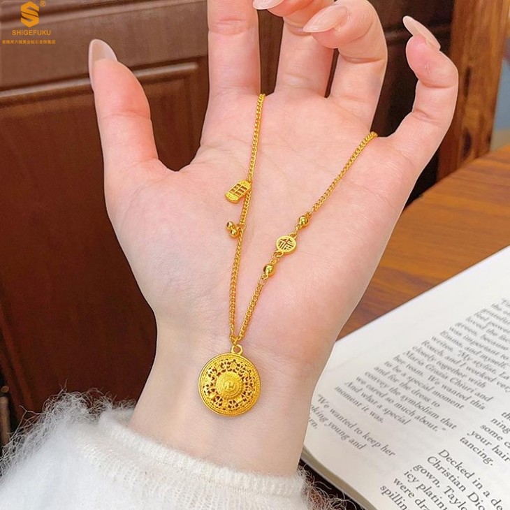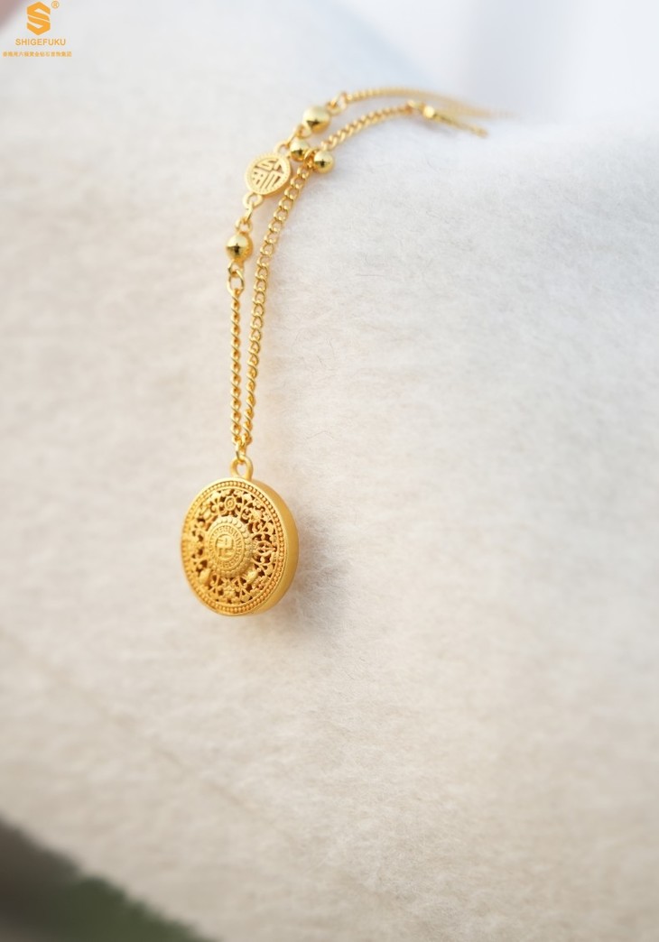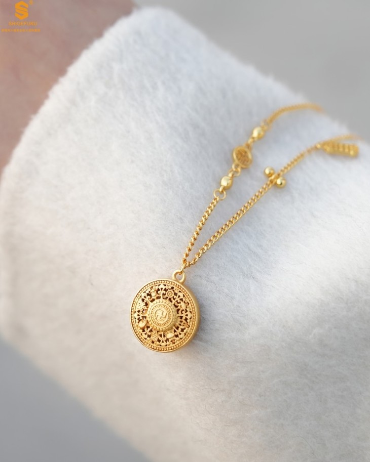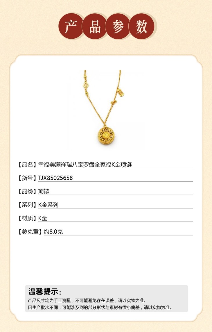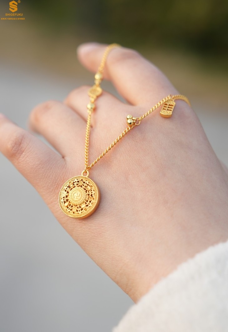 【香港周六福 幸福美满祥瑞」中式古法镂空八宝罗盘K金项链