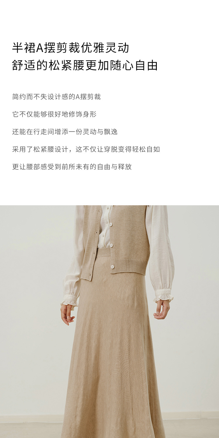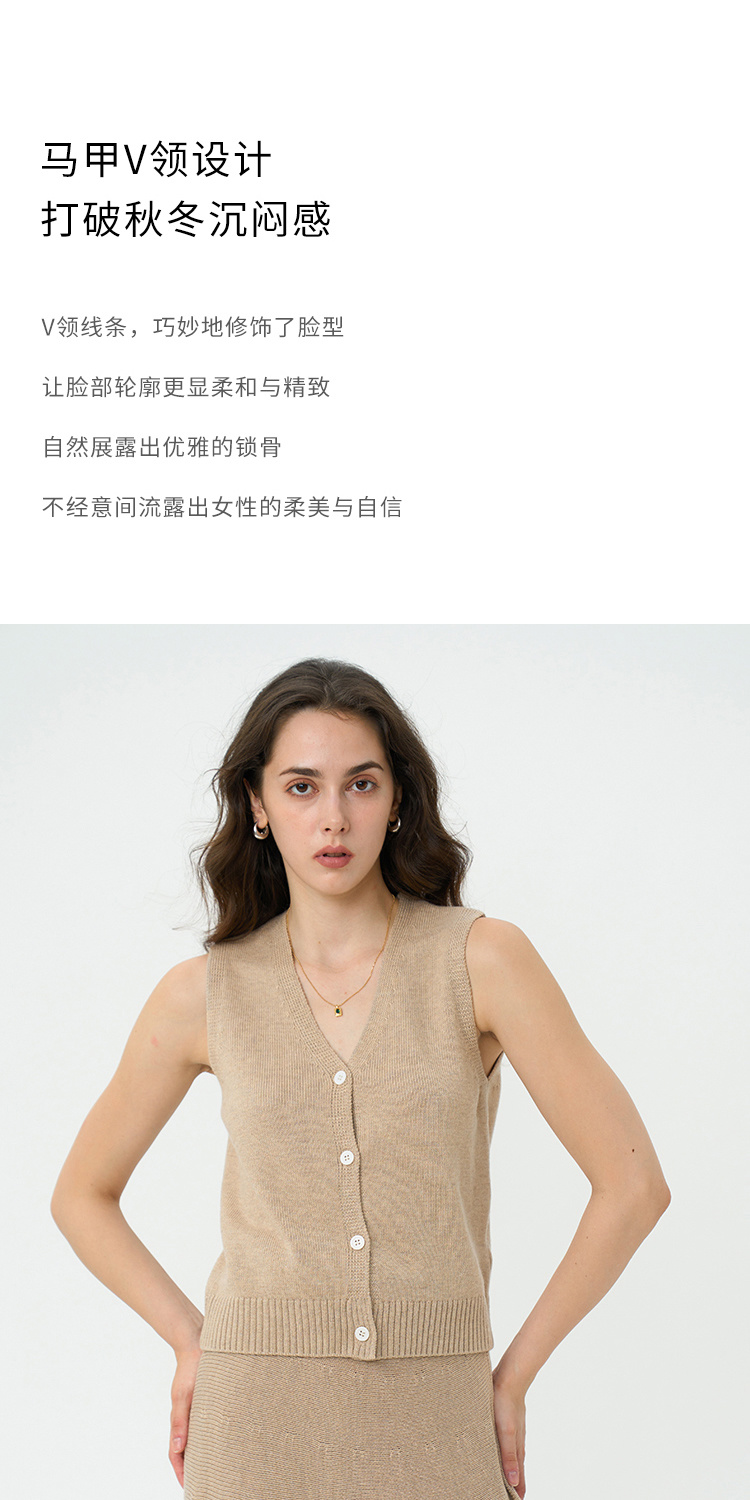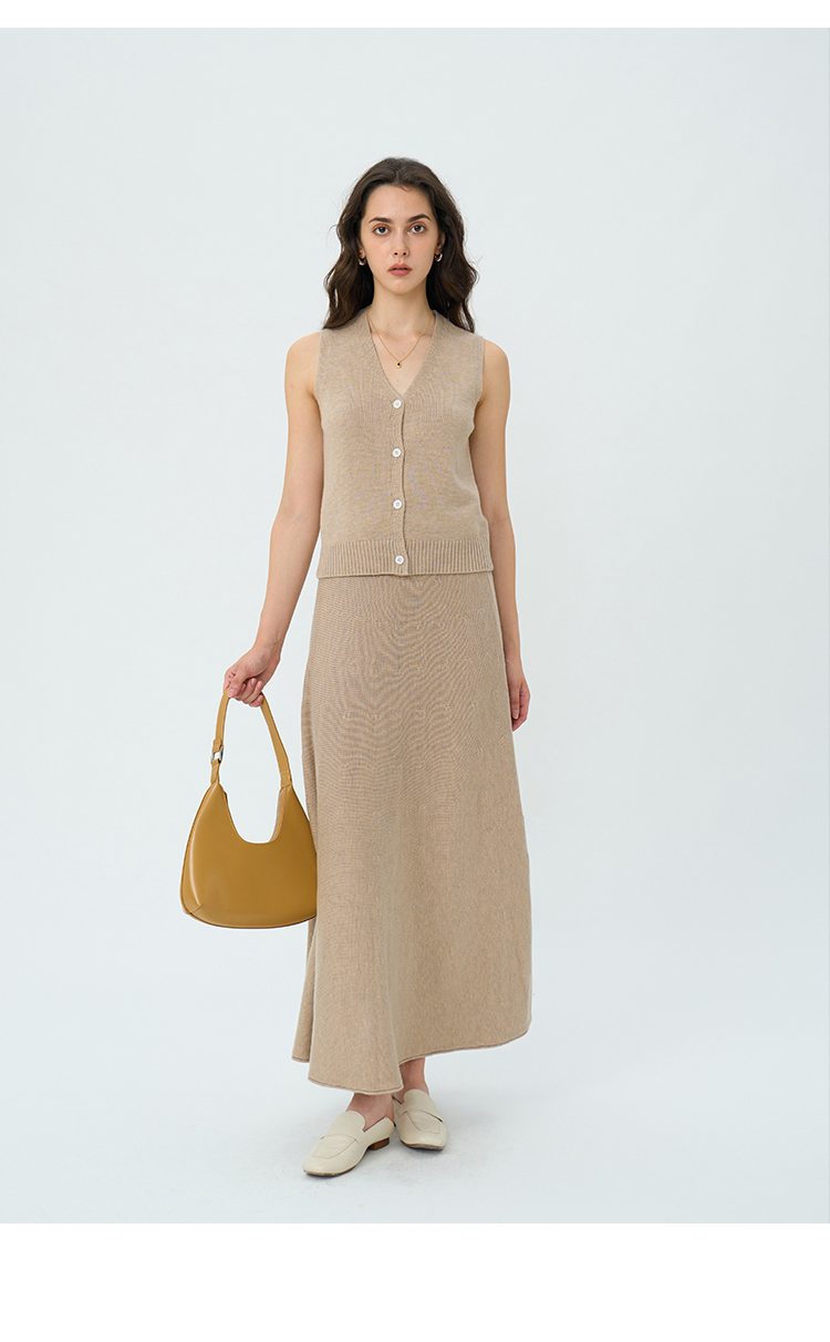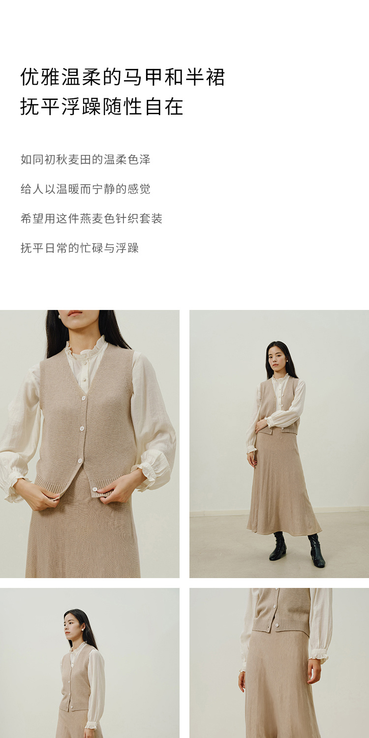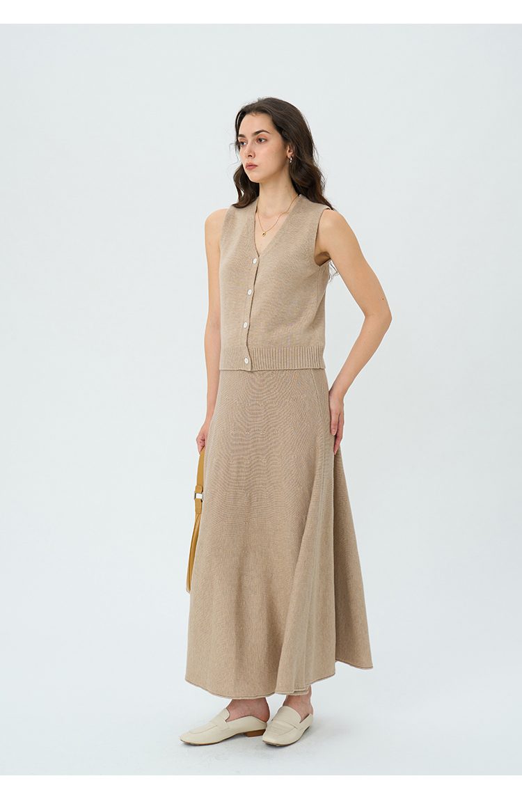 HeyDress针织马甲女秋季v领叠穿卡其色a字气质百搭半身裙时髦套装