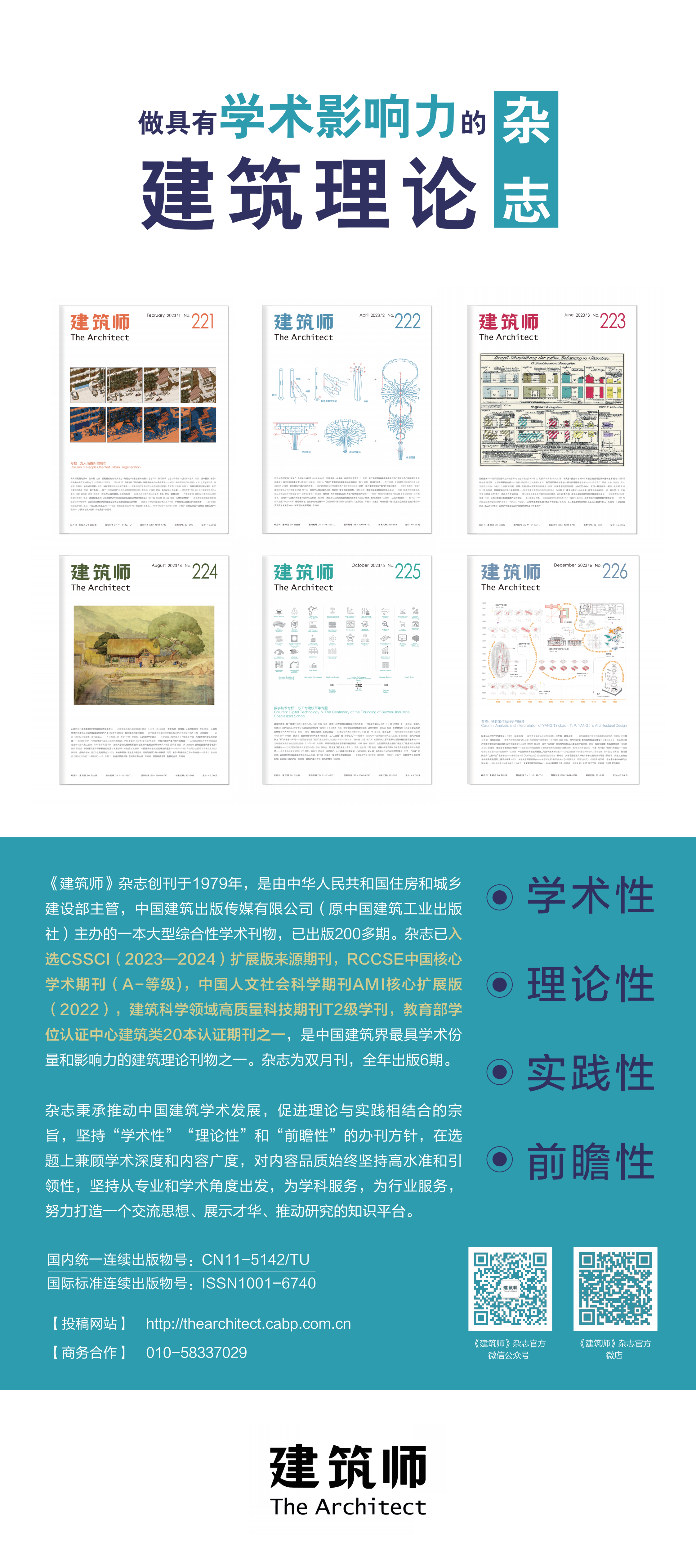 《建筑师》杂志创办于1979年,由住房和城乡建设部主管,中国建筑出版传媒有限公司(中国建筑工业出版社)主办,是一本大型综合性学术刊物,已出刊225期,刊载过大量具有学术价值和理论深度的文章。杂志记录了中国改革开放40多年来现当代中国建筑理论和历史的发展历程,见证和陪伴了几代建筑学人的成长,汇聚了大批专家、学者、建筑师以及建筑院校师生,成为中国建筑界最具学术影响力的理论刊物之一。
