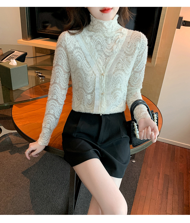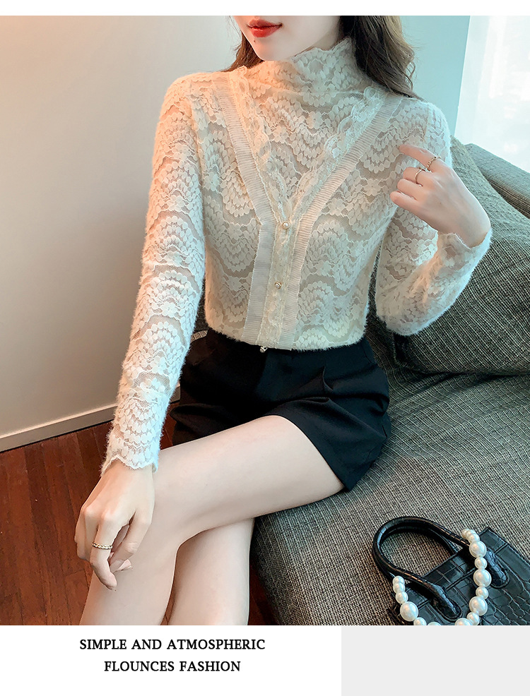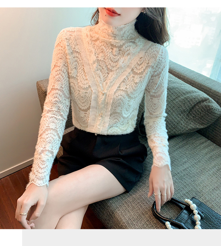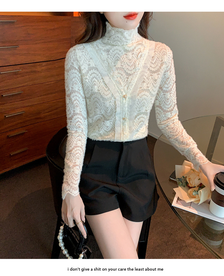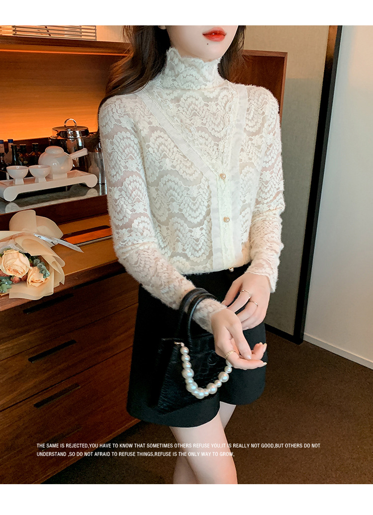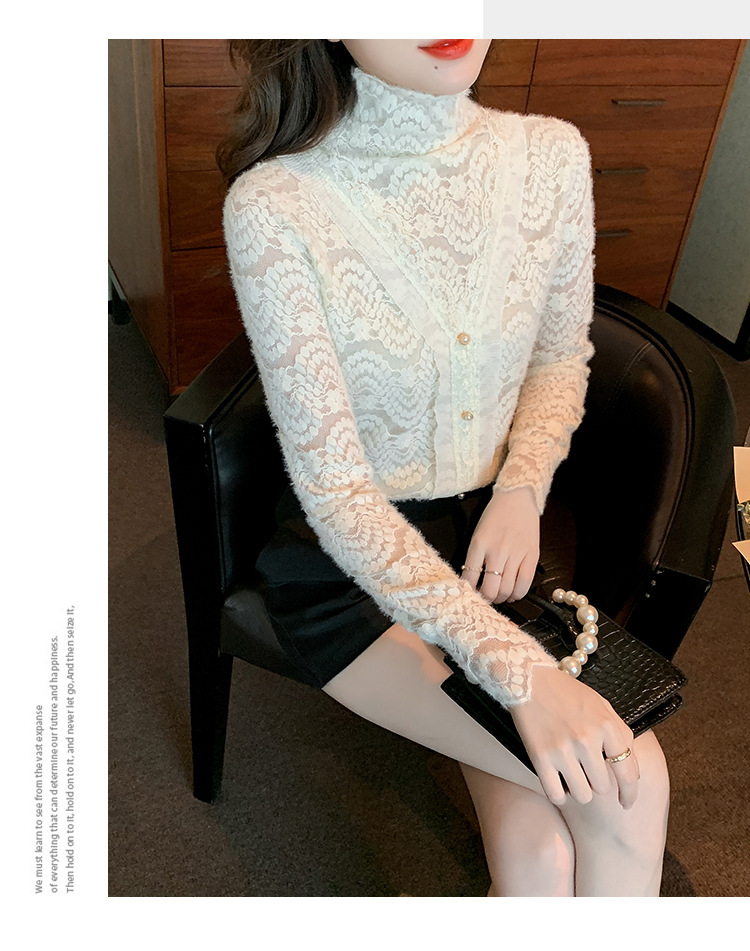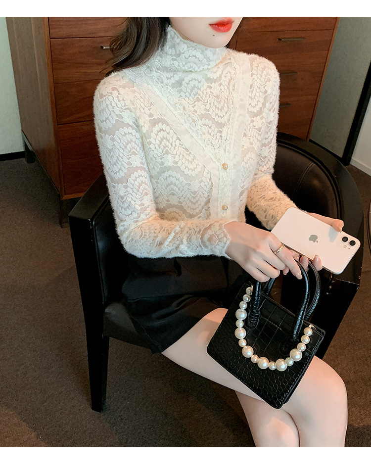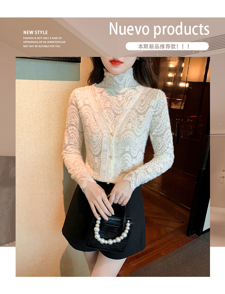 ZY-4194.292638秋冬新款修身显瘦磨毛蕾丝衫百搭半高领打底内搭长袖上衣女