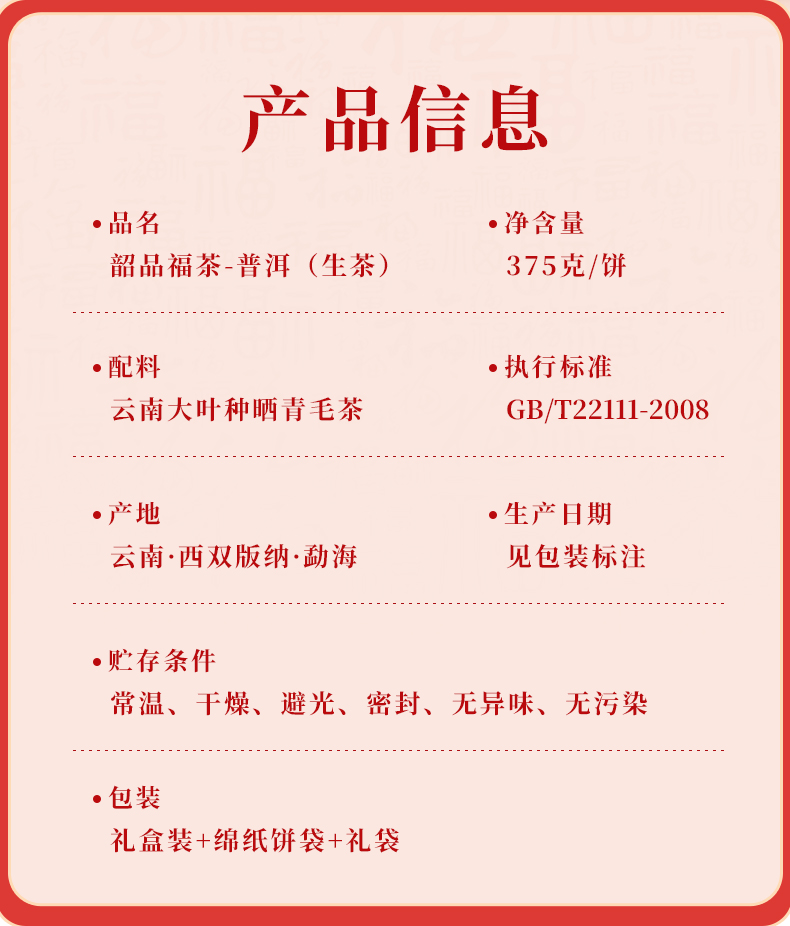 韶品福茶-普洱生茶,“福”气茶礼带回家!南西双版纳·勐海孕育的大叶种晒青普洱,传统手工压饼,蕴藏时光风味。 福茶赠福人,好礼传好运