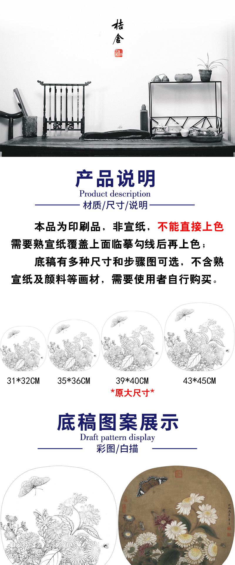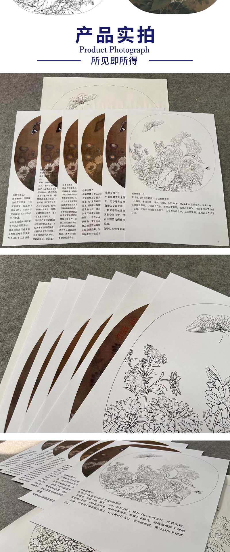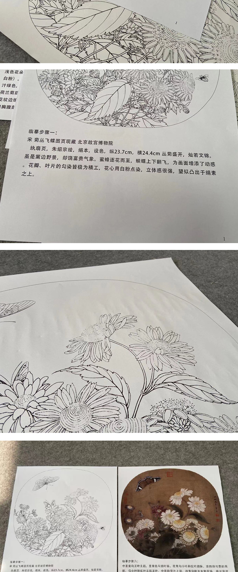 【有步骤、大彩图】李晓明工笔画白描底稿圆形小品《临宋菊丛飞蝶图》菊花蝴蝶初学者临摹花鸟线稿KC05