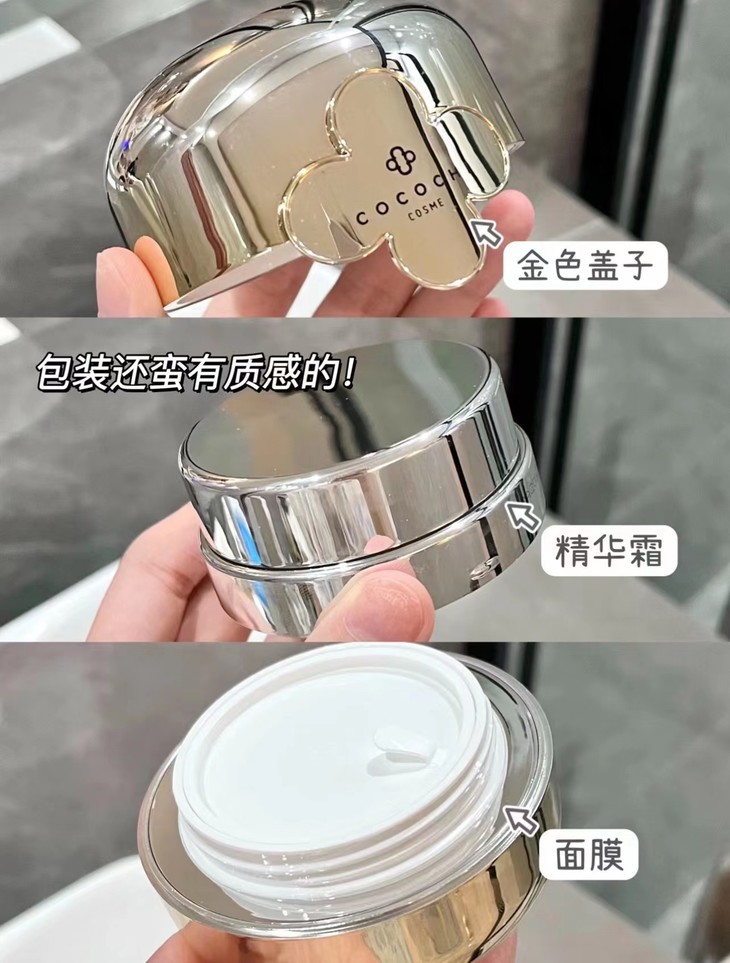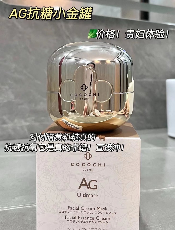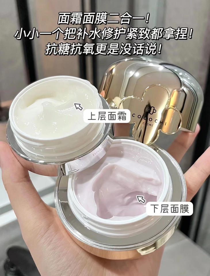 👑Cocochi AG抗糖小金罐面膜110g 👍面霜+面膜二合一,设计!让你一瓶赚大发 ✨蕴含:抗糖成分+晚樱提取物+富勒烯Orimos+抑制糖化物Ages 💎主打:熬夜急救、祛黄提亮、抗糖抗氧化 🔥上层面霜+下层面膜组合,先涂面霜,后涂面膜 👉面霜:与果冻质地一样,特别清爽。 👉面膜:类似奶油一样,软乎乎 💧用后:皮肤嫩滑,喝饱水,嫩滑肉眼可见好状态 😁抗氧提亮,从源头改善肤质,一瓶搞定!