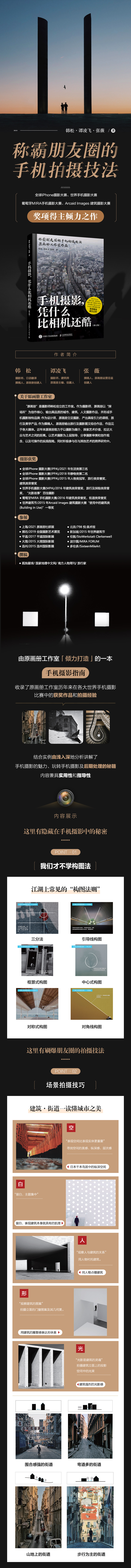 韩松 摄影师,日语翻译,撰稿人,原画册创办者。 谭凌飞 摄影师,建筑师,原画册主编、创办者。 张薇 撰稿人,原画册运营总监、创办者。 关于原画册工作室 “原画册”是摄影师韩松创立的工作室。作为摄影师,原画册以“探场所”为创作核心,输出具品质的城市、建筑、人文摄影作品,并形成手机摄影独特品牌; 作为设计师,原画册立足摄影,产出具吸引力的课程、旅行及美学产品; 作为撰稿人,原画册输出旅行及摄影图文综合作品,作品见于各大媒体。近年来原画册致力于以摄影为媒介,探索艺术价值,拉近大众与艺术之间的距离。以艺术摄影为上层指导,分享摄影审美和创作观念,以及可操作的实践指南。同时积极参与在与其他艺术的跨界研究中。 摄影获奖 ● 全球iPhone 摄影大赛(IPPA)/202* 年生活类第三名 ● 全球iPhone 摄影大赛(IPPA)/20*8 年静物类*名 ● 全球iPhone 摄影大赛(IPPA)/20*5 年人物类*,旅行类荣誉奖,建筑类荣誉奖 ● 世界手机摄影大赛(MPA)/20*6 年建筑类荣誉奖,旅行及探险类荣誉奖,“光影故事”百佳摄影 ● 葡萄牙MIRA 手机摄影大赛/20*6 年建筑类荣誉奖,街道类荣誉奖 ● 世界建筑节/20*5 年Arcaid Images 建筑摄影大赛“使用中的建筑类(Building in Use)”一等奖 参展 ● 上海/202* 原画册社群展 ● 潍坊/20*9 *摄影艺术展览 ● 平遥/20*7 平遥国际影展 ● 大理/20*5 大理国际影展 ● 连州/20*5 连州国际影展 ● 北京/798 悦·美术馆 ● 新加坡/20*5 年世界建筑节 ● 伦敦/StoWerkstatt Clerkenwell ● 波尔图/MIRA FORUM ● 多伦多/SixteenMileArt 撰稿 ● 孤独星球/ 国家地理中文网/ 南方人物周刊/ 旅行家
