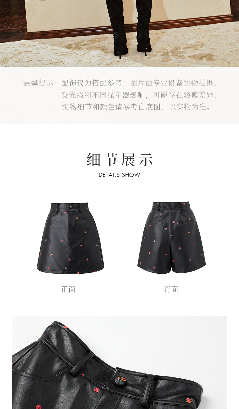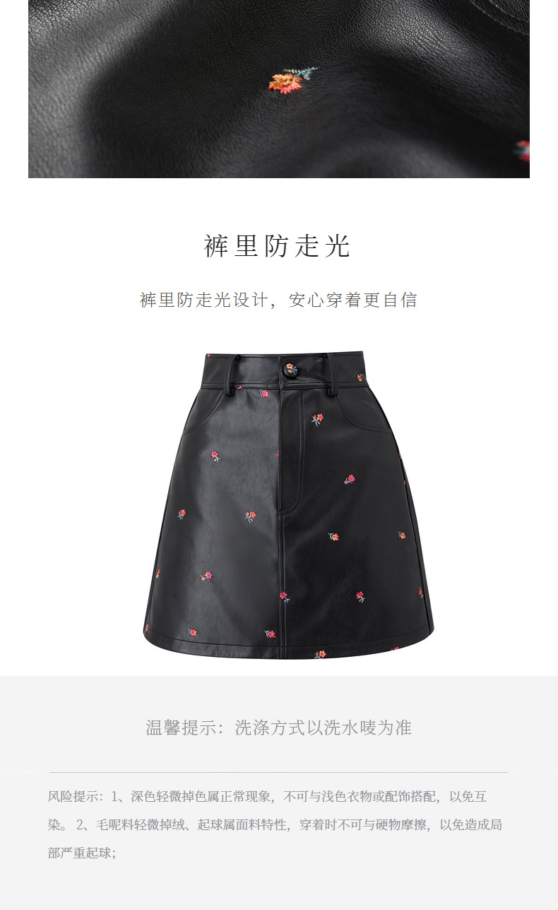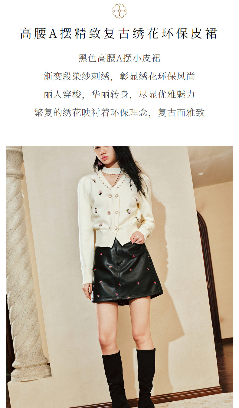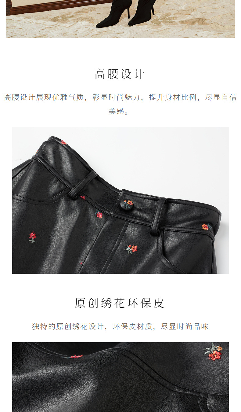 MAXRIENY【商场同款】精致复古绣花环保皮半裙冬款高腰A摆裤裙(货号:MC88PA804)