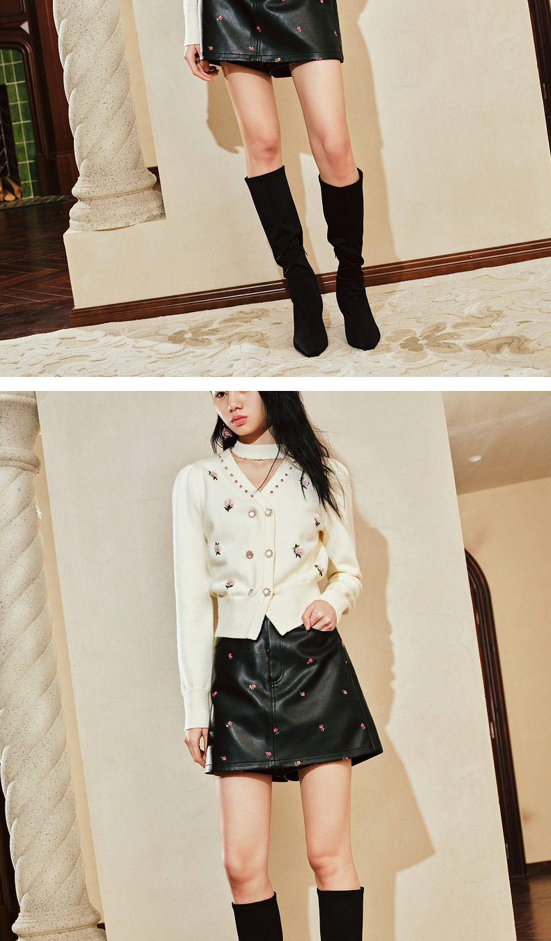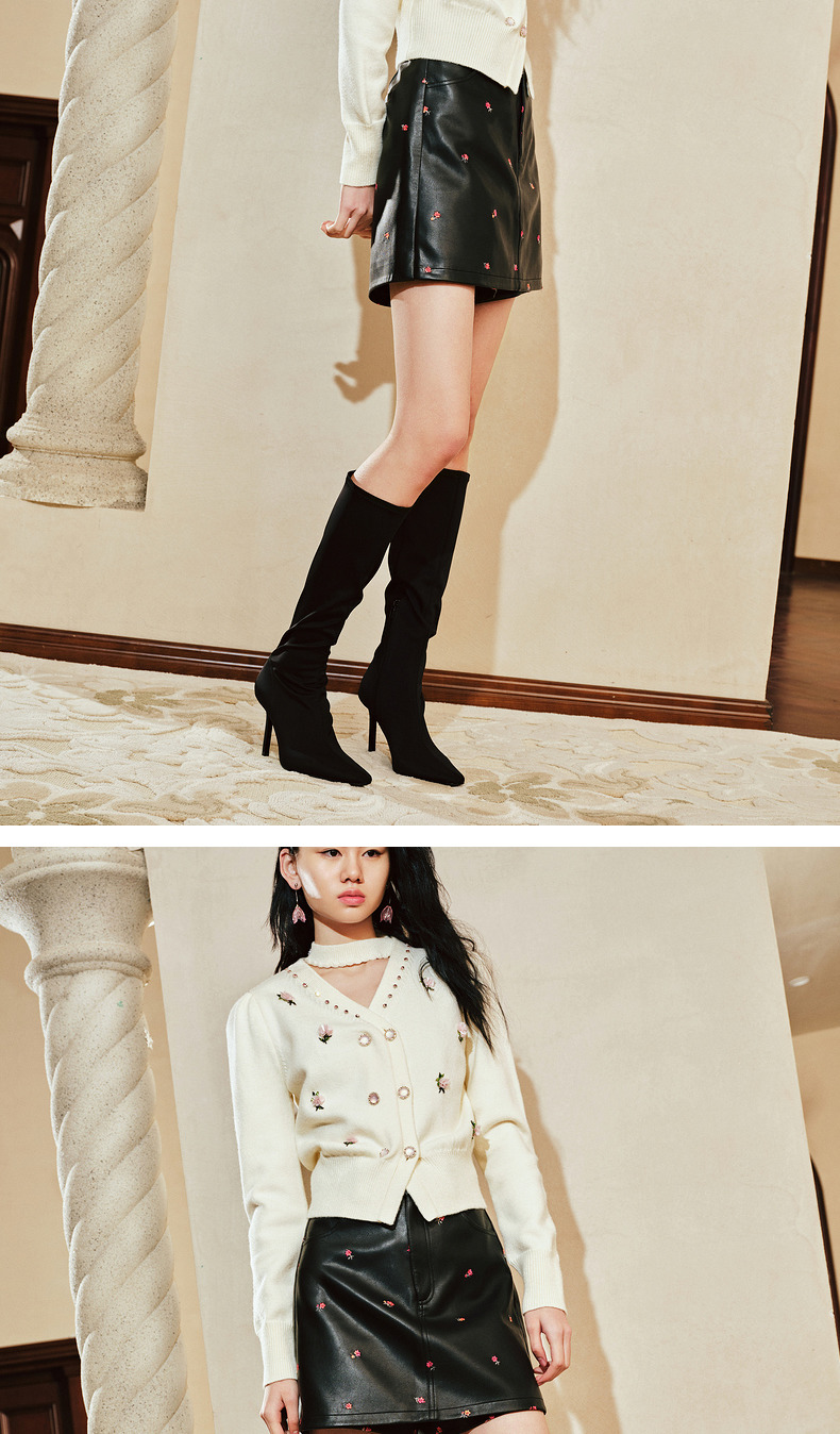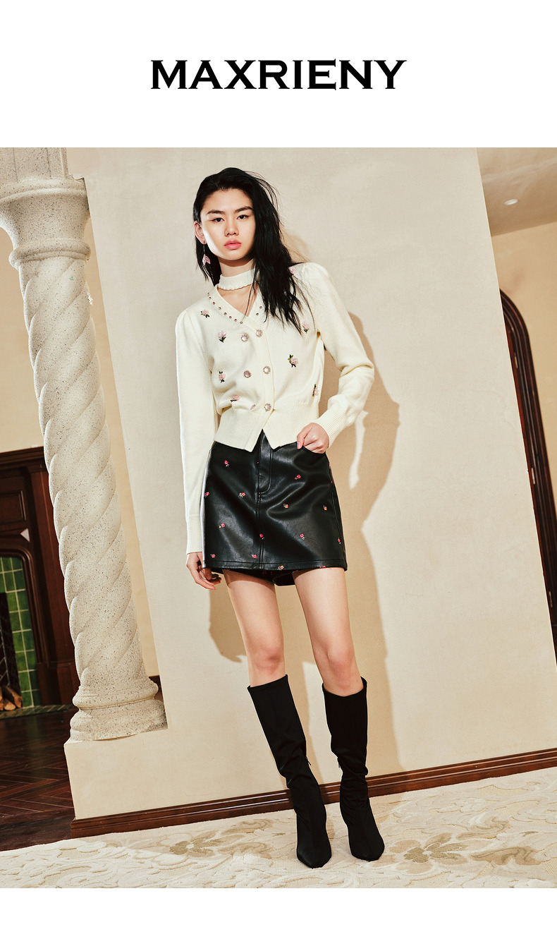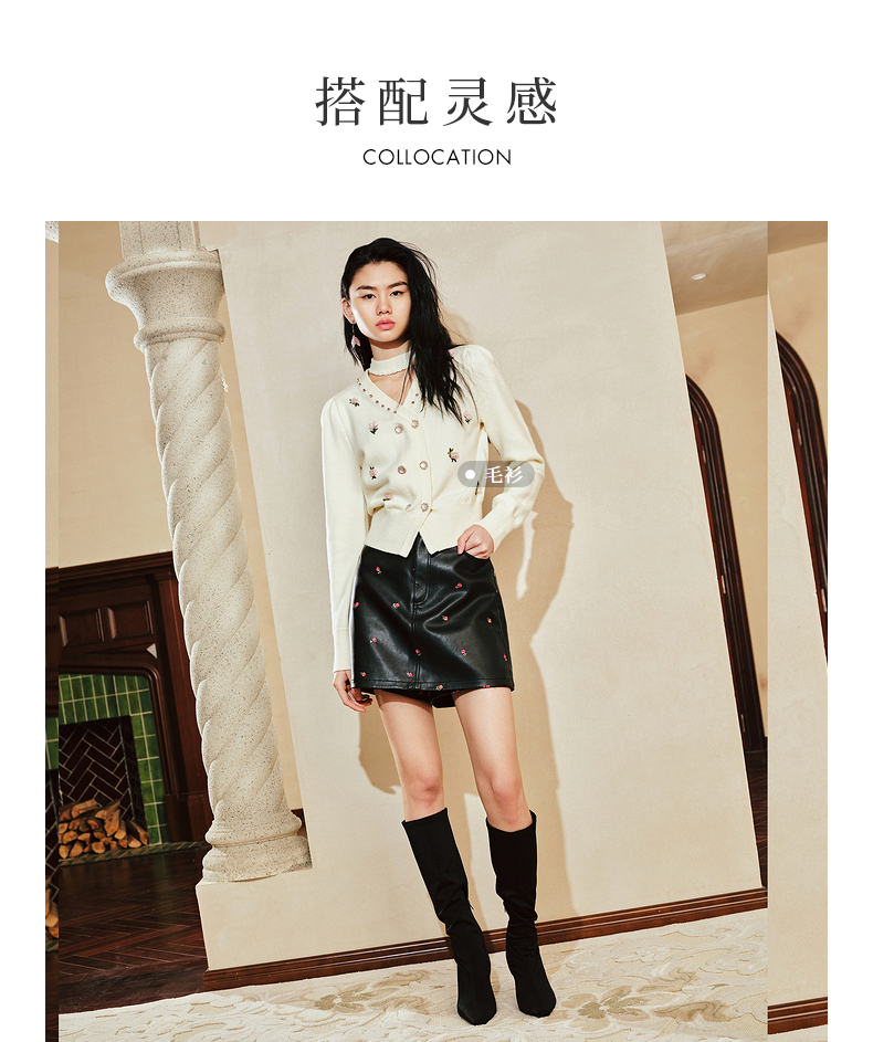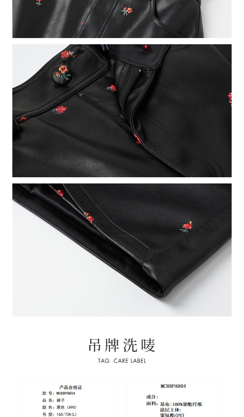 MAXRIENY【商场同款】精致复古绣花环保皮半裙冬款高腰A摆裤裙(货号:MC88PA804)