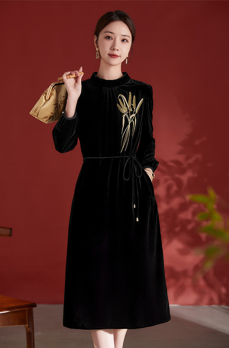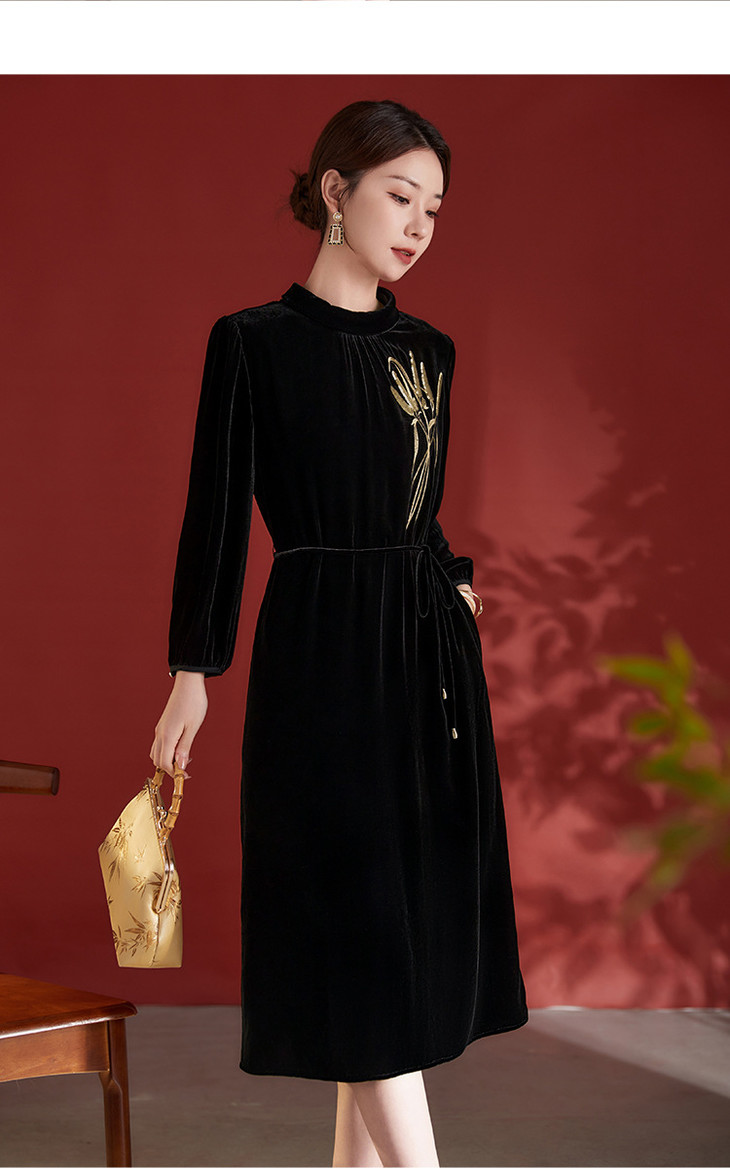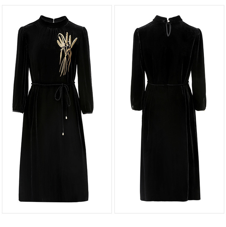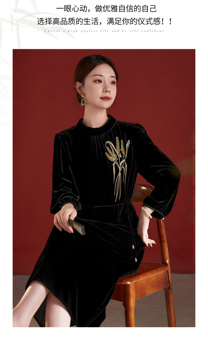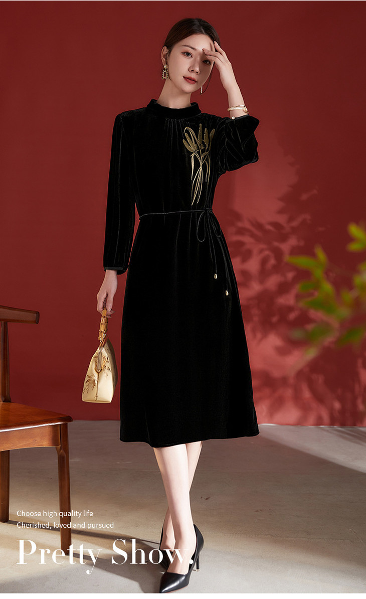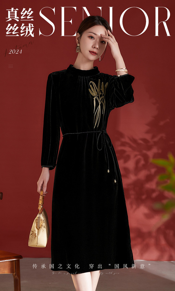 高端真丝丝绒连衣裙,黑色立领刺绣系带桑蚕丝中长裙SM