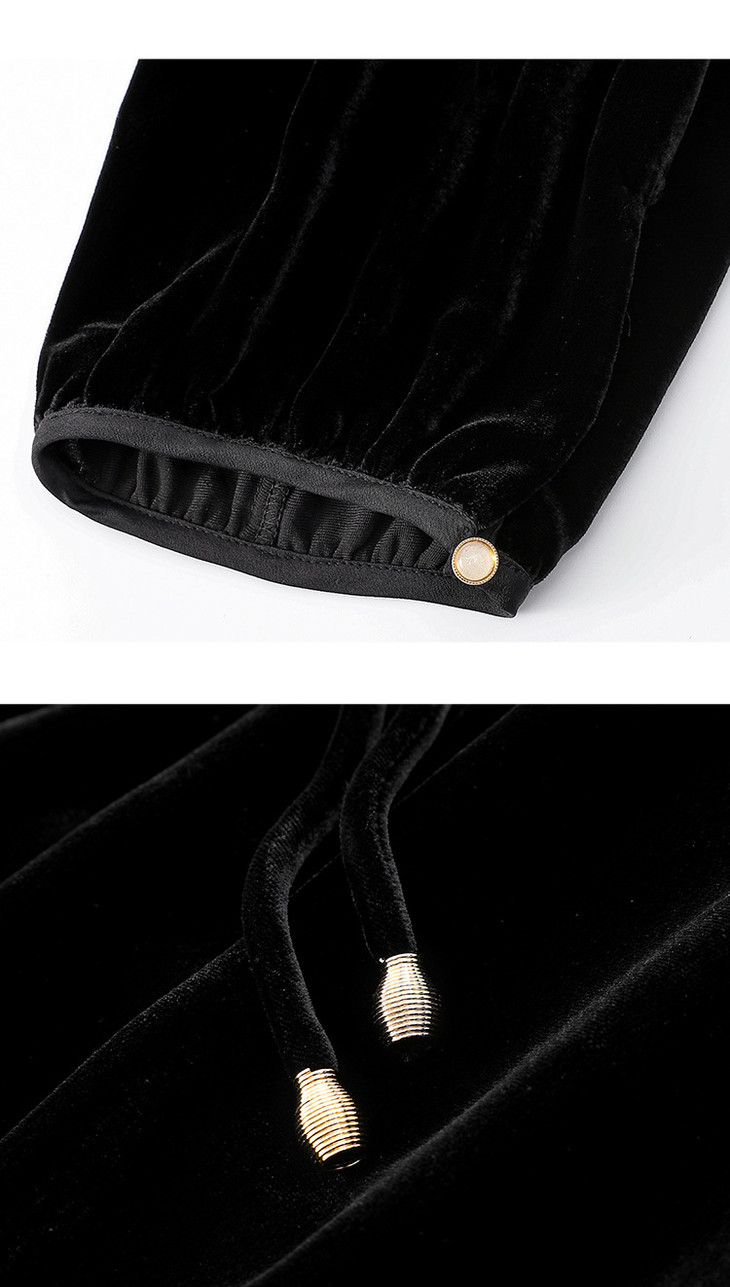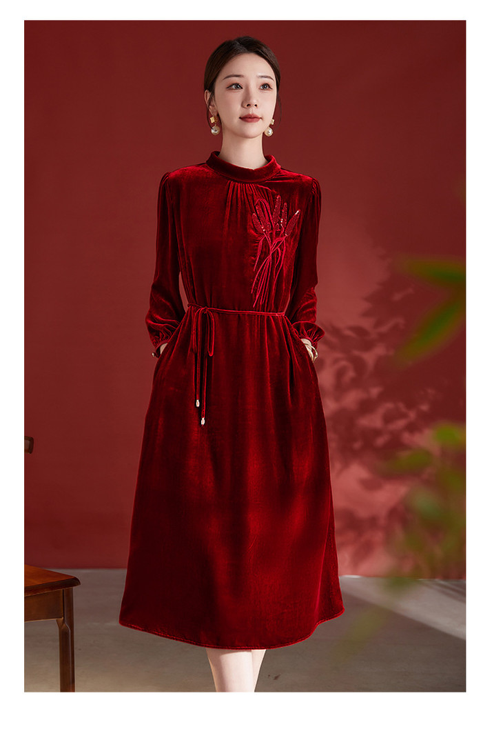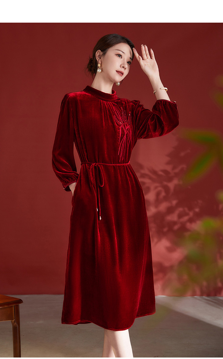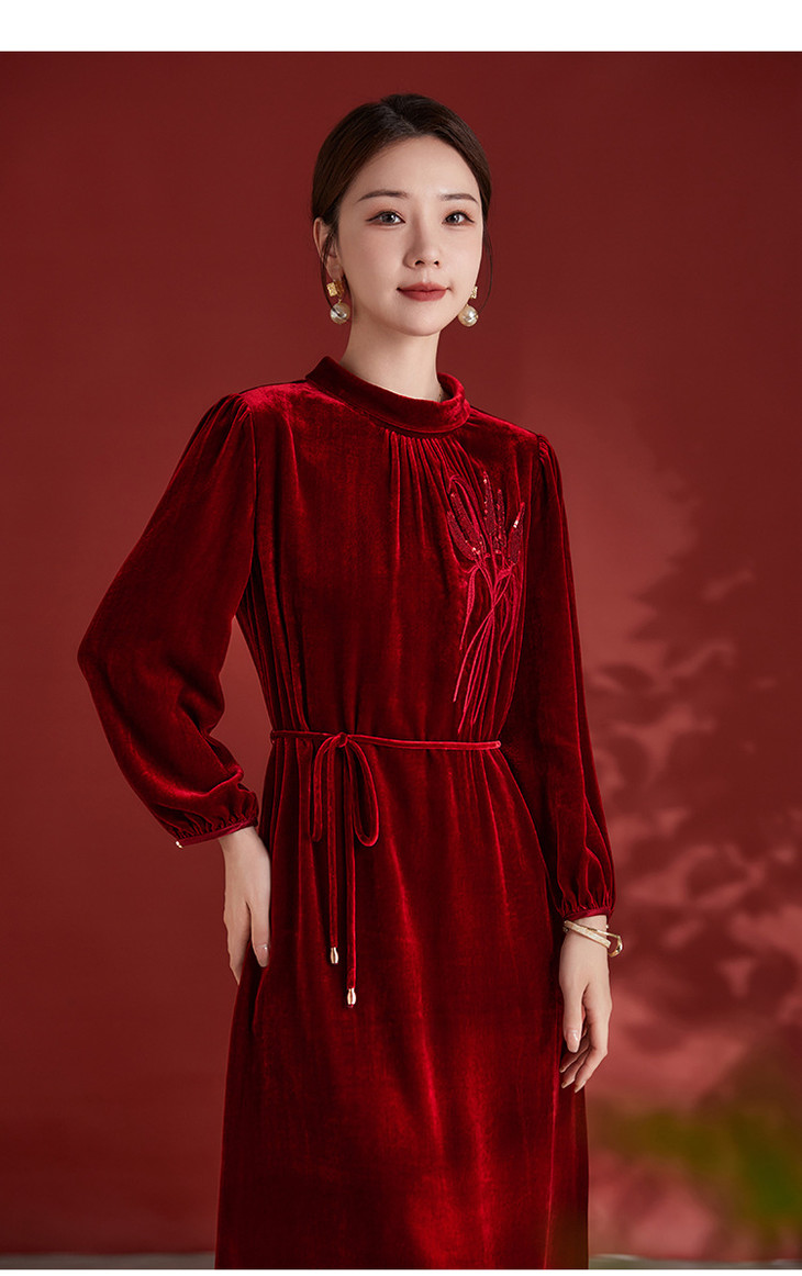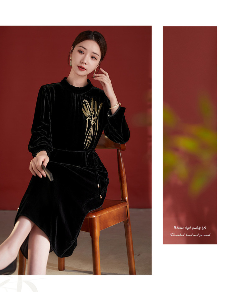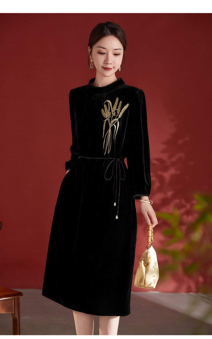 高端真丝丝绒连衣裙,黑色立领刺绣系带桑蚕丝中长裙SM