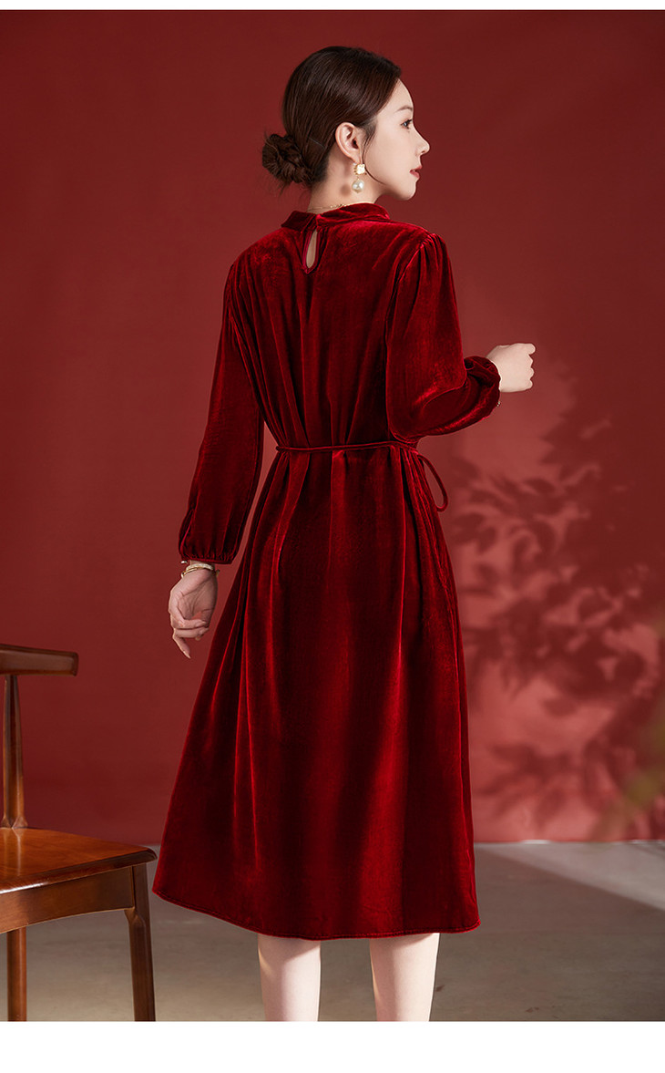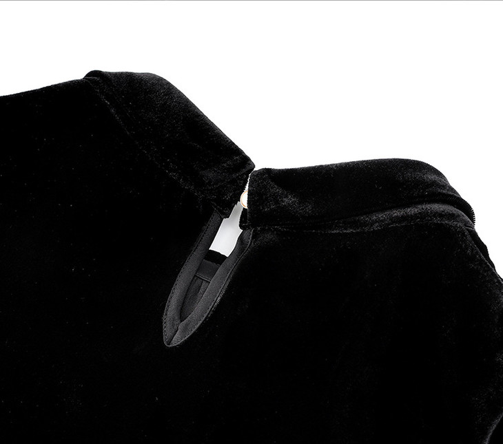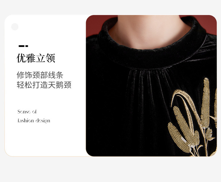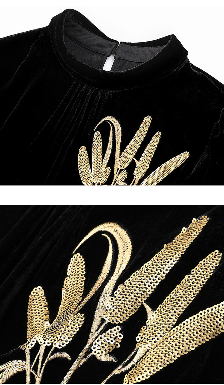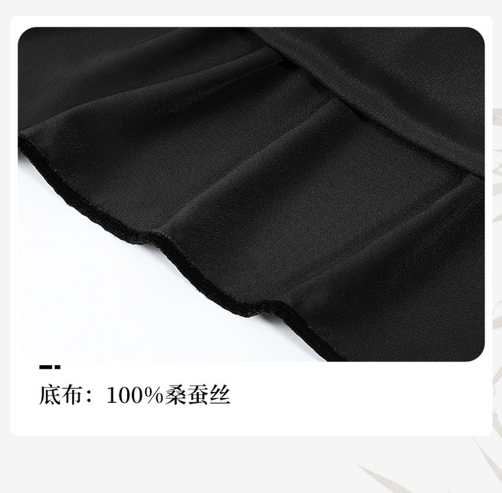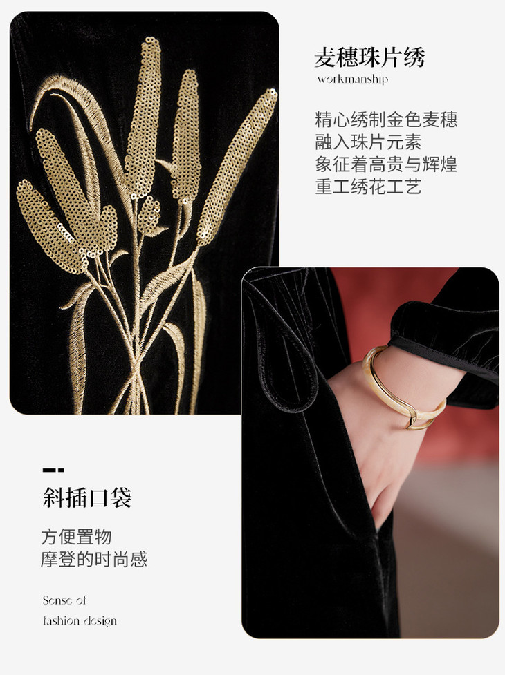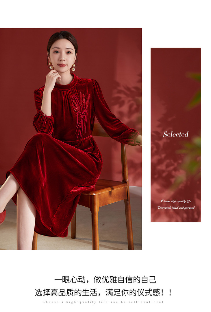 高端真丝丝绒连衣裙,黑色立领刺绣系带桑蚕丝中长裙SM