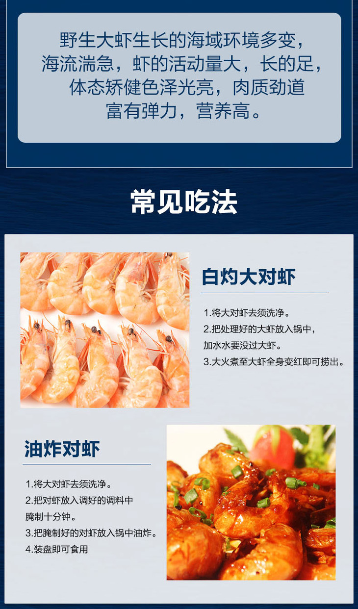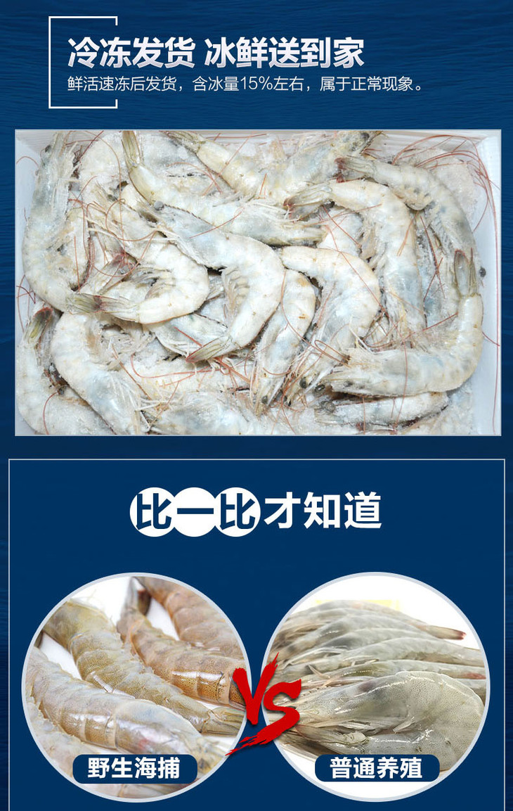 【发货地】山东青岛 【产品亮点】盐冻大虾,新鲜 【生产日期】一周内捕捞 【保质期】冷冻保存24个月 【理赔时效】签收后6小时 【储存条件】冷冻保存 【快递】顺丰 【不发货地区】新疆/西藏/海南/云南不发货,黑龙江/甘肃/青海发京东快递,(个别偏远地区发不了的以出单为准) 【发货时效】48小时 【售后注意事项】: 1、解冻不代表不新鲜不作为售后依据!虾变质掉头、身体变红(虾的胃在虾的头部,有虾黄虾膏,变红属于正常),虾脚变黑! 2、虾品种海域不同,捕捞季节不同,虾的颜色会不同,并且有的虾尾和虾脚发红(自然红)属于正常现象! 3、虾解冻后有的有白色斑点,是因为水分蒸发海水盐的成分形成的盐斑 【售后理赔标准】 1、官网签收6小时内申请售后,必须有外包装图片,损坏的商品与面单拍合照!因为客户原因无法收取或者拒收一律不予赔付(包括客户电话关机、电话停机、电话无人接听,客户更改派送时间、更改派送地址、客户同意放在门卫或者快递柜没有及时取件等) 2、严重损坏的按照个数(斤数)赔付,如掉头 虾身断裂等,轻微磕碰或个人口感问题不予赔付; 3、生鲜类,发出后不退不换,不以个人喜好、口味处理售后,不支持七天无理由退换货; 4、机器筛选个头无法完全一样,虾大虾小只数在大致范围内不予赔付; 5、以下规格是行业标准,一盒虾净重3.3-3.4斤,可自行计算一盒的只数。在此上下浮动10条内不售后,超了的适当按规格补差价; 6、干冰是固体二氧化碳,零下78度,是通过固态挥发气态保持温度的,干冰到了客户手里就会变成气体,干冰袋子会变成空袋子,这是正常现象,不是冰袋化成水流到商品上了; 7、不以化冻为理赔依据,有冰袋保护,即使化冻也不会坏,除非时效太久或者很热的地区; 8、海虾本来就会有腥臭味,海产品自带的,请与河虾区别对待; 9、超出顺丰配送范围,转寄中出现问题,或者派送不及时地区,如:偏僻乡、镇、村等慎拍,若有问题不售后。
