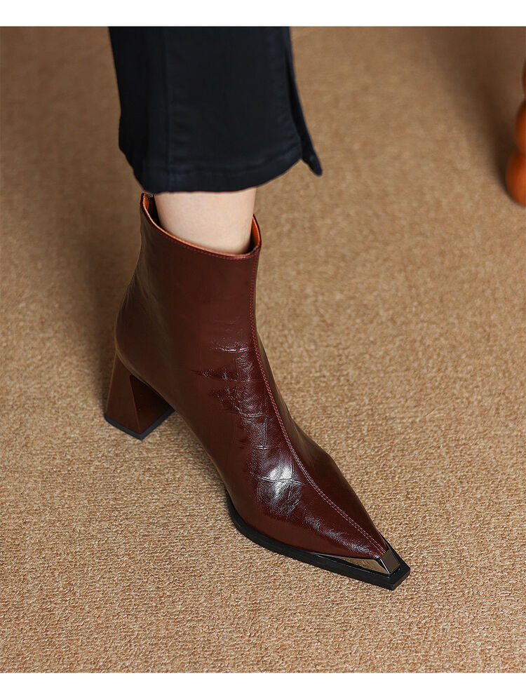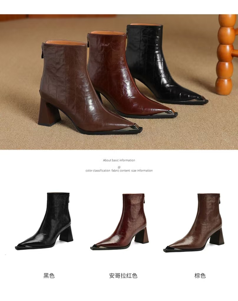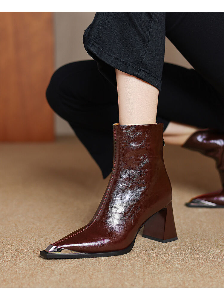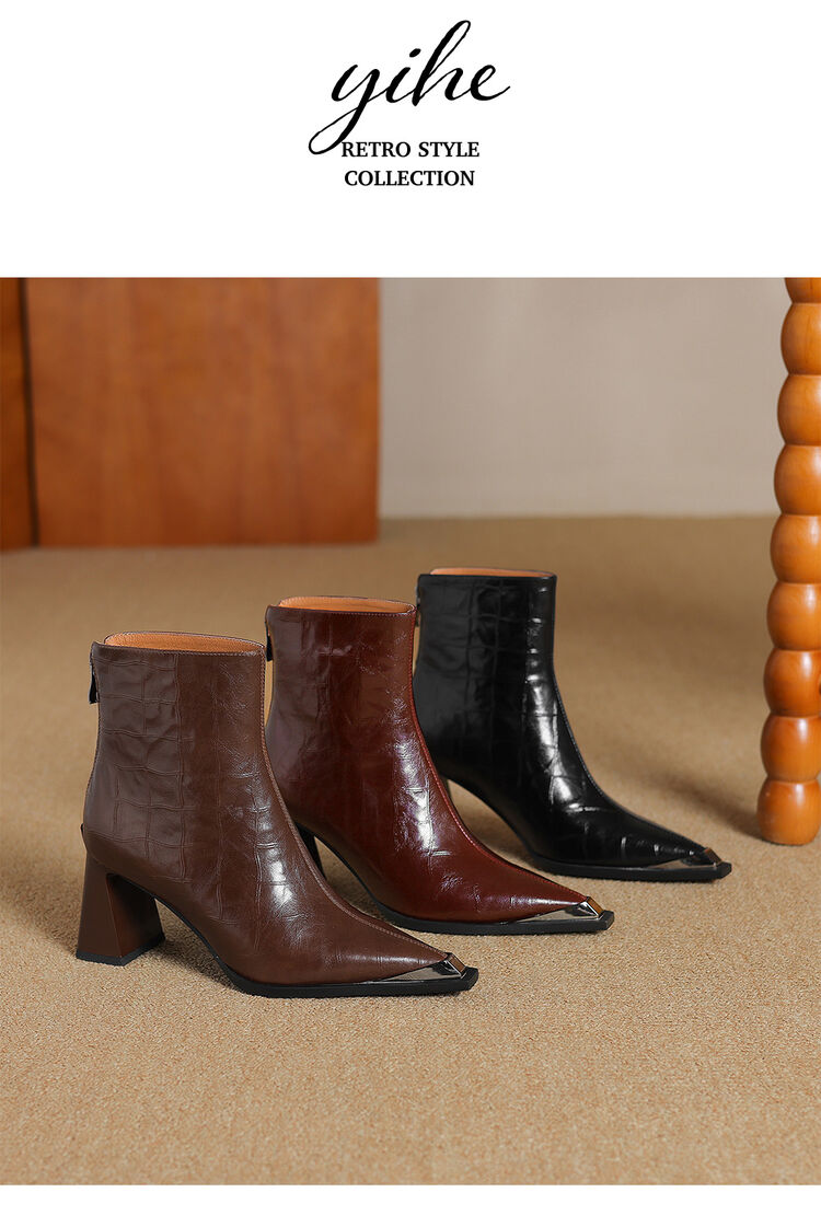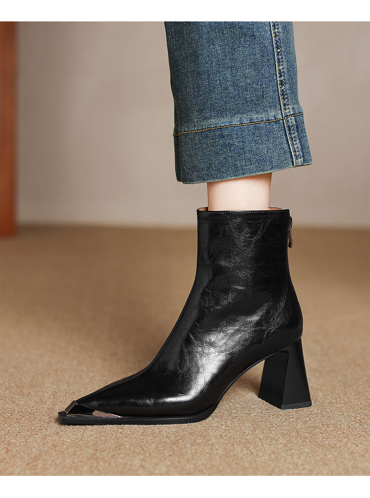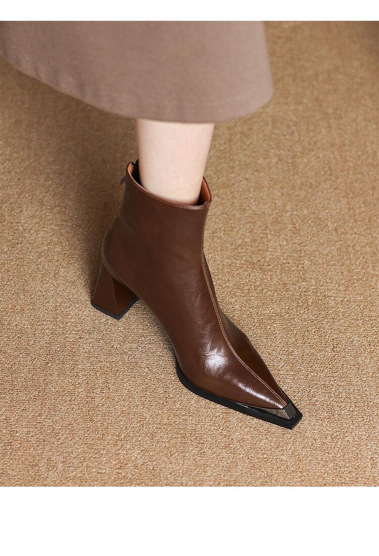 【预售5天】法式复古金属尖头粗跟气质时尚短靴女新款秋冬真皮显瘦马丁靴SLLK&sl-7828