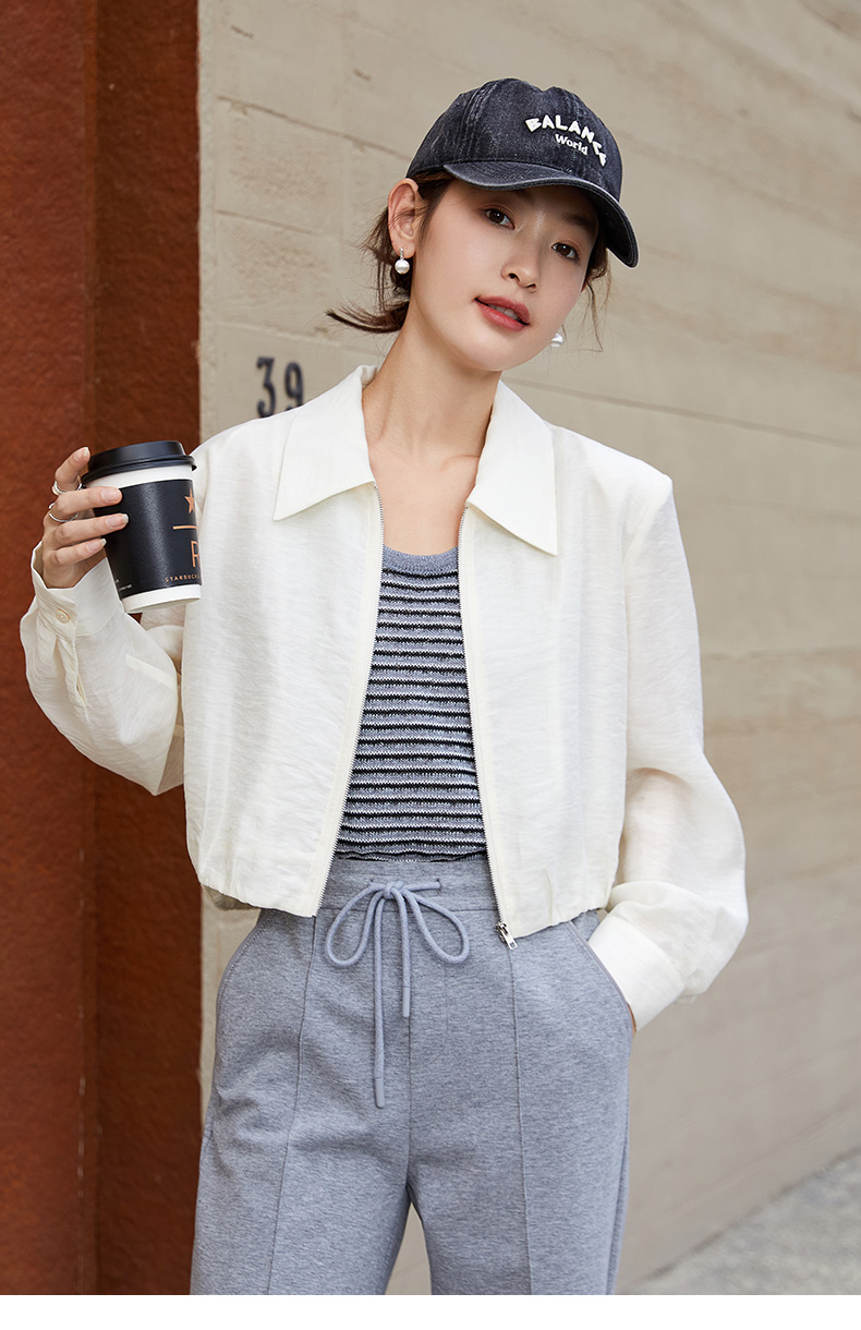 奶杏色连帽短外套女 春秋款宽松显瘦拉链上衣 肌理感休闲夹克