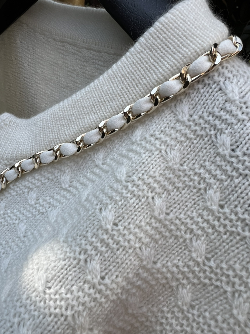 手工皮穿链条,御用山羊皮,饰品级别的链条,咱们以往单独买个皮穿链条的链子,也要千把块吧,喏,百分百双股25支纯山羊绒,加上如此繁复手工皮穿链条,拿到手里还是略有份量的羊绒开衫,价格美cry。。。。