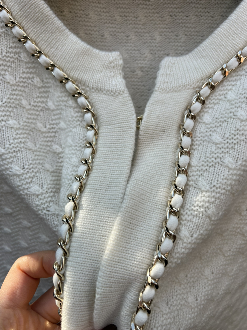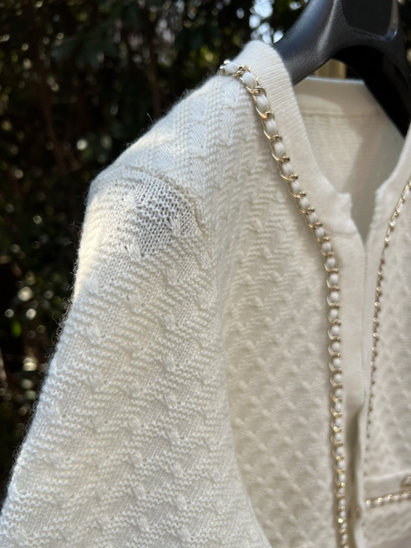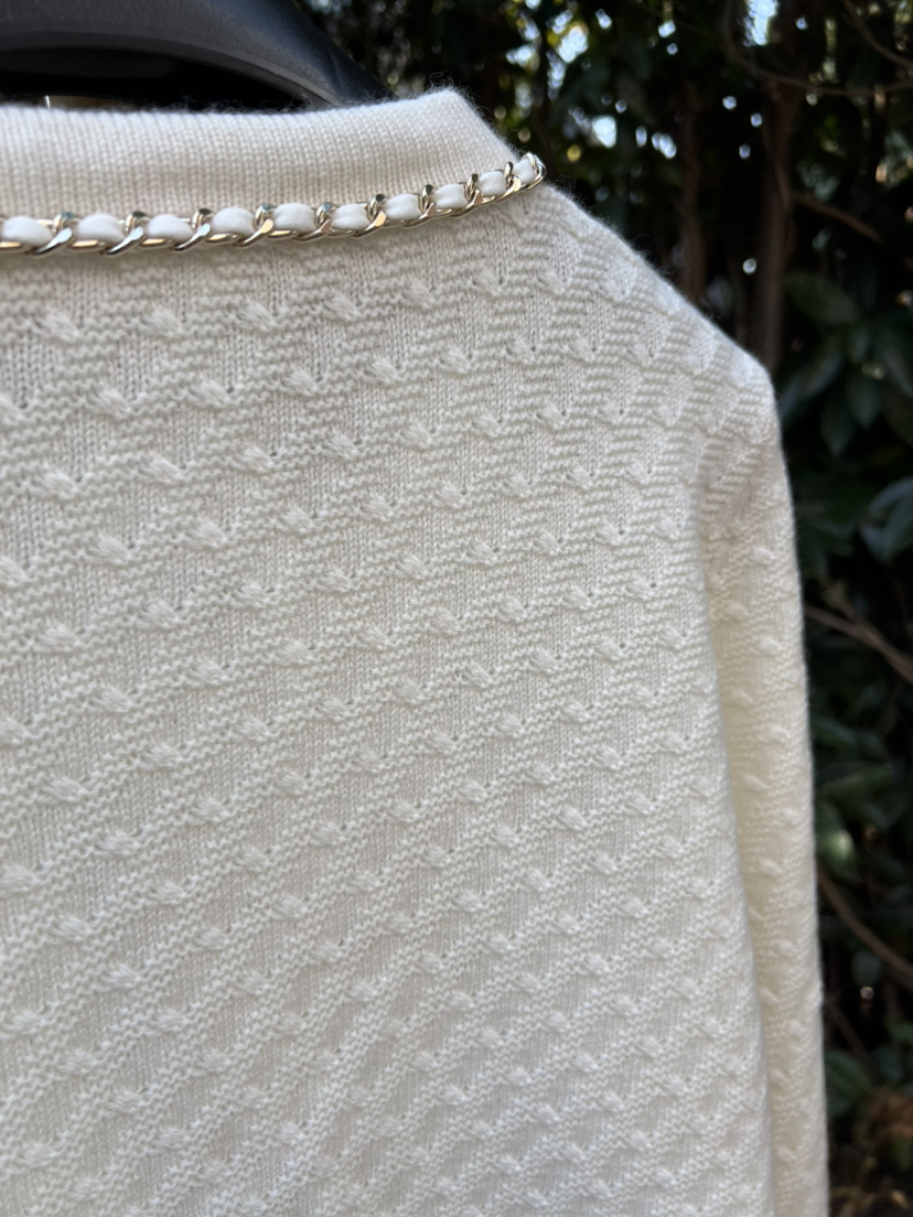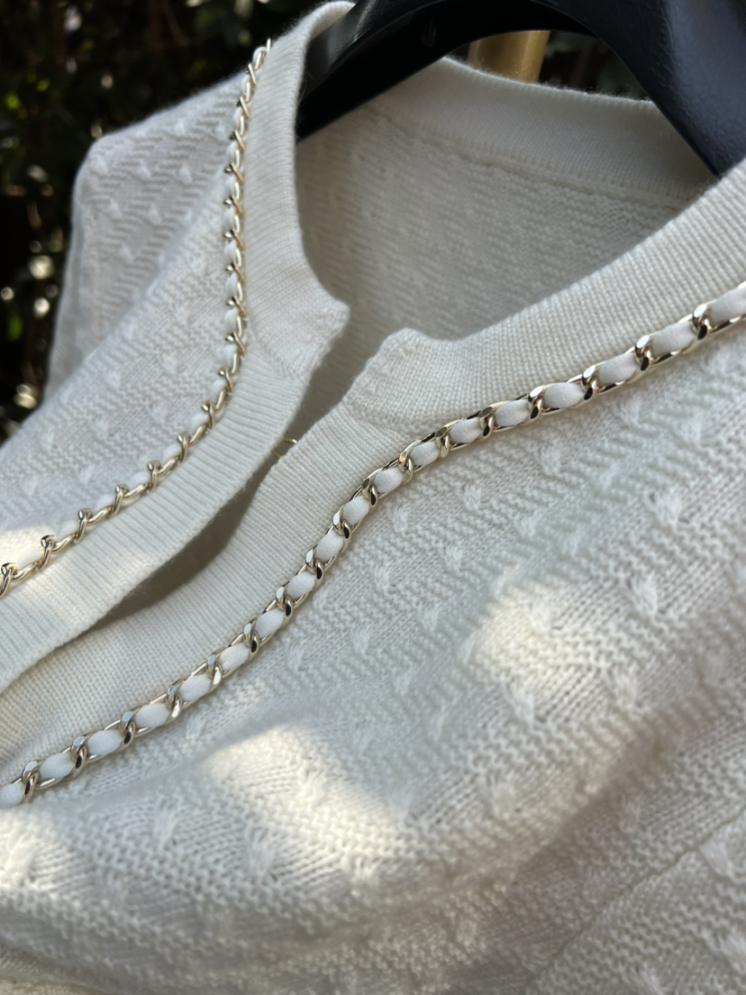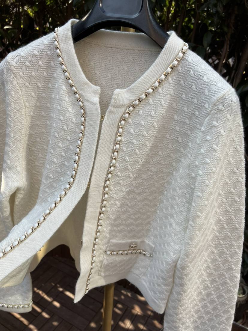 手工金链缎面羊绒开衫,年底重磅,绝对的福利了,用最最最顶的重磅爆款来做福利,有条件的贵妇们千金们,两色入吧。码数很准很足。胖瓜167-138穿XL很合适,你们准码选择即可。