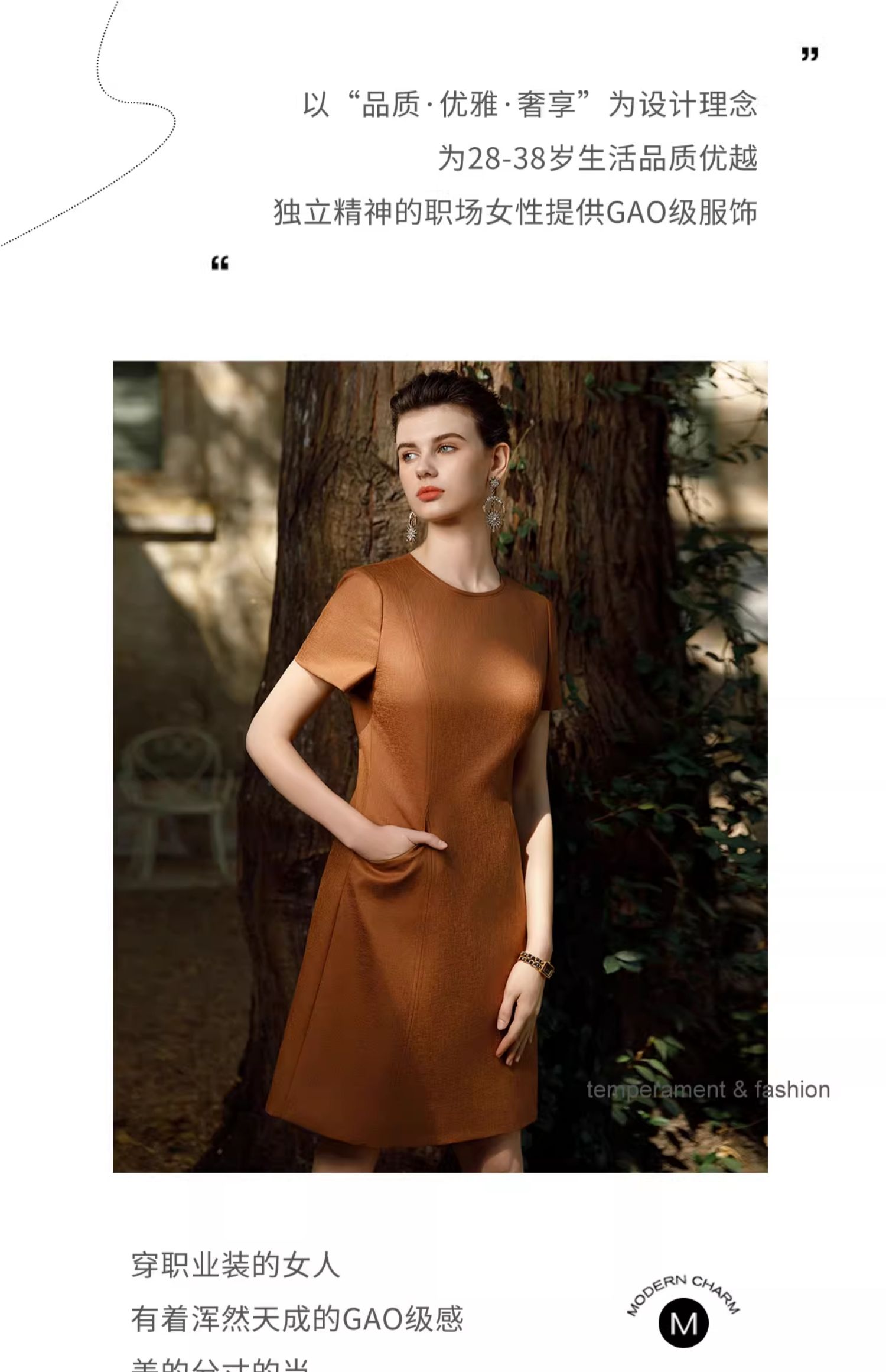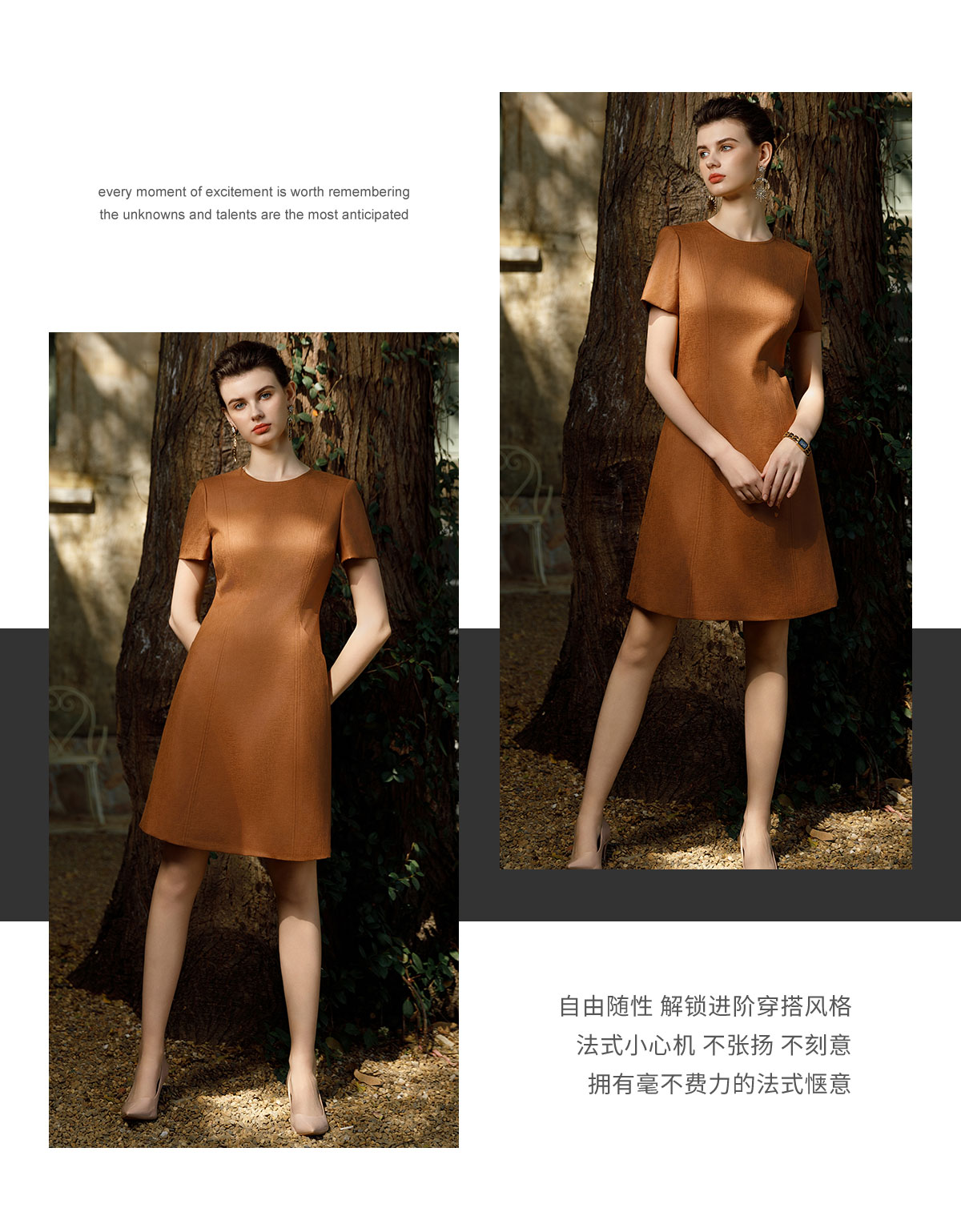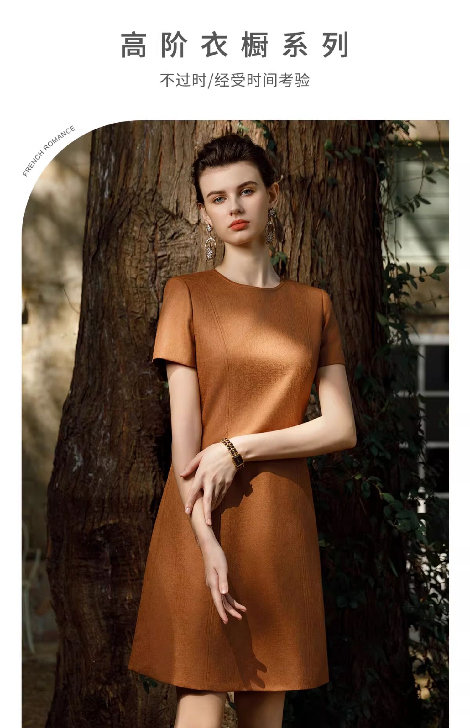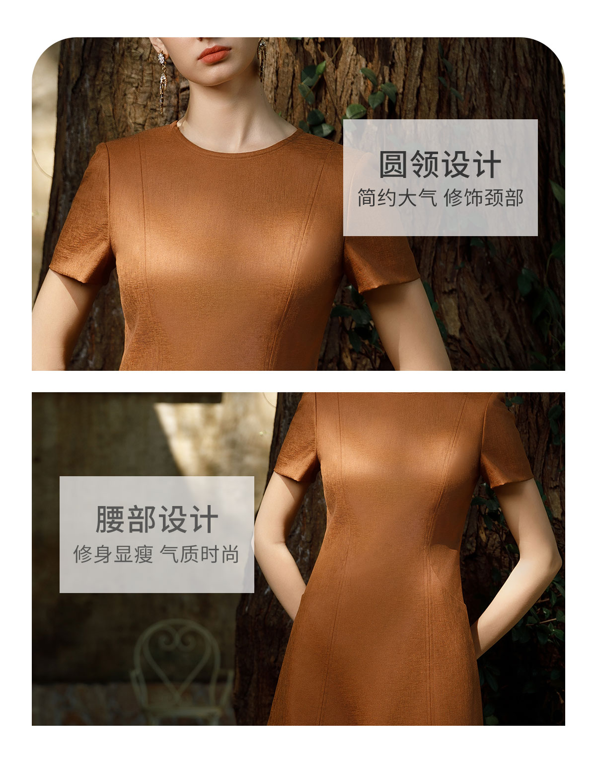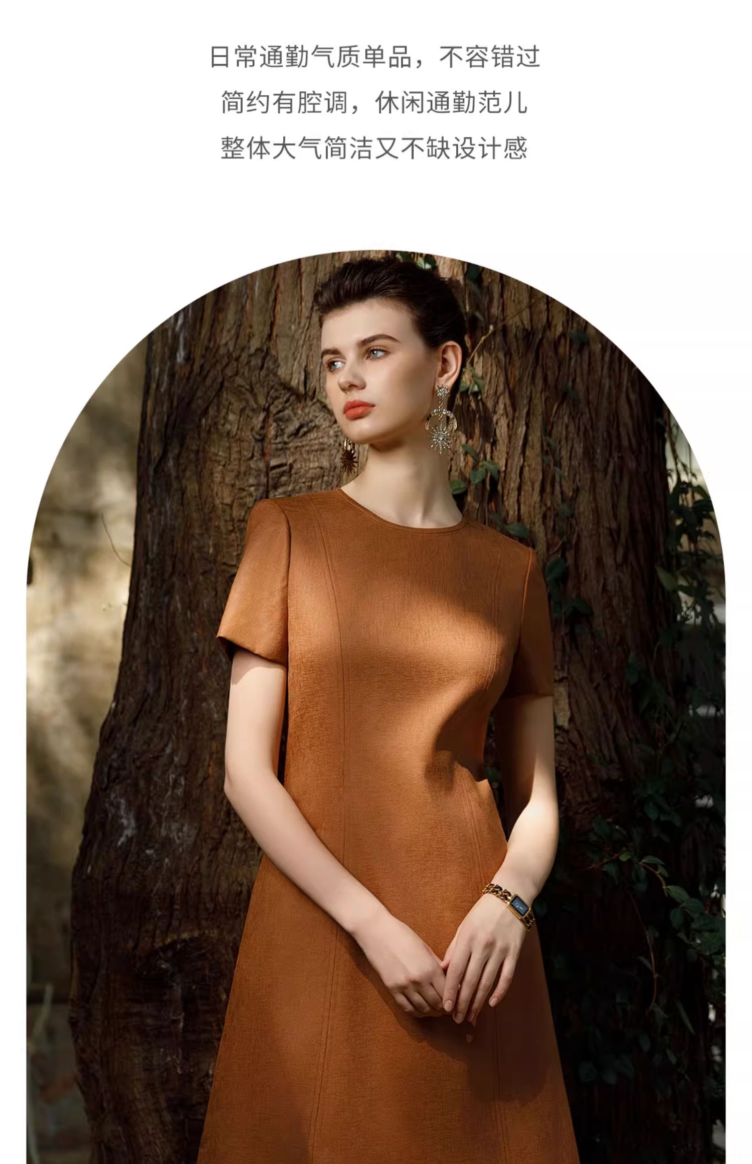 IWY/卡其色收腰连衣裙女夏季圆领短袖长裙气质法式通勤正装Q1061