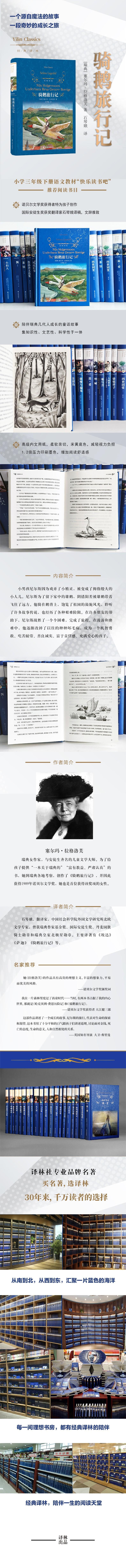 《骑鹅旅行记》是诺贝尔文学奖获得者塞尔玛·拉格洛芙为孩子创作的“一本关于瑞典的”“富有教益、严肃认真”的书。这本书通过小男孩尼尔斯骑鹅周游瑞典的故事,介绍了瑞典的风土人情,同时也讲述了男孩从顽劣、调皮,到收获周围人的信任和友爱的成长历程,这本书虽然是为儿童而作,却也让无数成人爱不释手。小学语文课本《快乐读书吧》也为孩子们推荐了《骑鹅旅行记》。本版《骑鹅旅行记》疏朗排版,由翻译家石琴娥翻译,文辞雅致,意蕴悠长。
