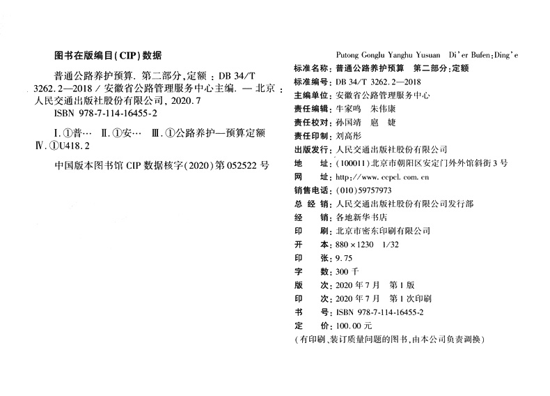 书名:普通公路养护预算 第二部分:定额(DB 34/T 3262.2—2018)