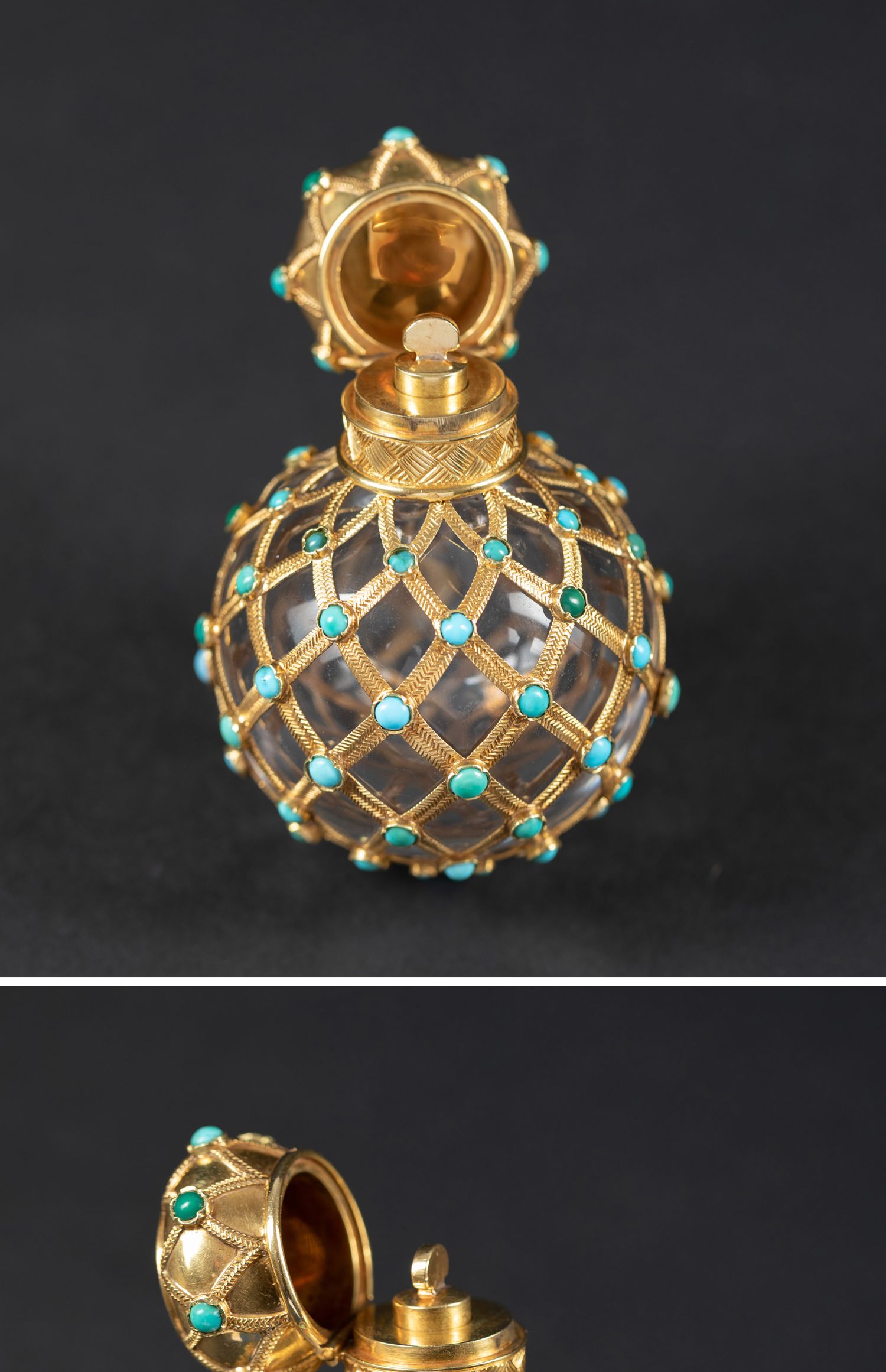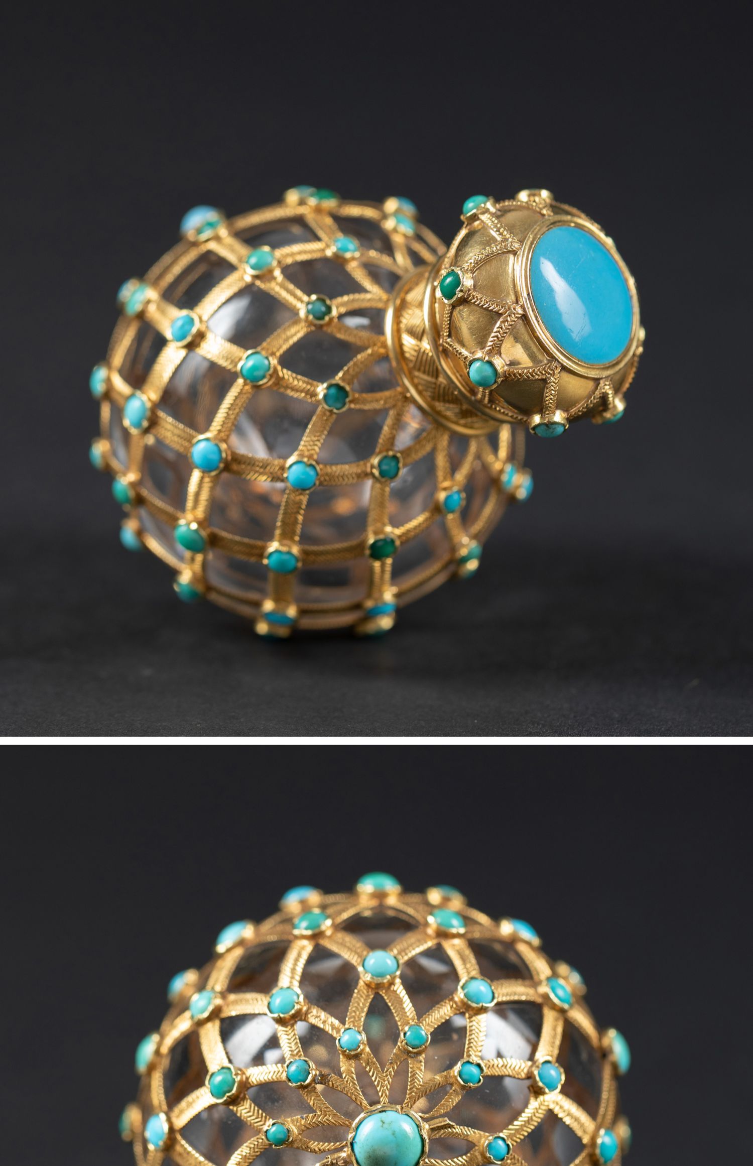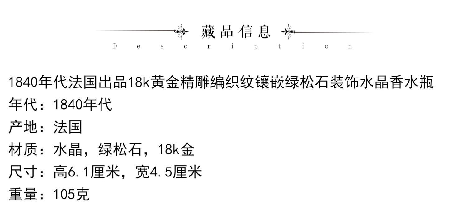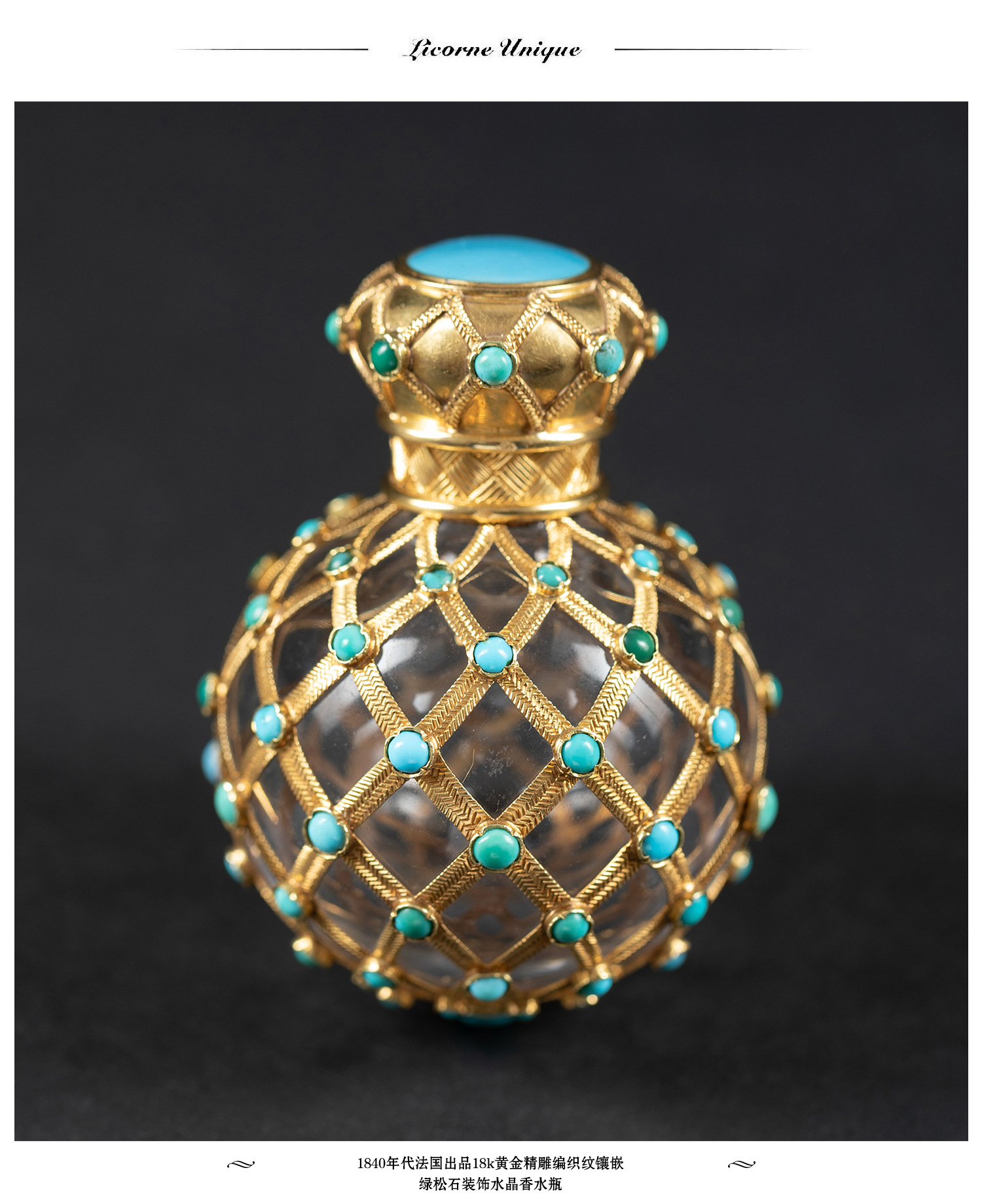 独角鹿西洋古董18k黄金精雕编织纹镶嵌绿松石装饰水晶香水瓶