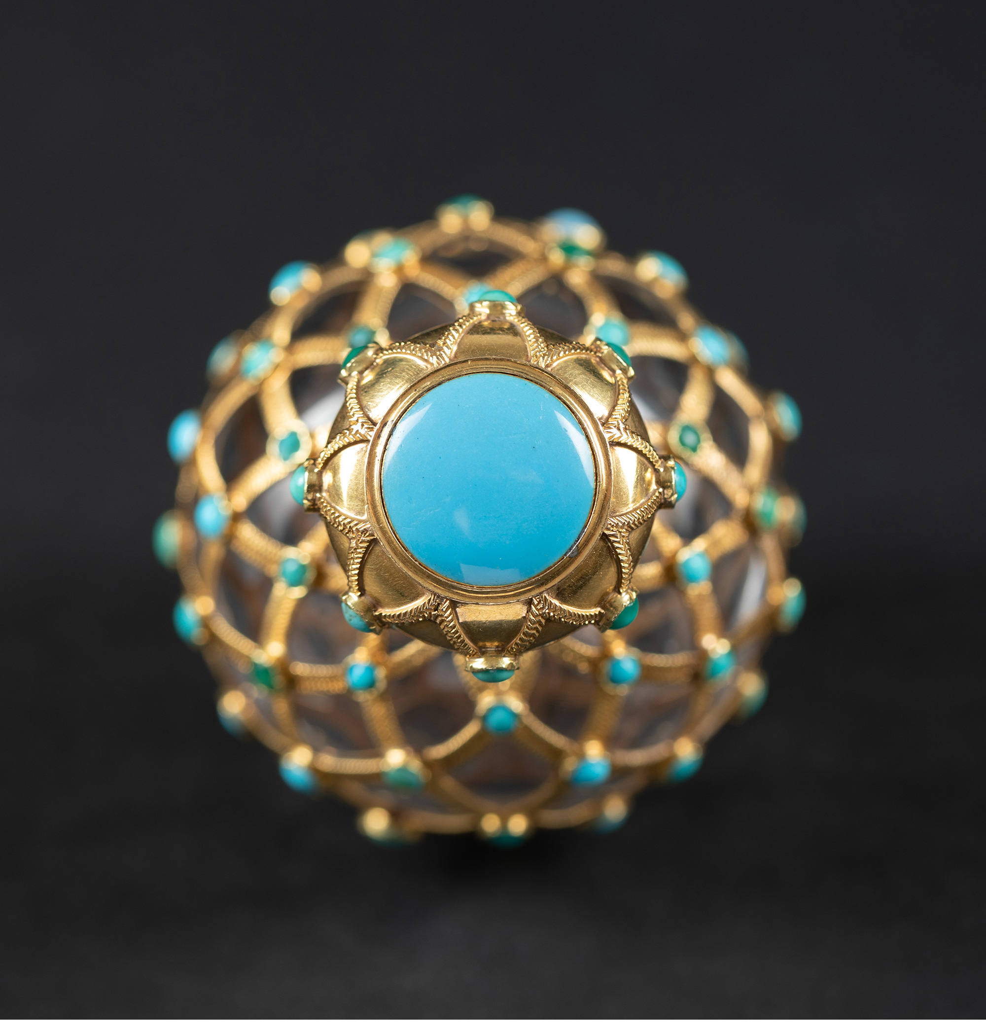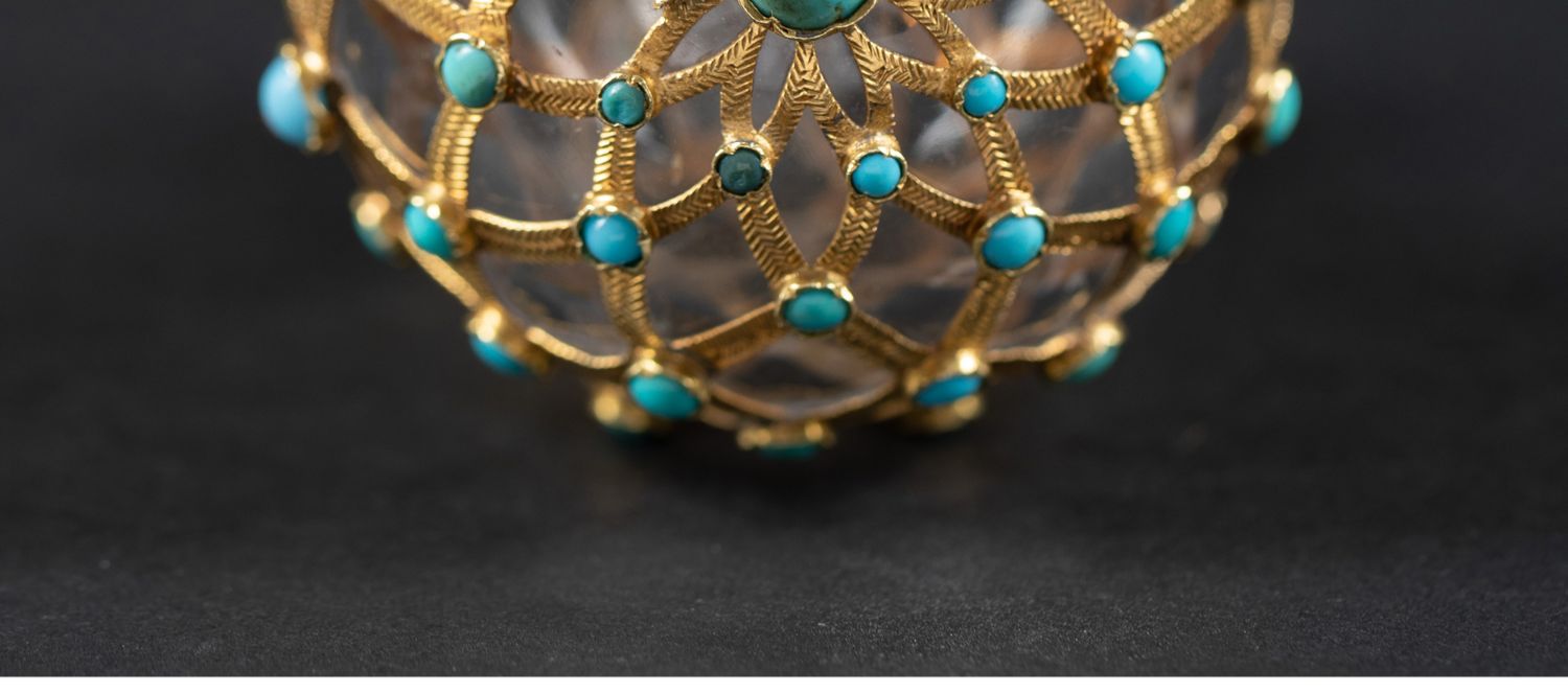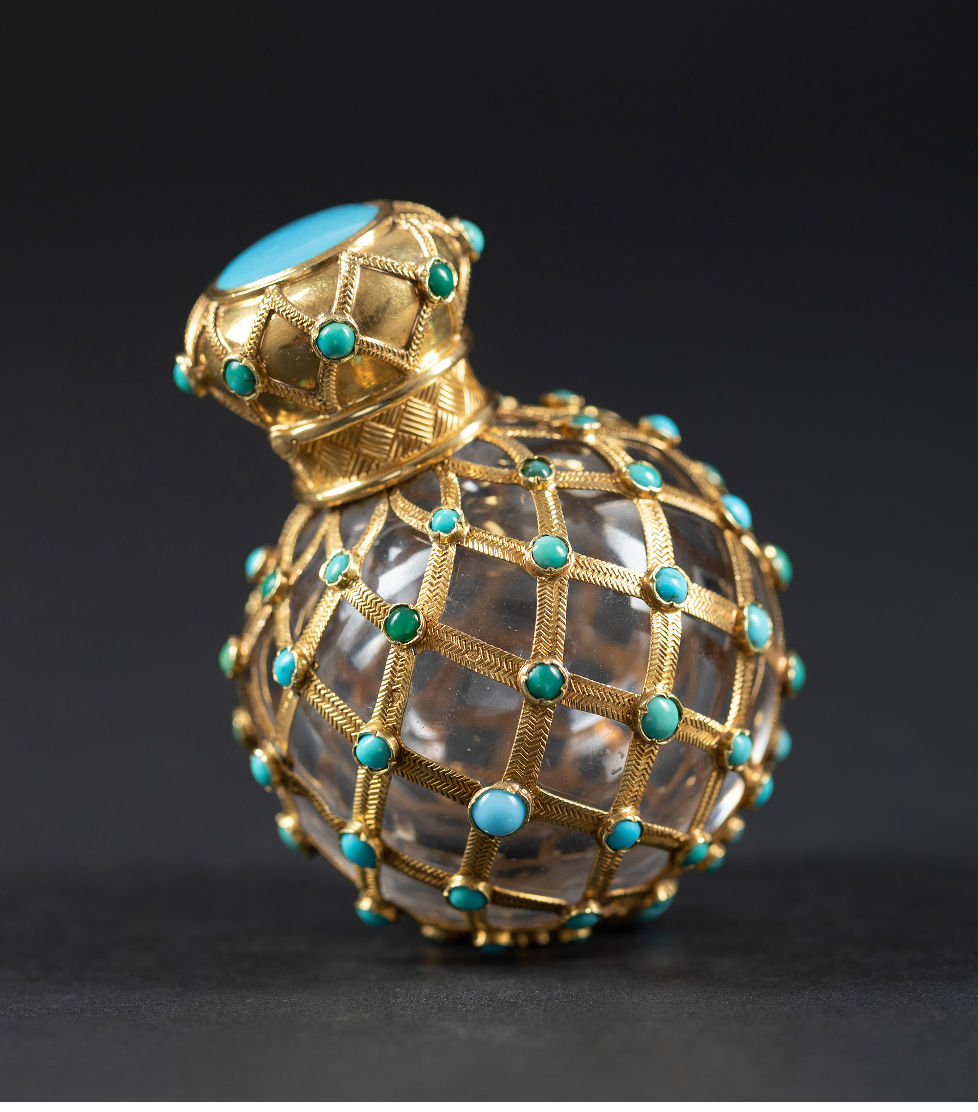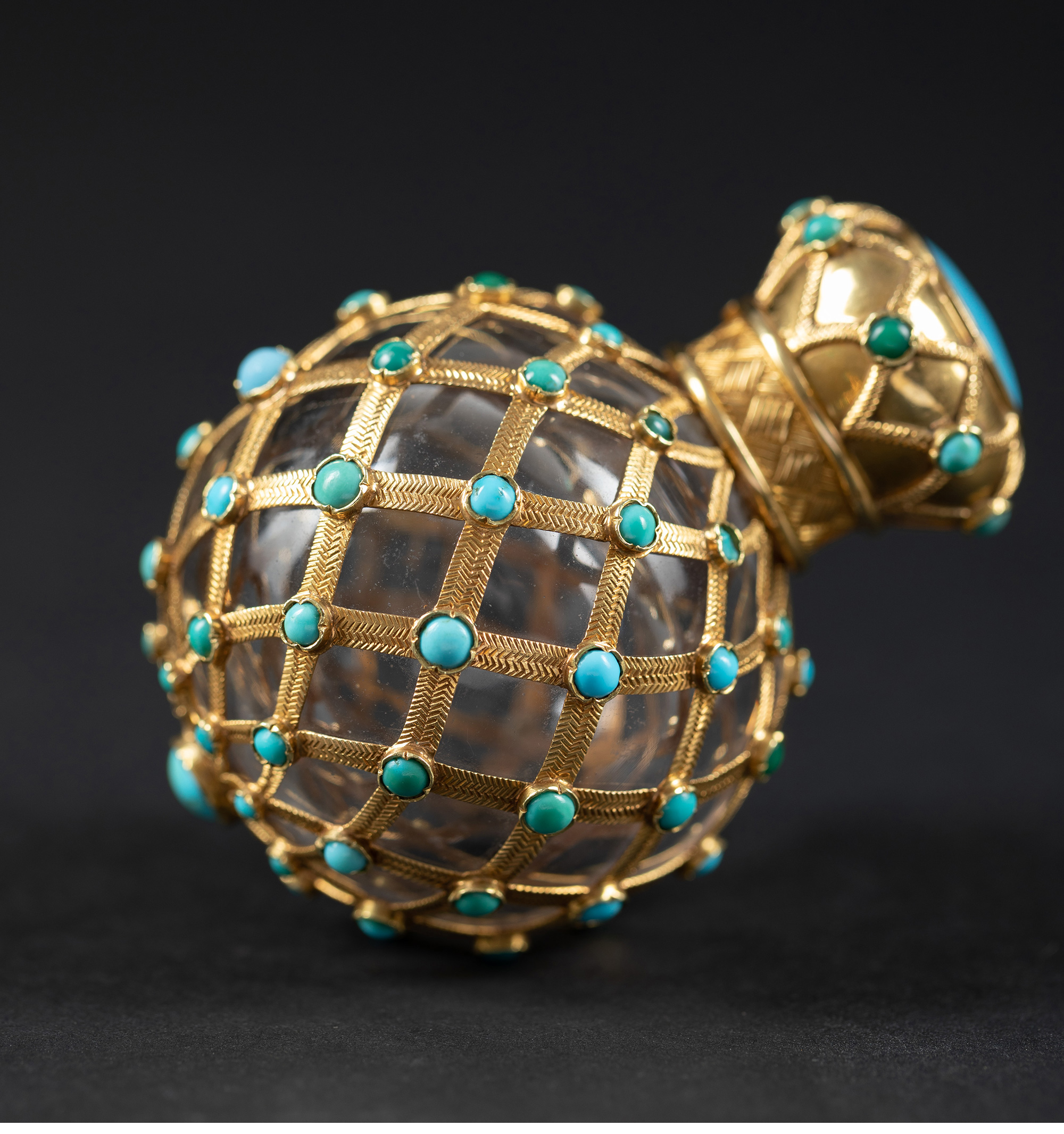 独角鹿西洋古董18k黄金精雕编织纹镶嵌绿松石装饰水晶香水瓶