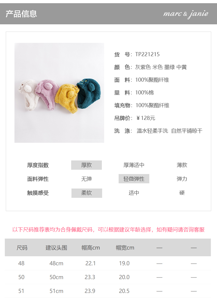 马克珍妮冬装新款 男女童双面舒棉绒小耳朵帽子 宝宝帽子221215