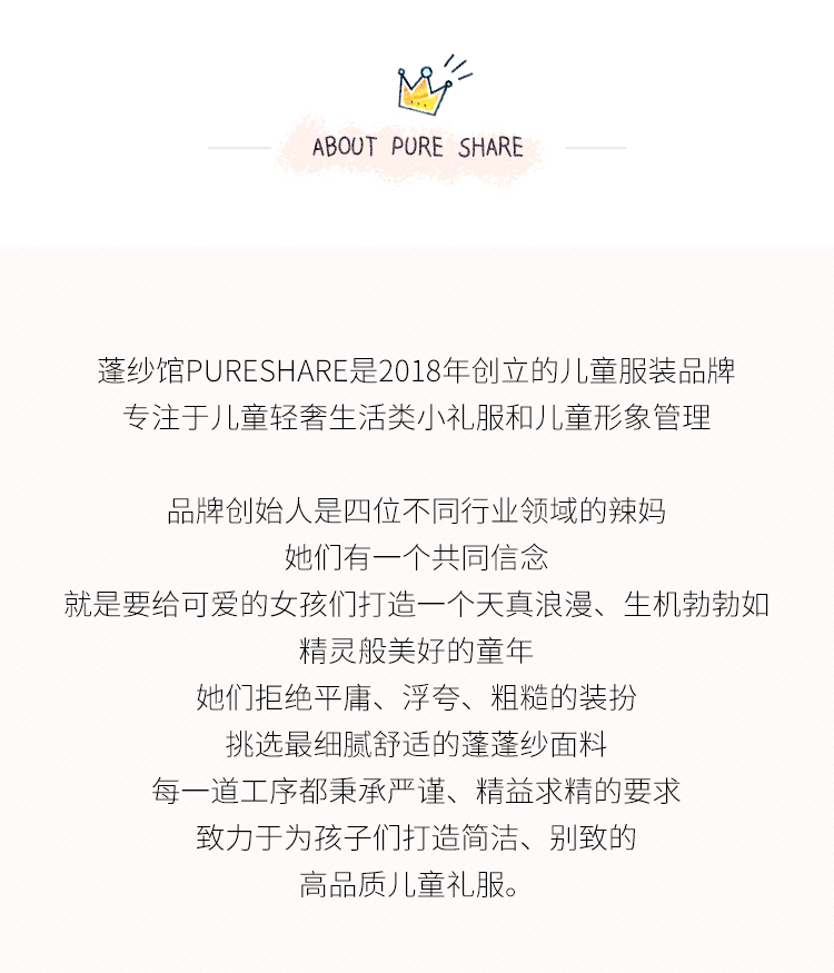 - PureShare蓬纱馆,2018年创立的儿童服装品牌,专注于儿童轻奢生活类小礼服,主张“让孩子做最独特的自己”的品牌理念,为孩子们提供时尚简洁、优雅而又不失童真的生活类礼服。