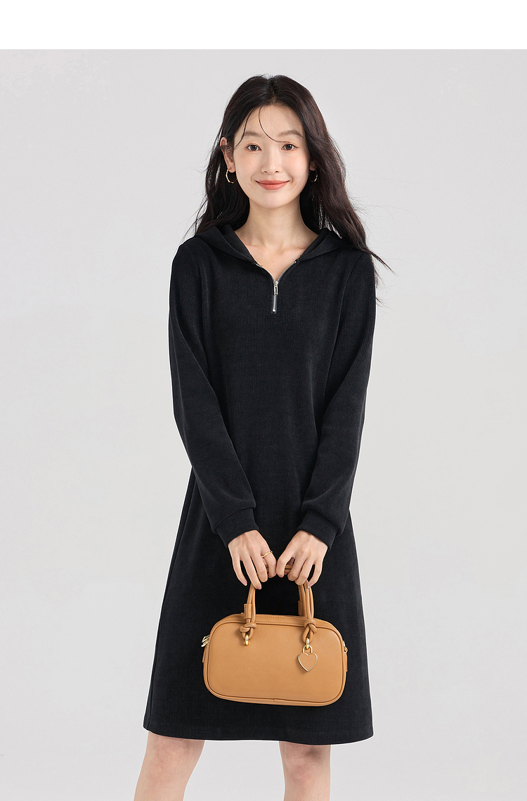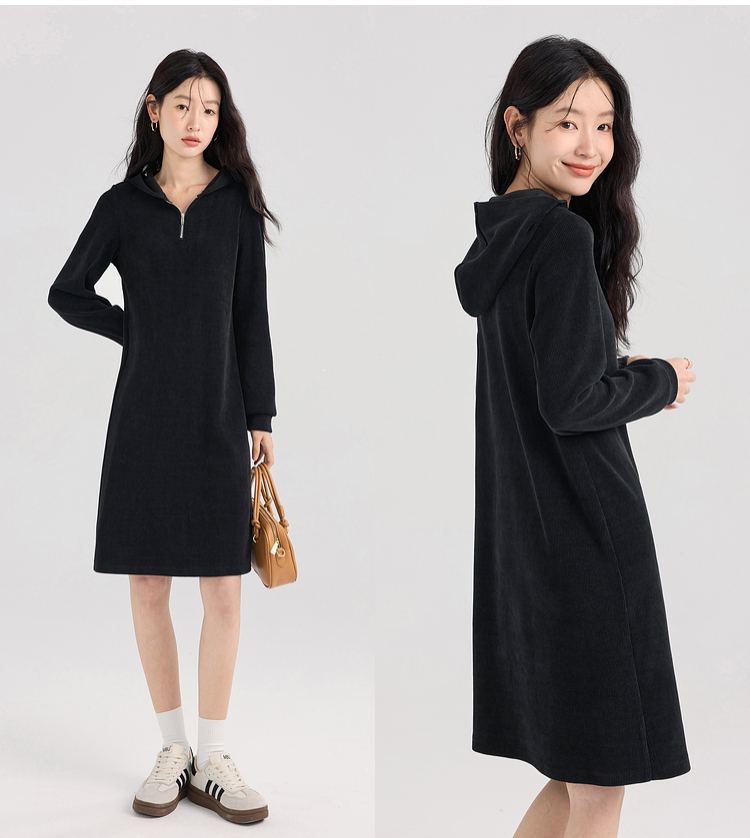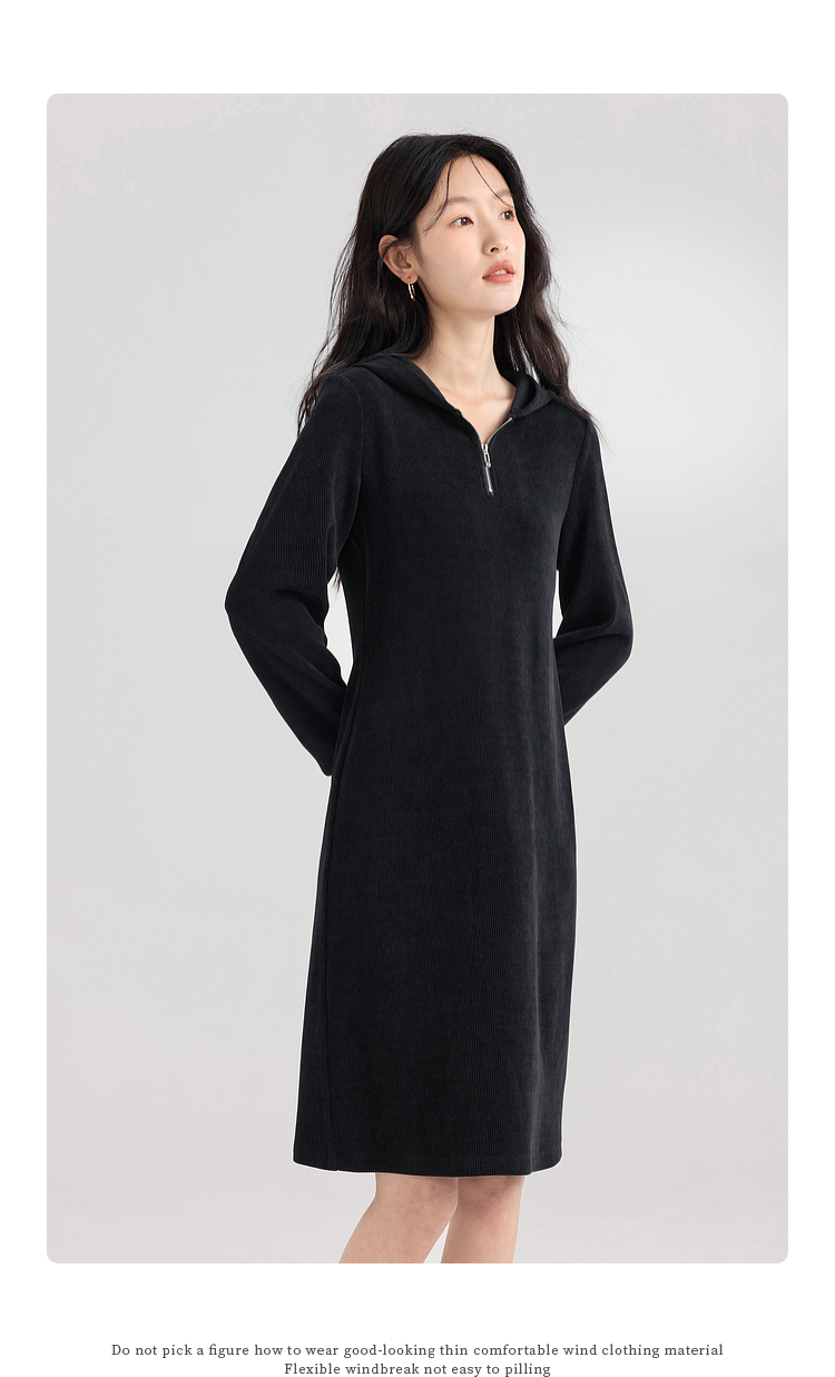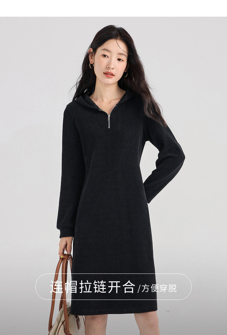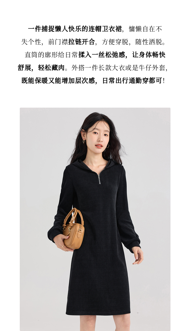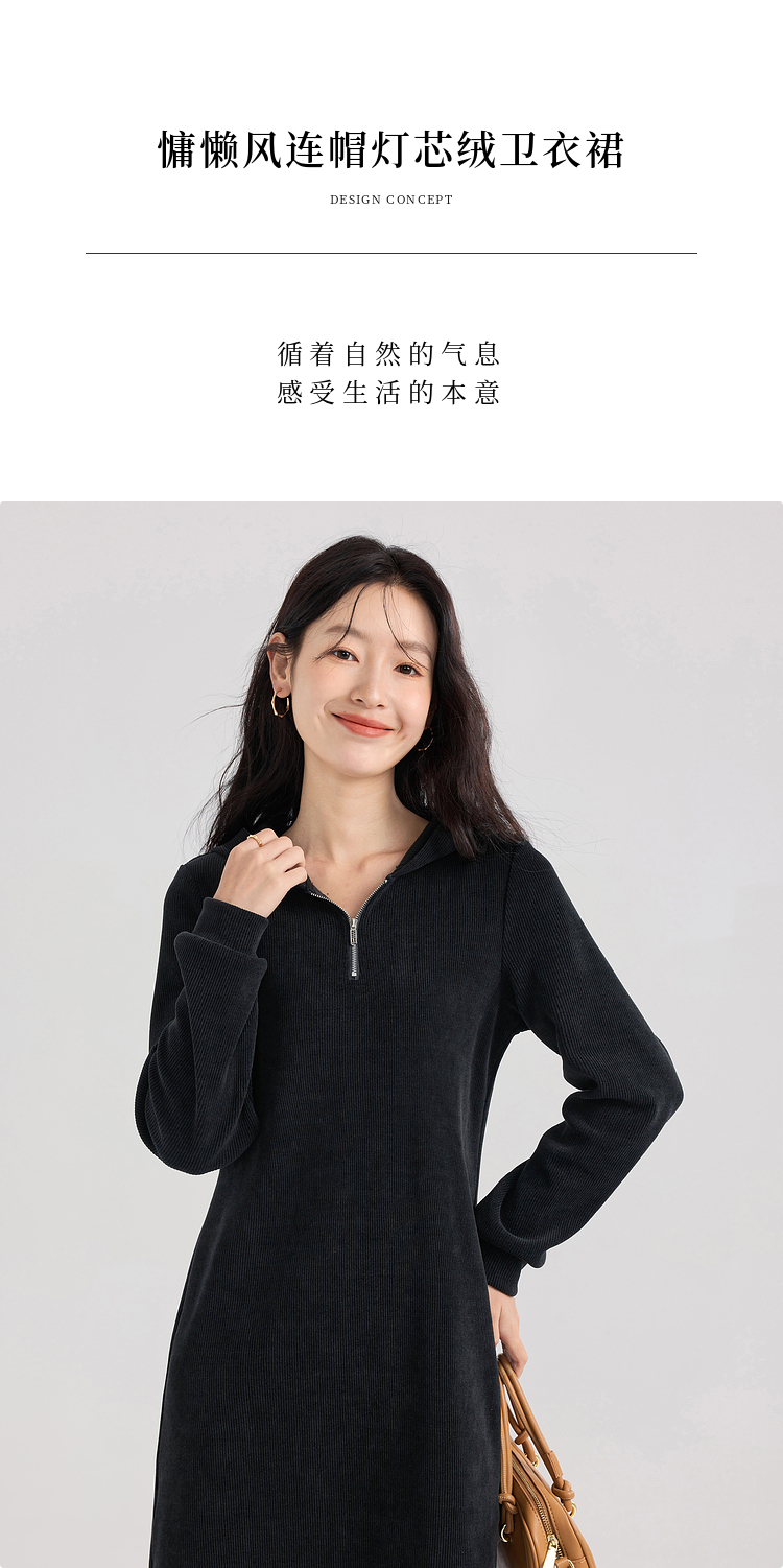 【年终特卖】熙世界慵懒风连帽卫衣裙女秋冬2025新款黑色坑条灯芯绒直筒连衣裙