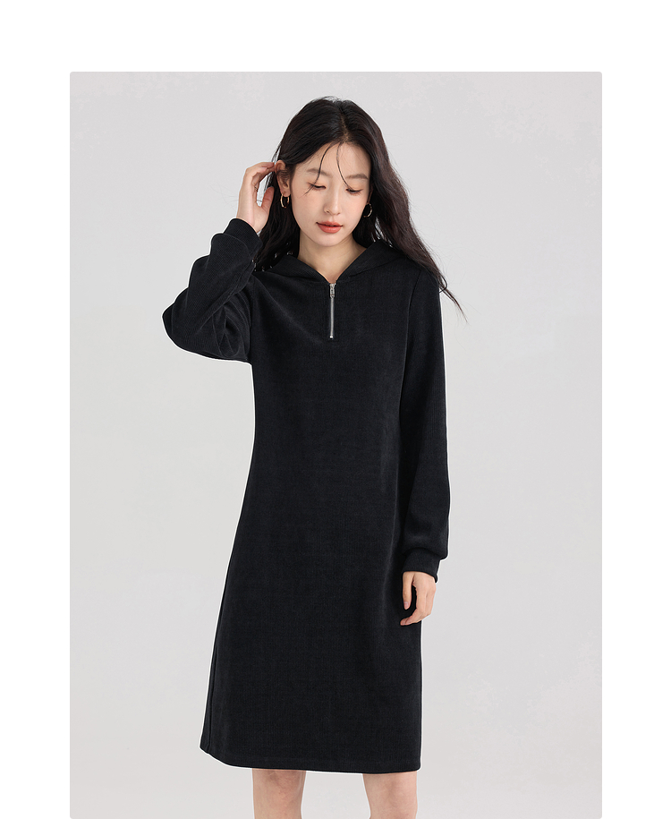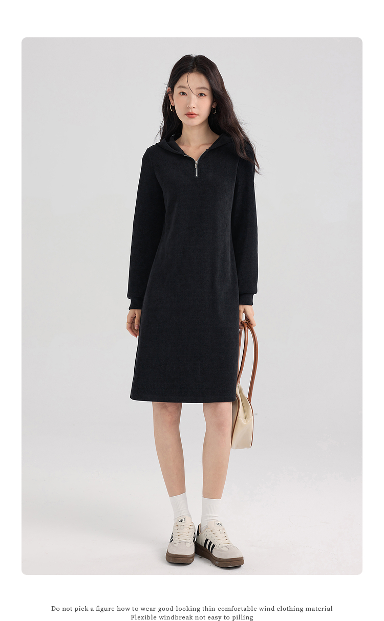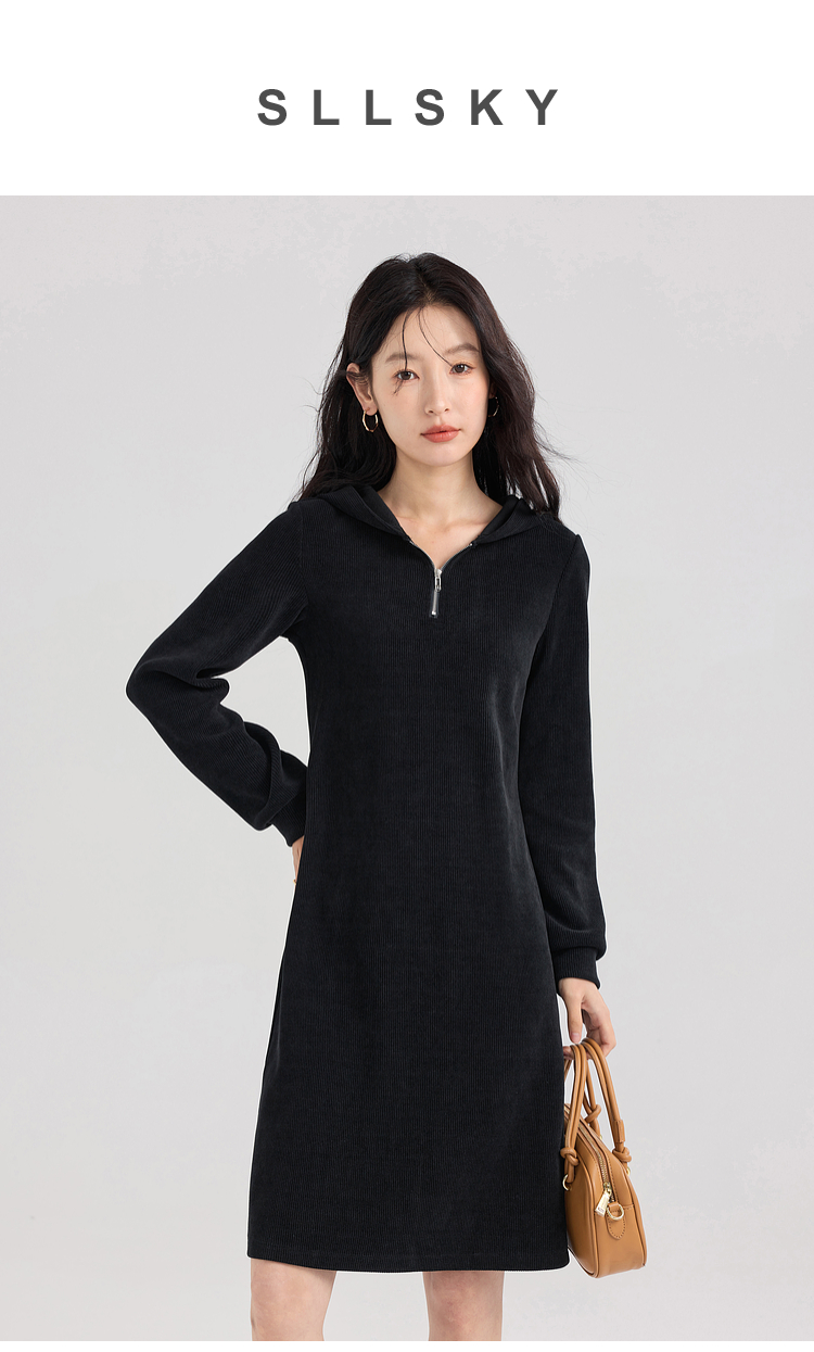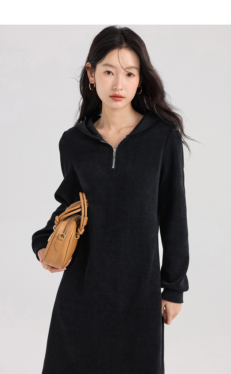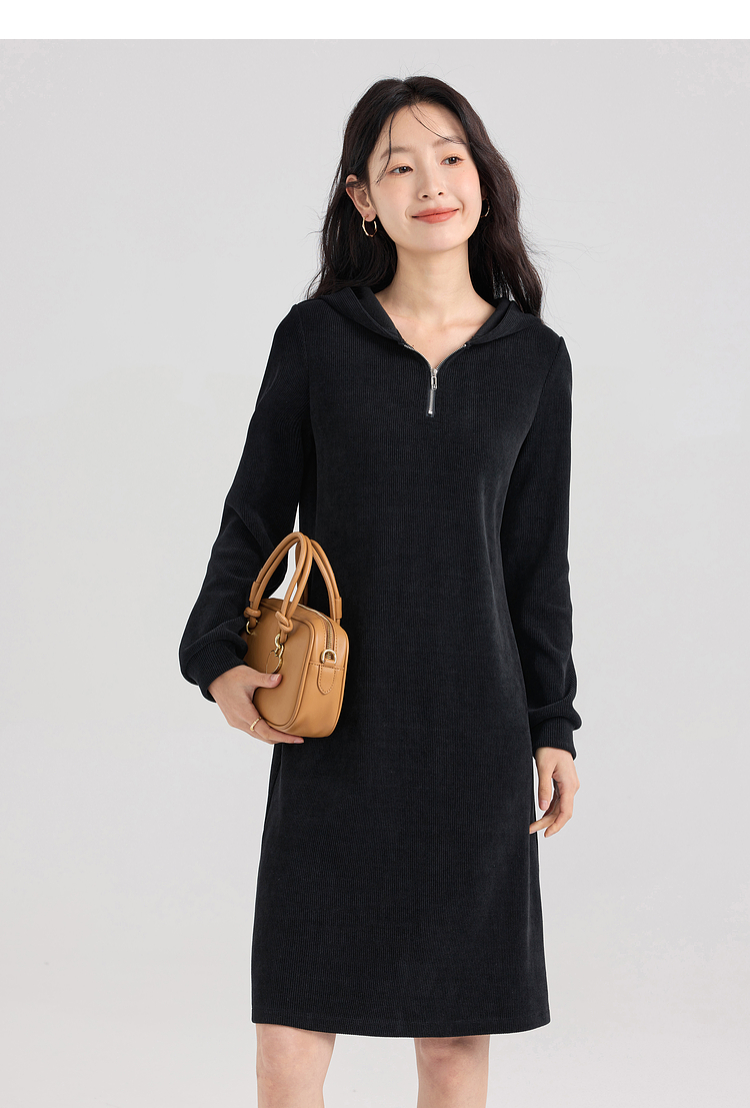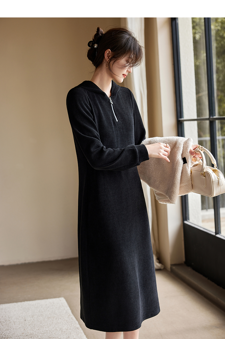 【年终特卖】熙世界慵懒风连帽卫衣裙女秋冬2025新款黑色坑条灯芯绒直筒连衣裙