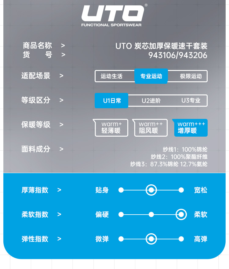 UTO悠途潜心于贴身运动装备的研发、设计和生产。从纤维到组织,从设计到工艺,在无缝贴身运动装备领域,树立国内标杆。 UTO着力于品牌互联网化,不断采集大量运动数据,为跑步、健身、滑雪等不同类型的运动爱