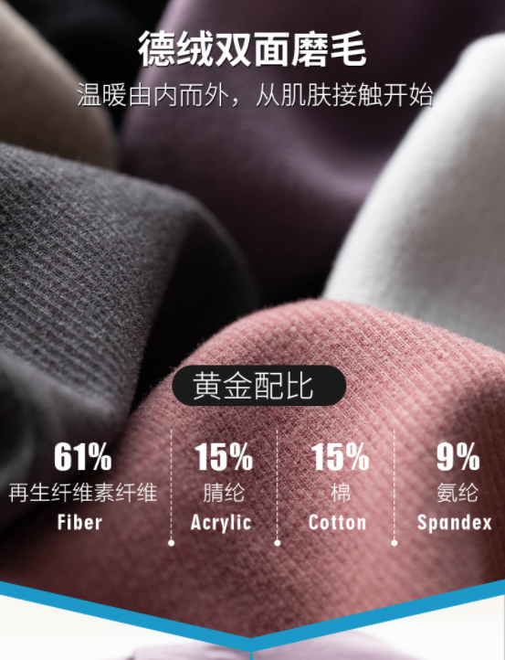 德绒,其实是一种德国拜耳研发的腈纶纤维,采用干法纺丝工艺制成,截面为异型结构,能锁住更多静止空气,因此保暖性能显著优于普通面料。如果给常用内衣面料的保暖性排个序:德绒>日本腈纶>国产腈纶>聚酯纤维。