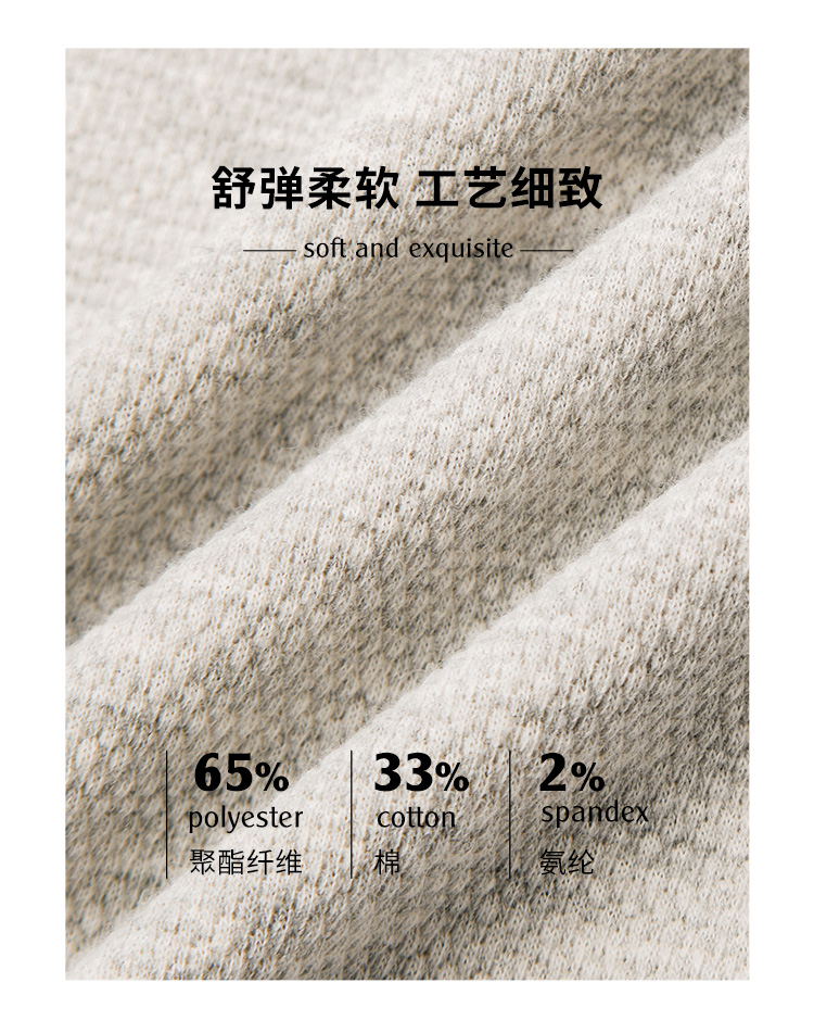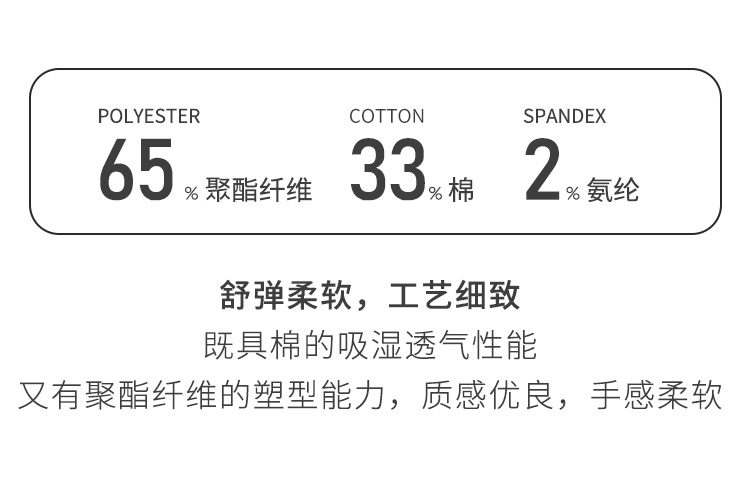 | 材质成分: 聚酯纤维65% 棉33% 聚氨酯弹性纤维(氨纶)2% |