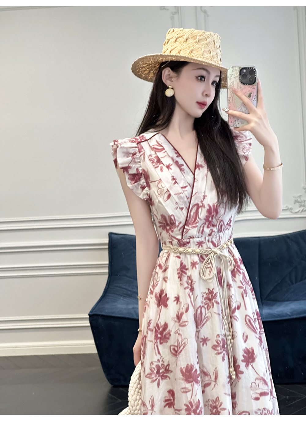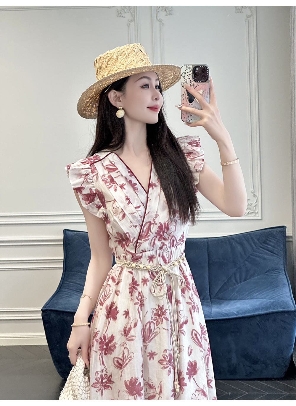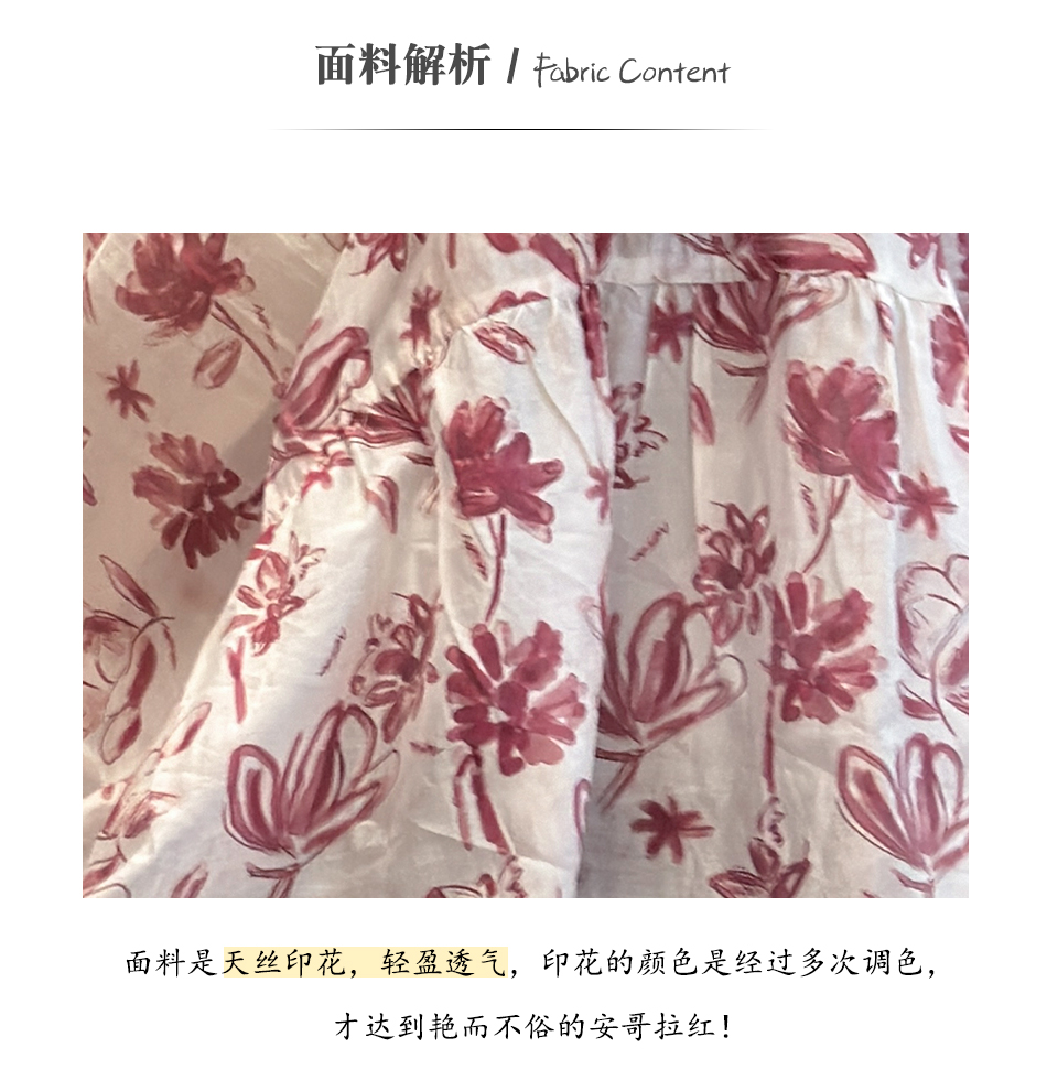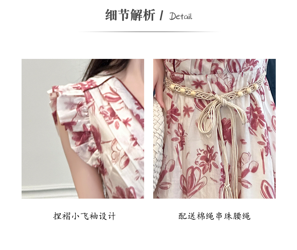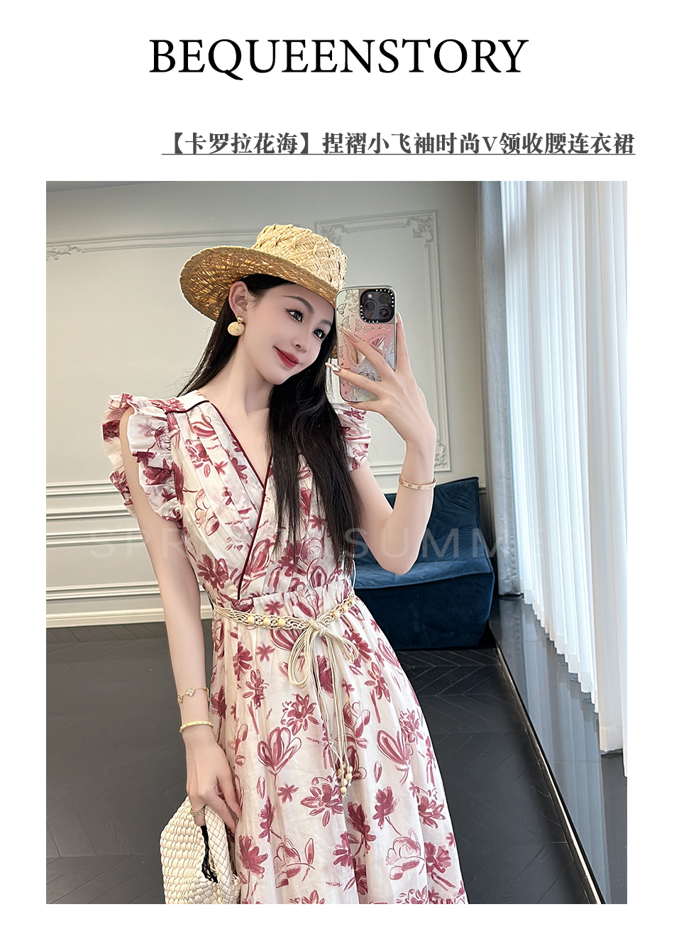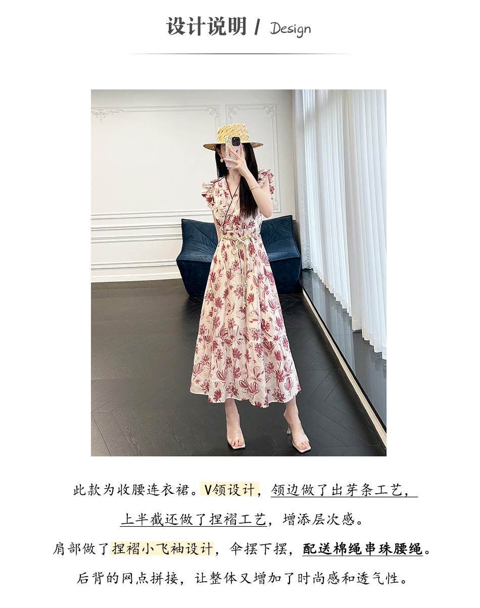 BeQueenStory【卡罗拉花海】设计感捏褶小飞袖时尚V领收腰连衣裙