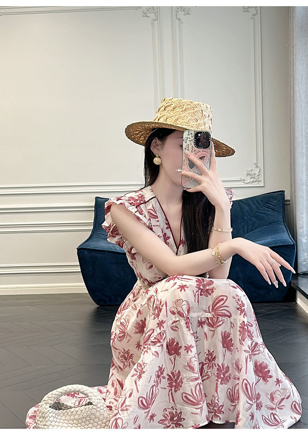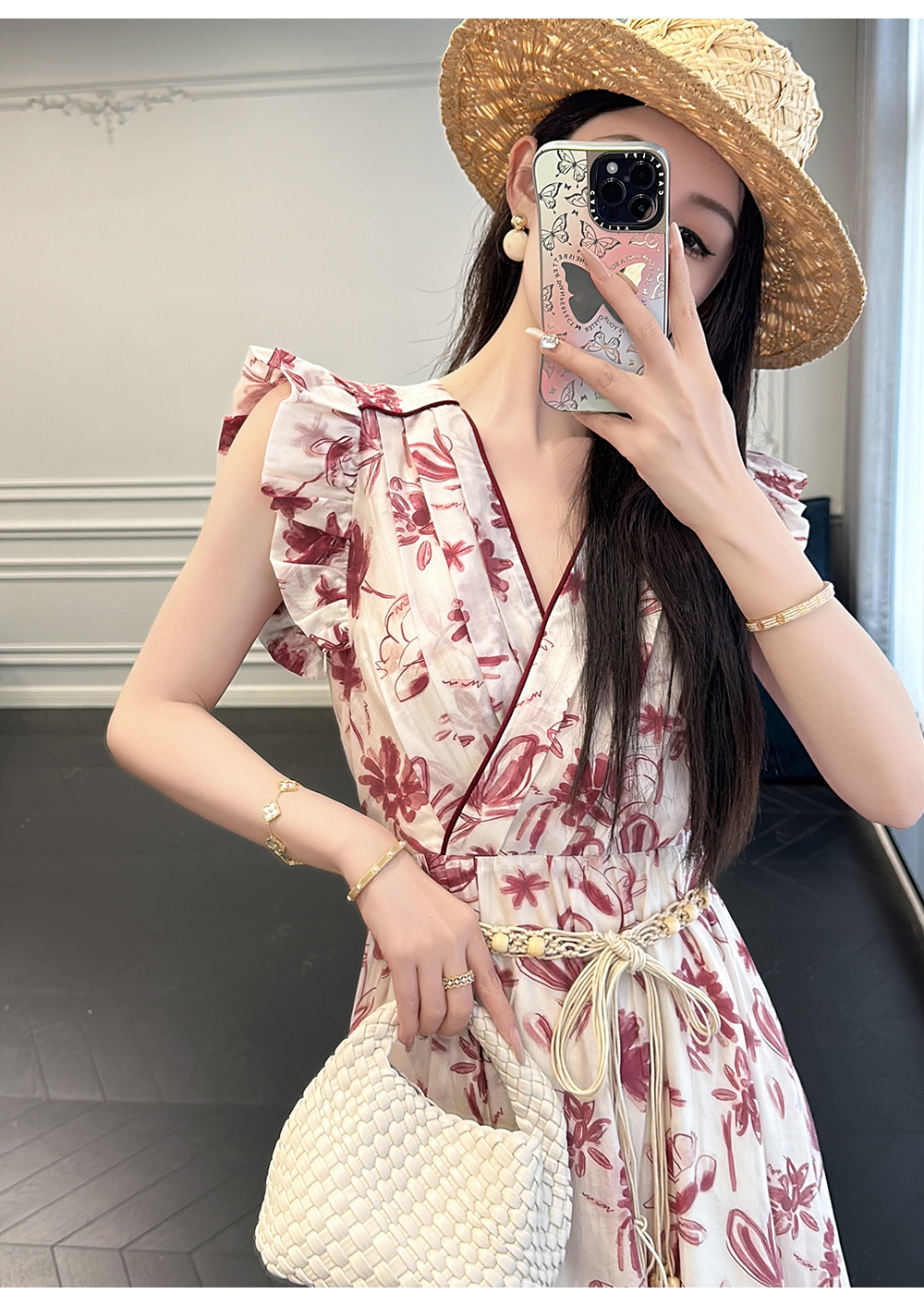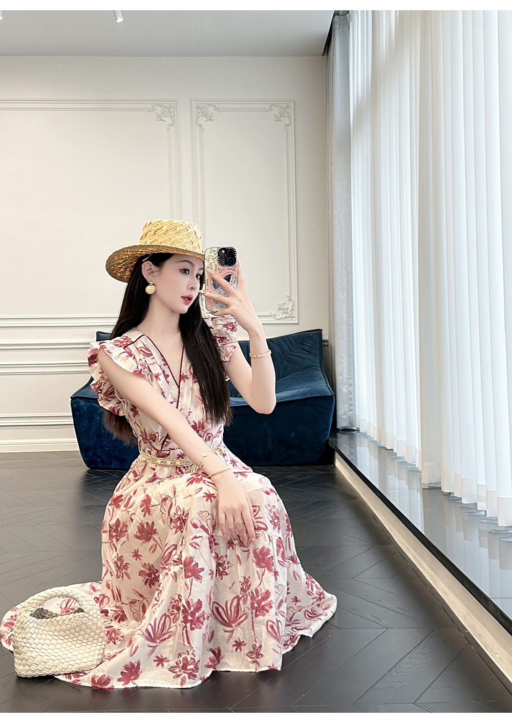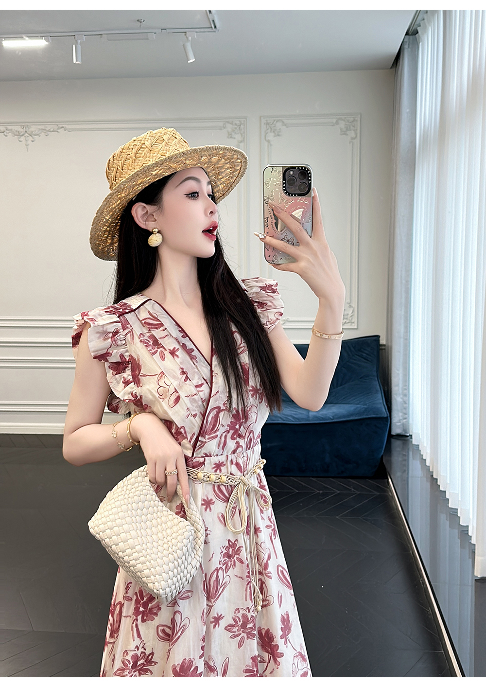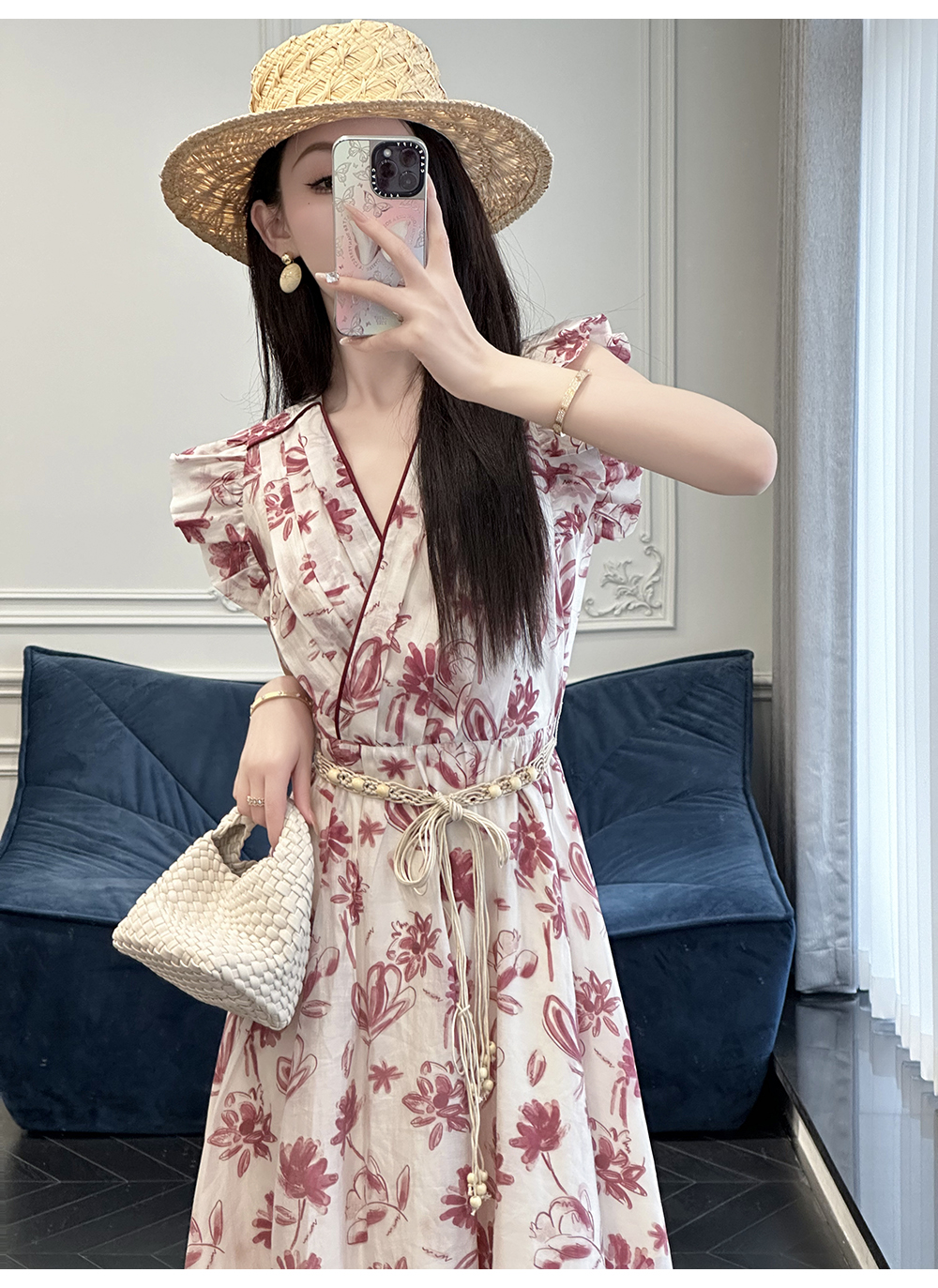 BeQueenStory【卡罗拉花海】设计感捏褶小飞袖时尚V领收腰连衣裙
