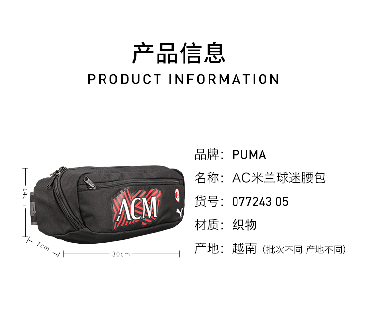 正品PUMA/彪马AC米兰足球运动休闲跑步收纳腰包077243-05