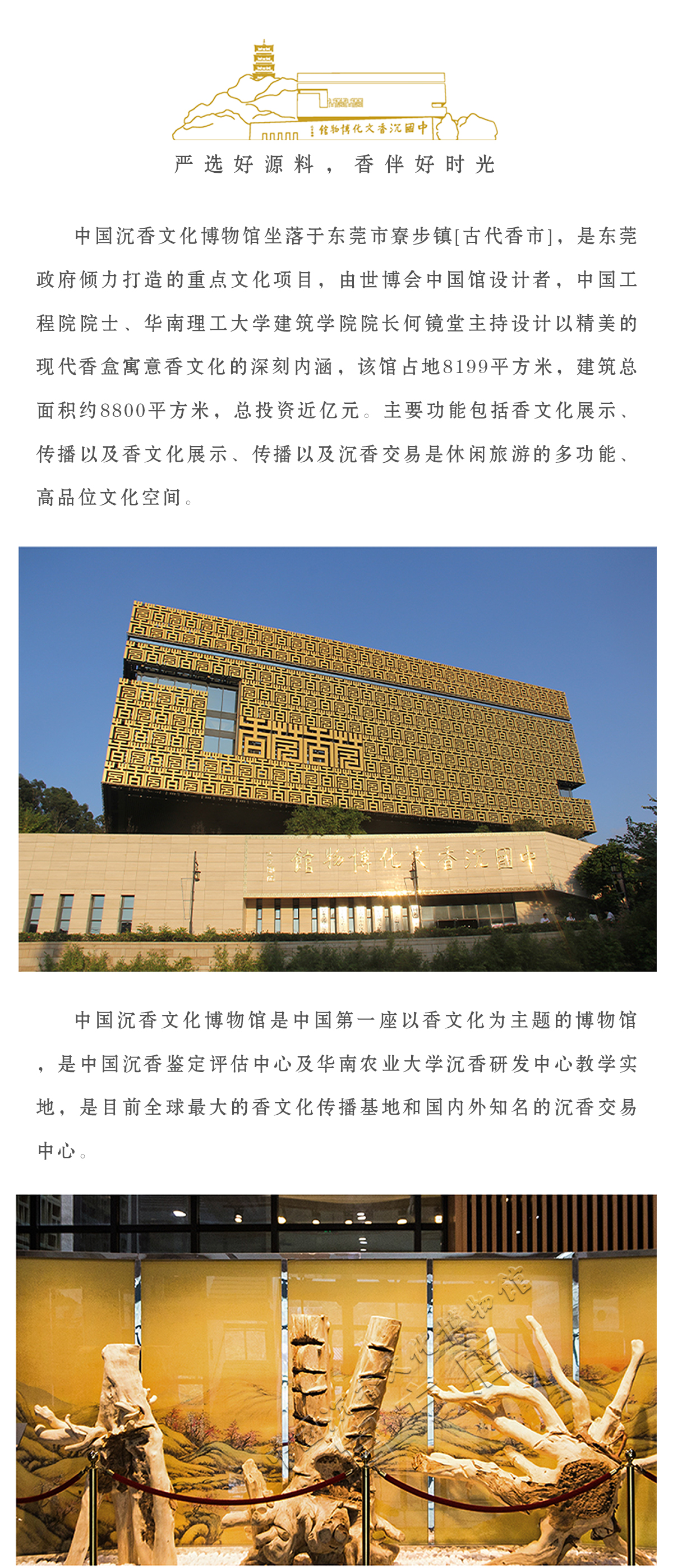 中国沉香文化博物馆坐落于古代[香市]东莞市寮步镇,是东莞政府倾力打造的重点文化项目,由世博会中国馆设计者,中国工程院院士、华南理工大学建筑学院院长何镜堂主持设计,以精美的现代[香盒]寓意香文化的深刻内
