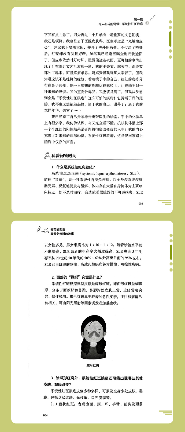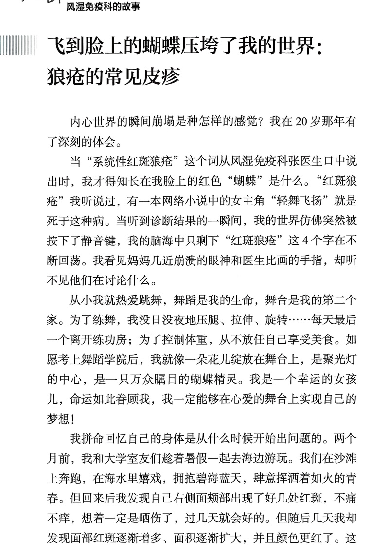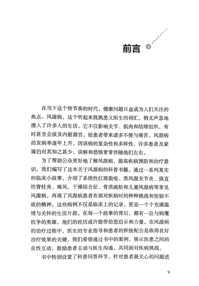 本书内容紧紧围绕常见的风湿病临床表现和诊治故事这一主题,共分八个系列(如系统性红斑狼疮、类风湿关节炎系列等),以故事的形式,从患者的视角出发,用细腻的笔触描绘患者求医的历程。并将风湿病常见的发病原因和机制、临床表现、诊治用药、预防保健等科普性内容以患者和医生沟通的方式,通过深入浅出的讲述形式渗透其中。用通俗易懂的语言让读者能够全面了解风湿病的相关信息。本书借鉴编者身边一个个真实的病例,以患者的视角讲述风湿病患者在求医过程中遇到的常见困扰,如对未知疾病的担忧、对诊疗过程的质疑、患病后人际关系的改变等等。