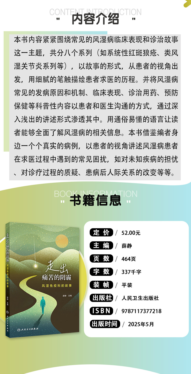 走出痛苦的阴霾:风湿免疫科的故事 薛静 以患者的视角讲述风湿病患者在求医过程中遇到的常见困扰 9787117377218人民卫生出版社