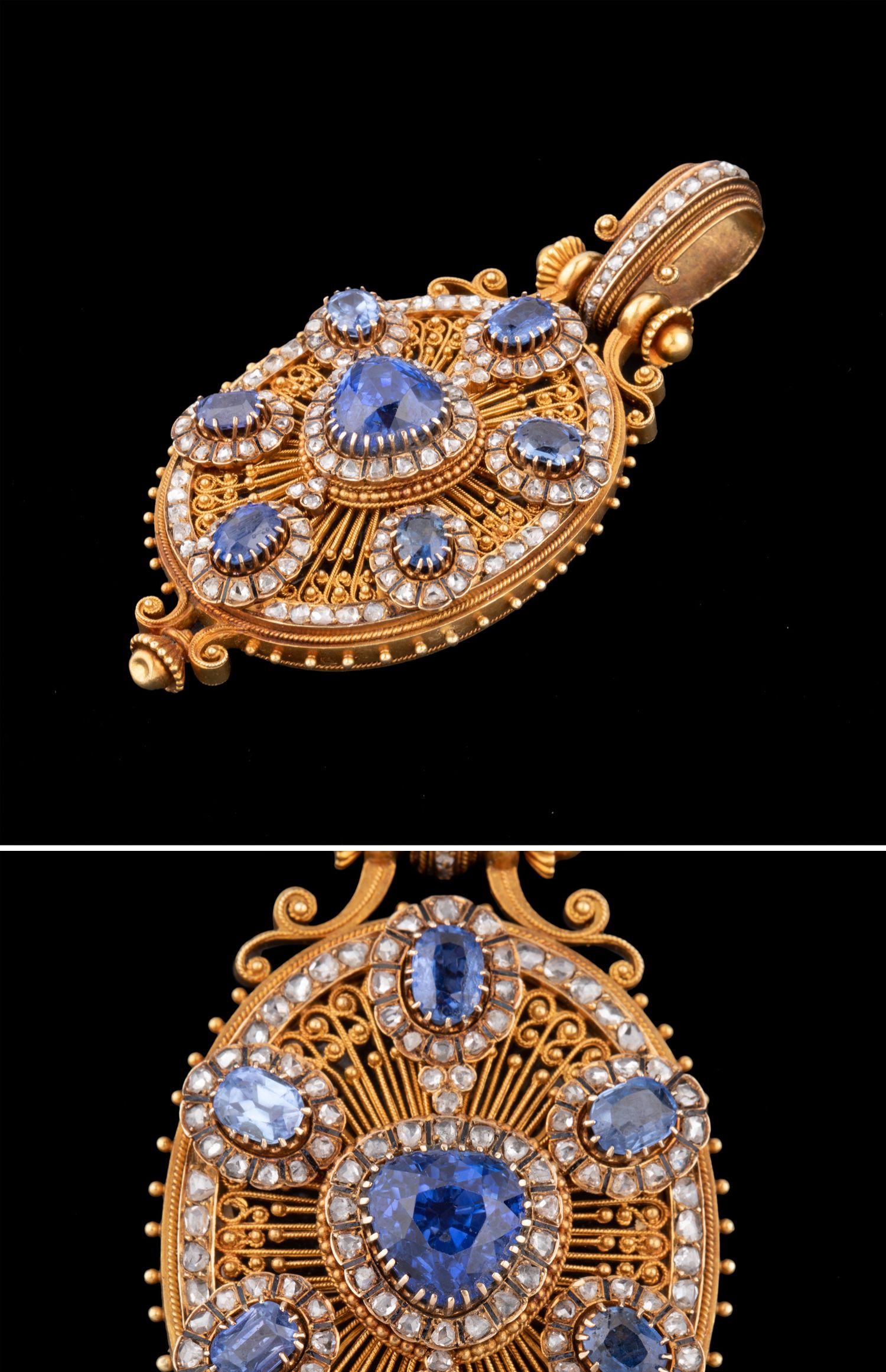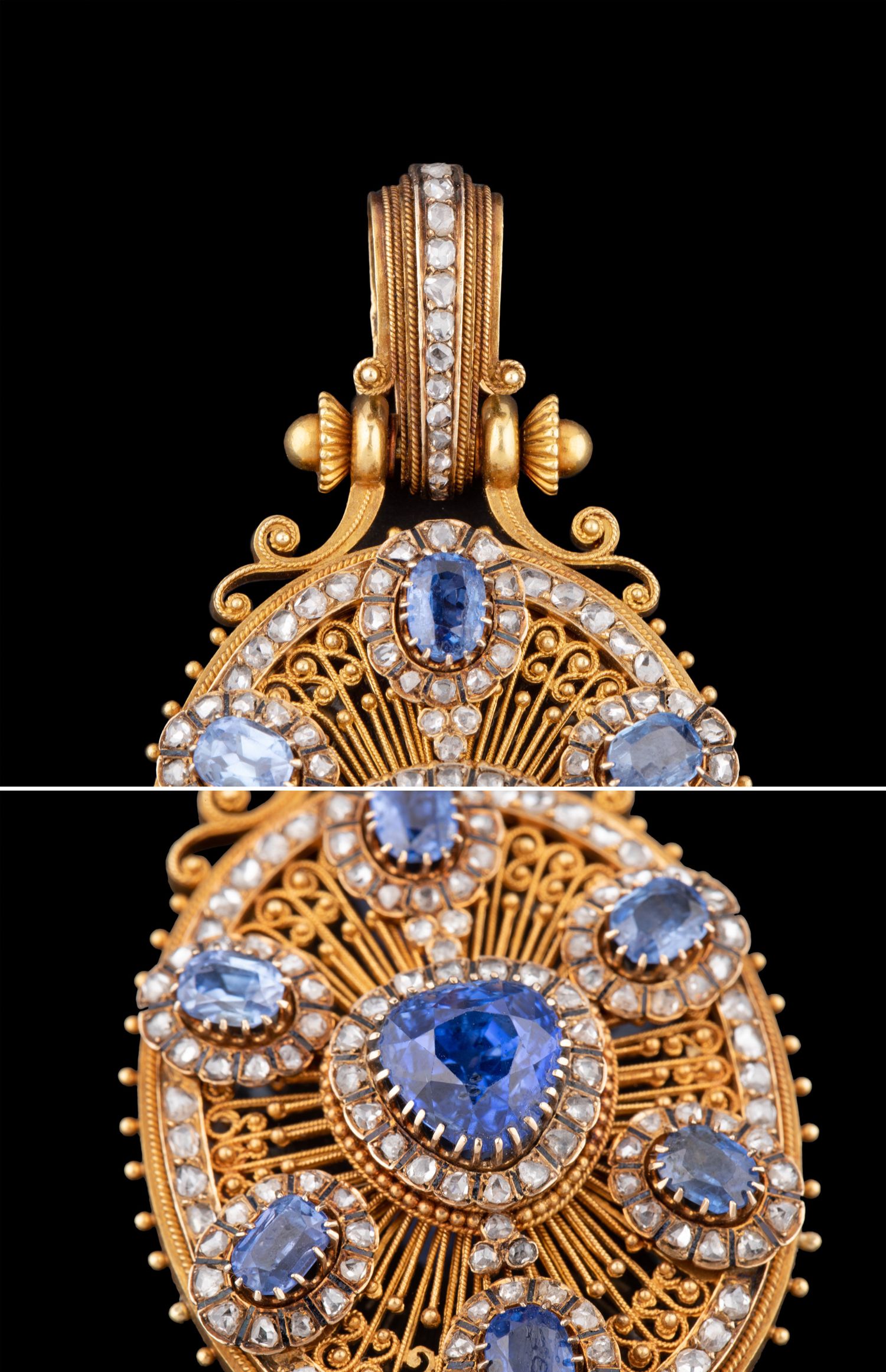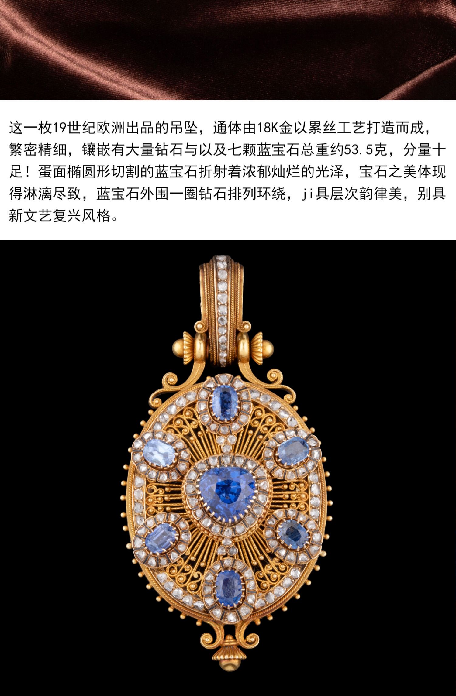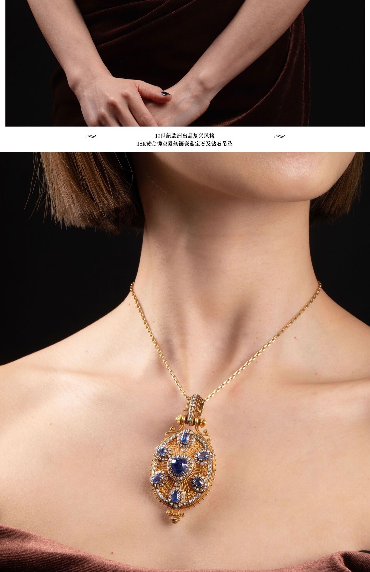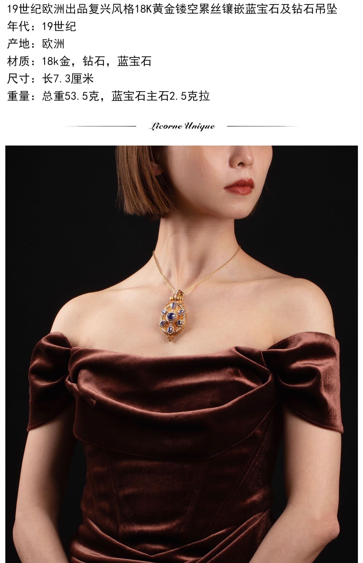 独角鹿西洋古董珠宝首饰18K黄金镂空累丝镶嵌蓝宝石钻石吊坠项链
