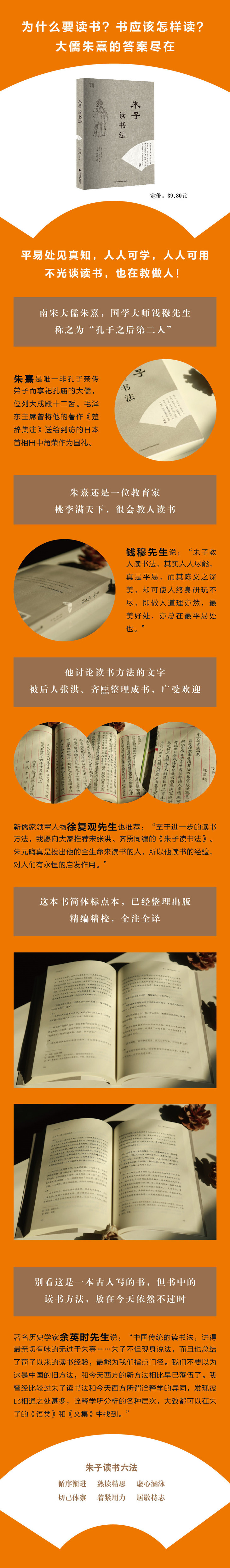 “朱子读书法”是中国古代影响*广泛、*系统的读书方法,近代以来的大学者钱穆、徐复观、余英时等都曾专门向读者推荐。《朱子读书法》一书首先由朱熹亲传弟子辅广从朱熹众多作品和语录中辑录而成,而后再由张洪、齐增补,并进行系统的整理,“更易次第,先定纲领,以载书之所当读之故,与读之所当务之说。复于中撮其枢要,厘为六条,曰循序渐进,曰熟读精思,曰虚心涵泳,曰切己体察,曰着紧用力,曰居敬持志,而著其说于每条之下,于是纲领条目粲然明白”。