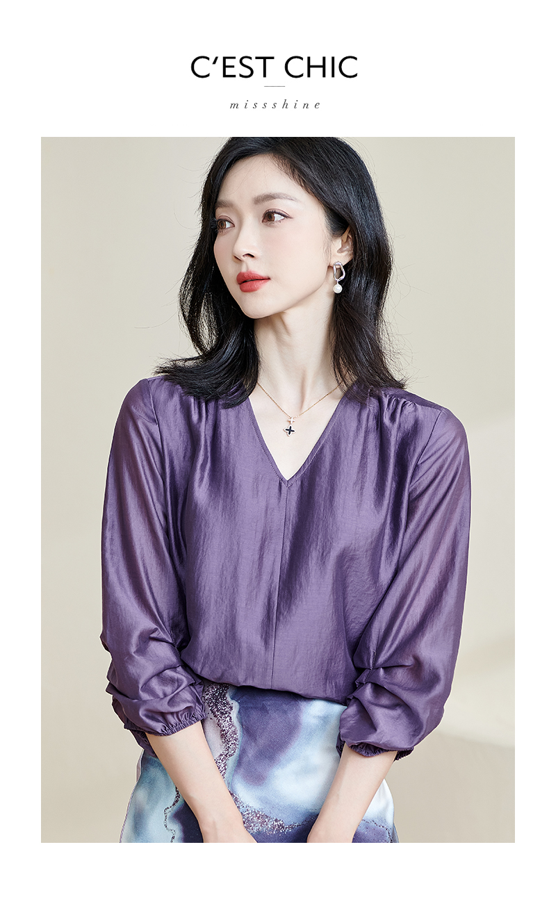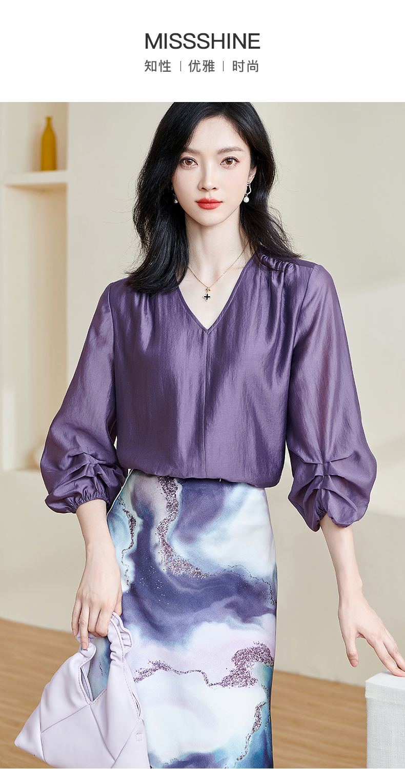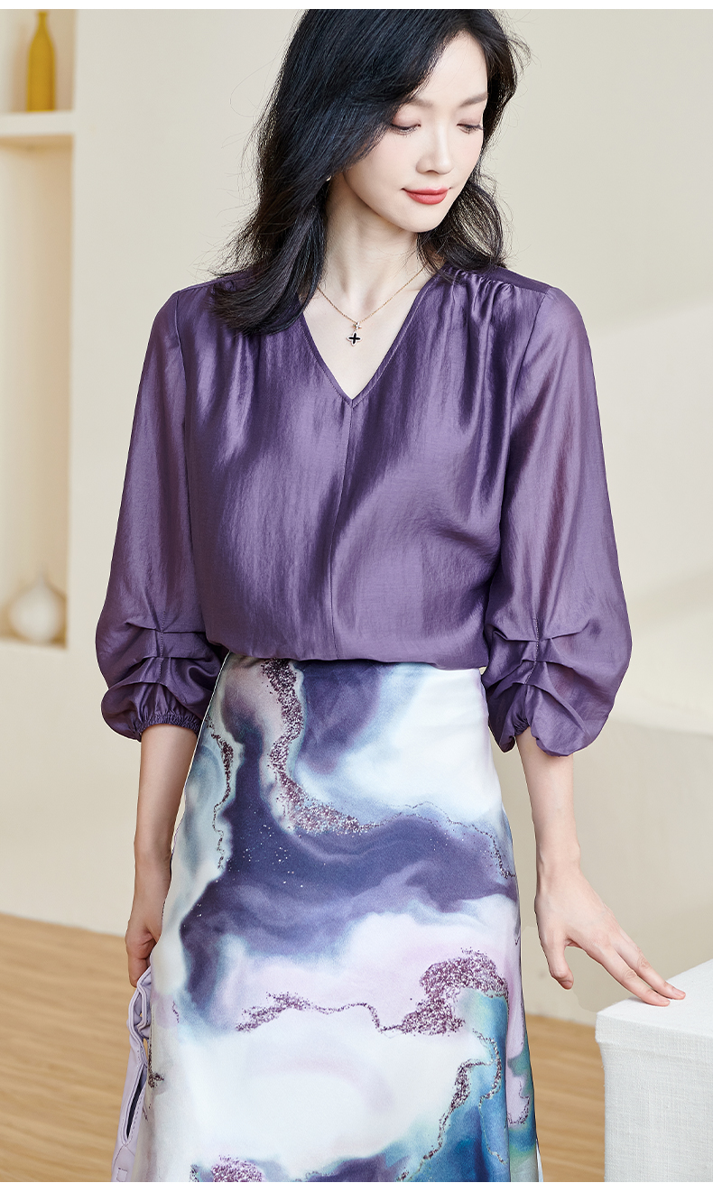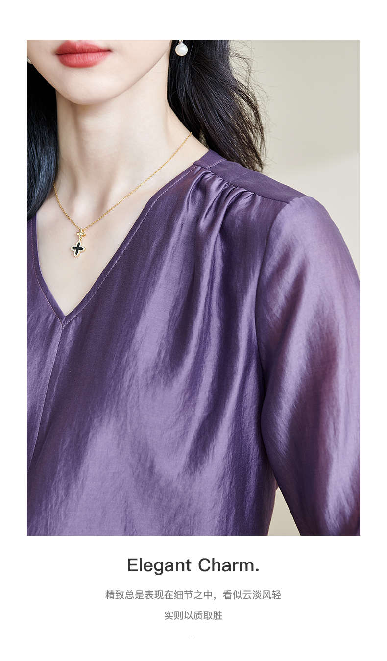 「雾紫流光」天丝 V 领衬衫 轻奢质感 自带细腻的珍珠光泽 比真丝更抗皱、比雪纺更有骨感,春夏穿着透气不闷汗 米思阳2026春季新款轻奢高级感莱赛尔天丝衬衫七分袖纯色上衣女2535