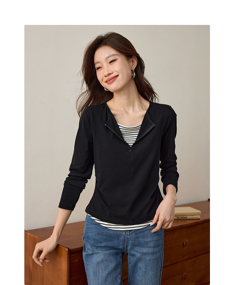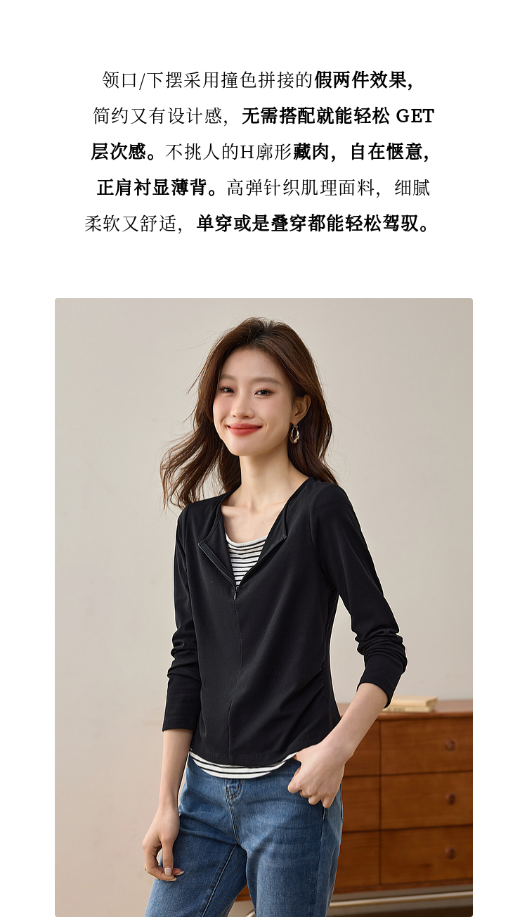【1件8折】熙世界假两件长袖t恤设计感时尚洋气修身显瘦上衣2025春秋新款