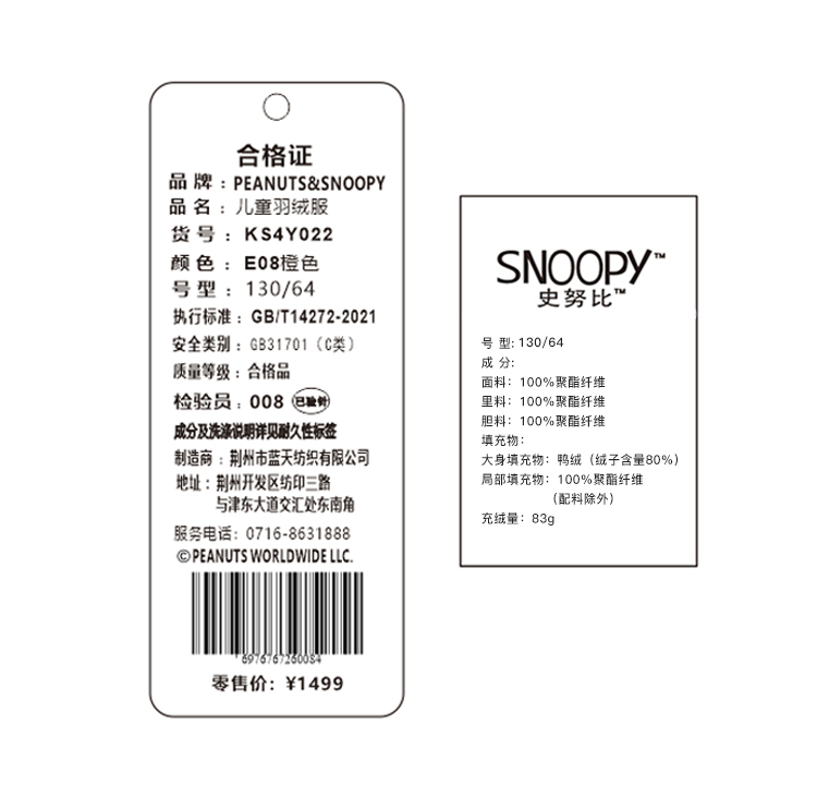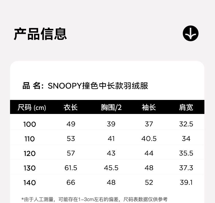 【100-140】【史努比】男童冬款保暖加厚羽绒服