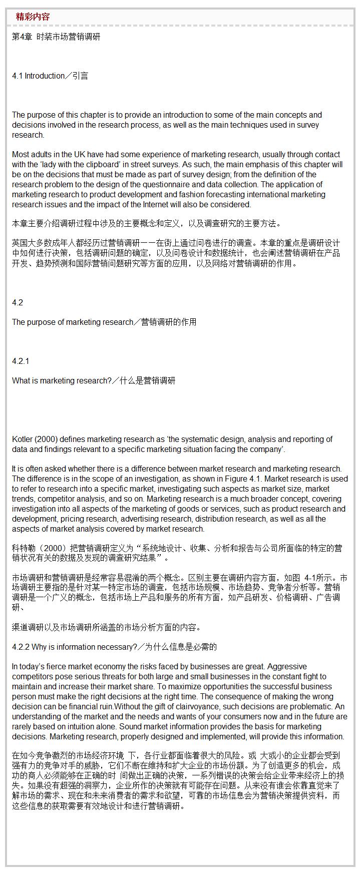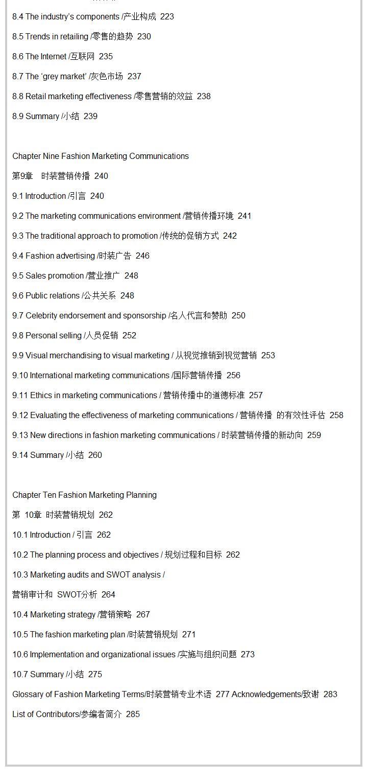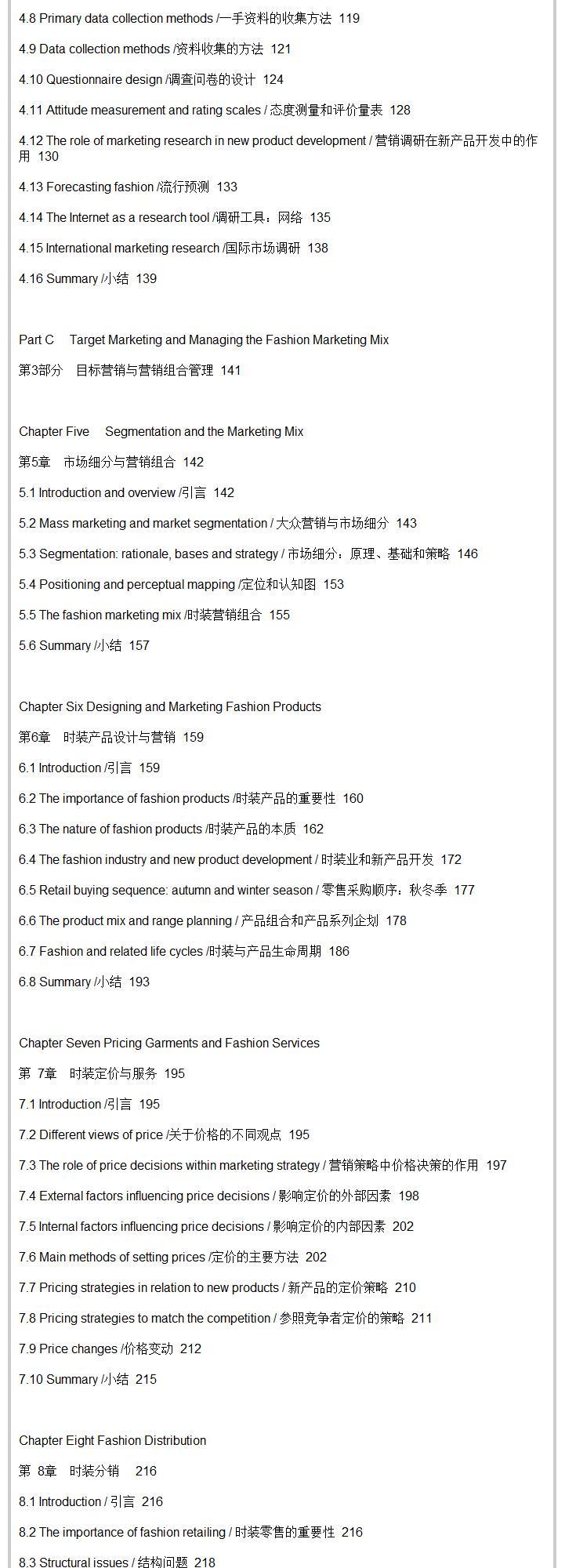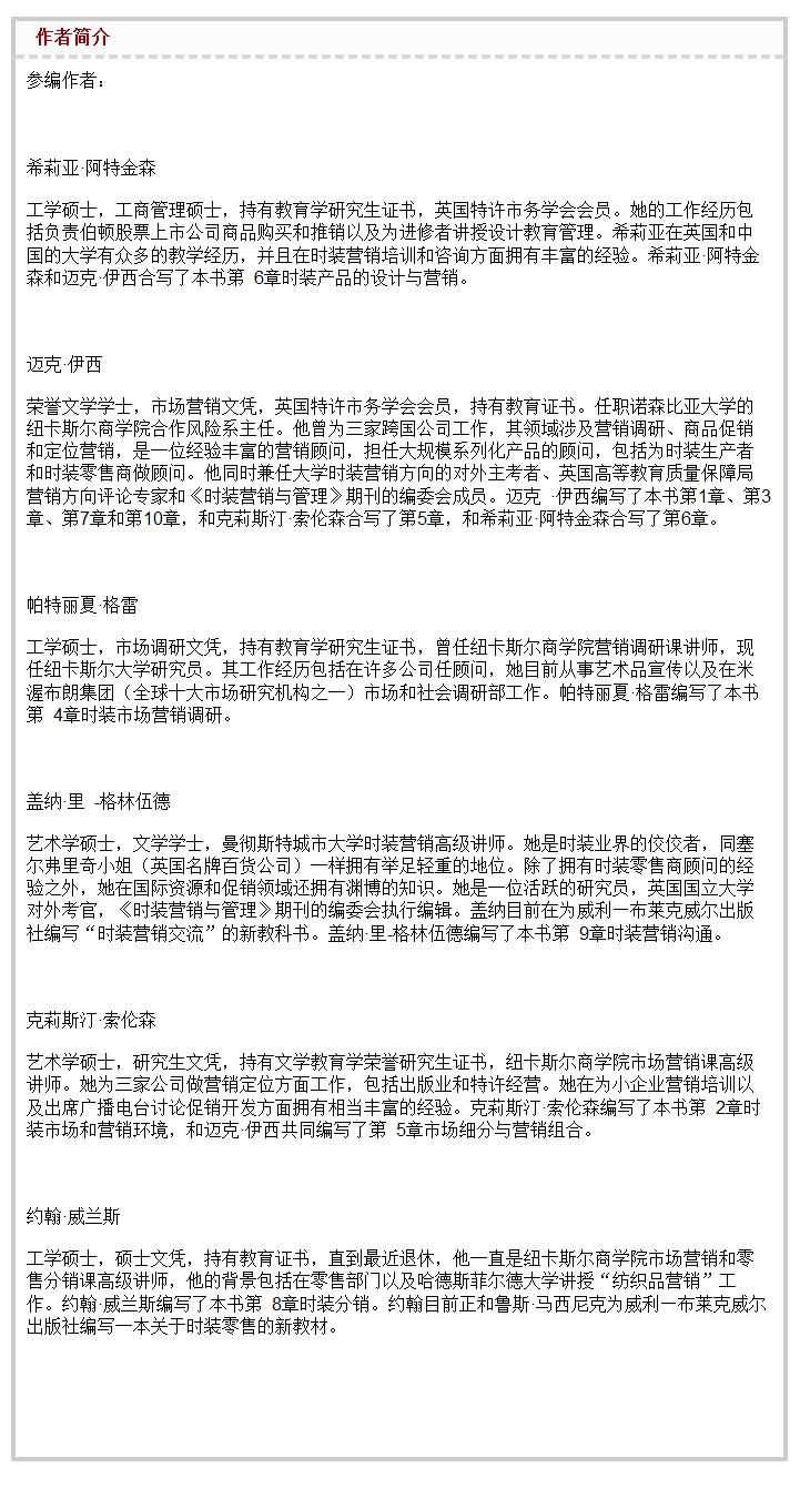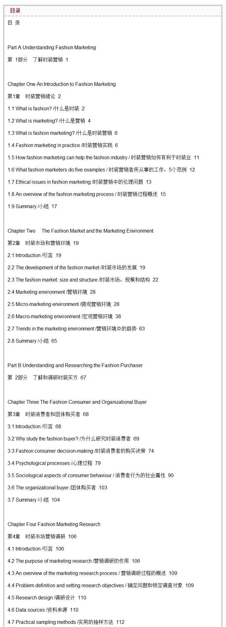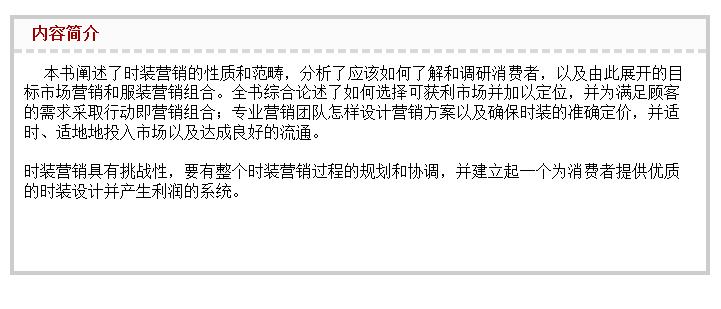 时装营销 时装营销的性质和范畴,分析了应该如何了解和调研消费者,以及由此展开的目标市场营销和服装营销组合 具有挑战性