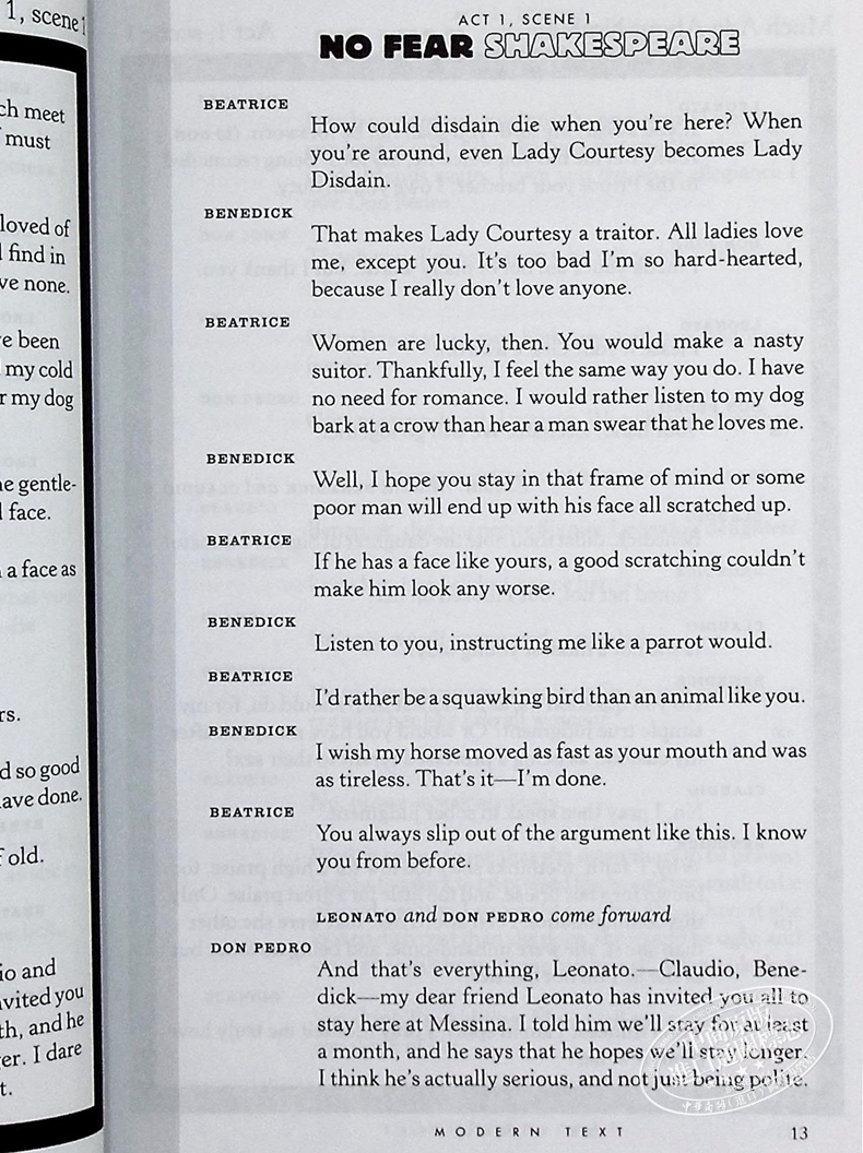 No Fear Shakespeare gives you the complete text of Much Ado About Nothing on the left-hand page, side-by-side with an easy-to-understand translation on the right.