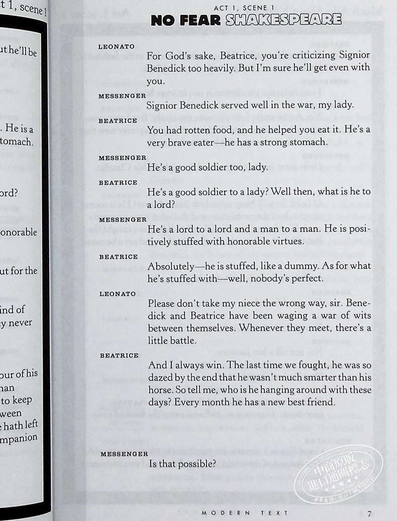 《无惧莎士比亚》将《无事生非》的完整文本放在左页,与右边的易于理解的翻译并排。