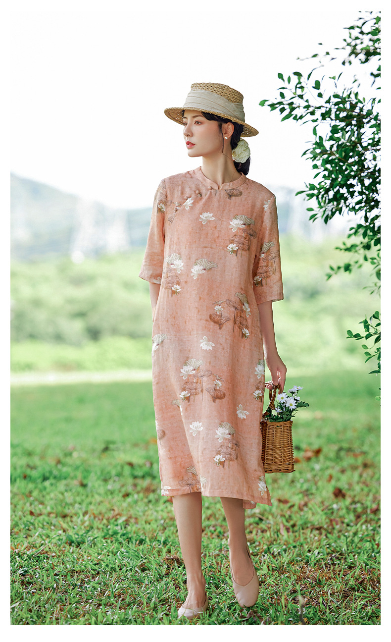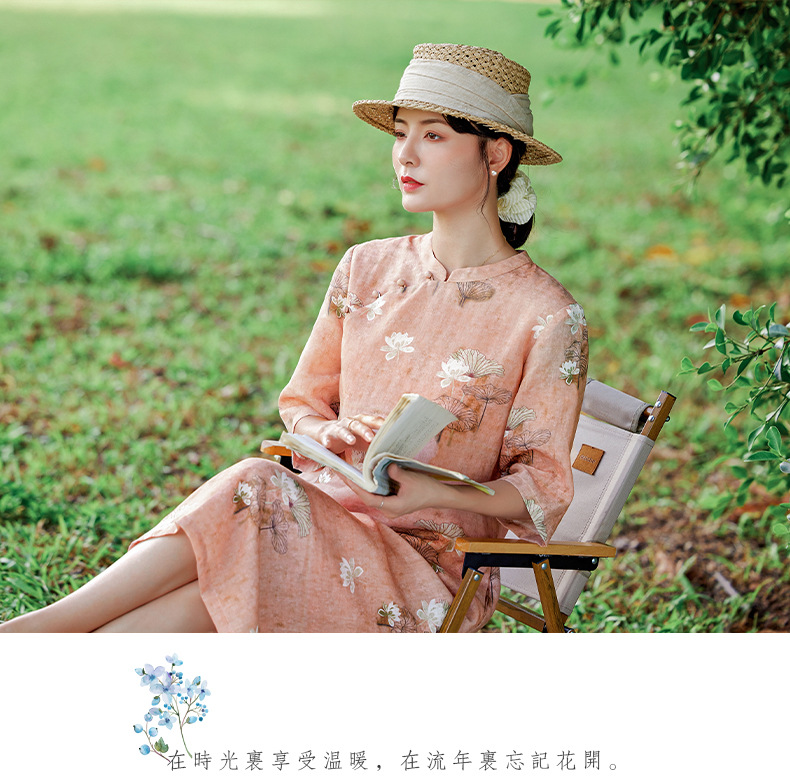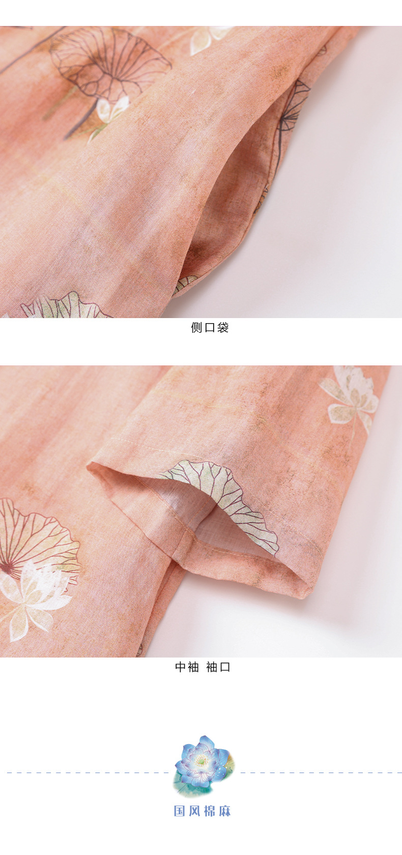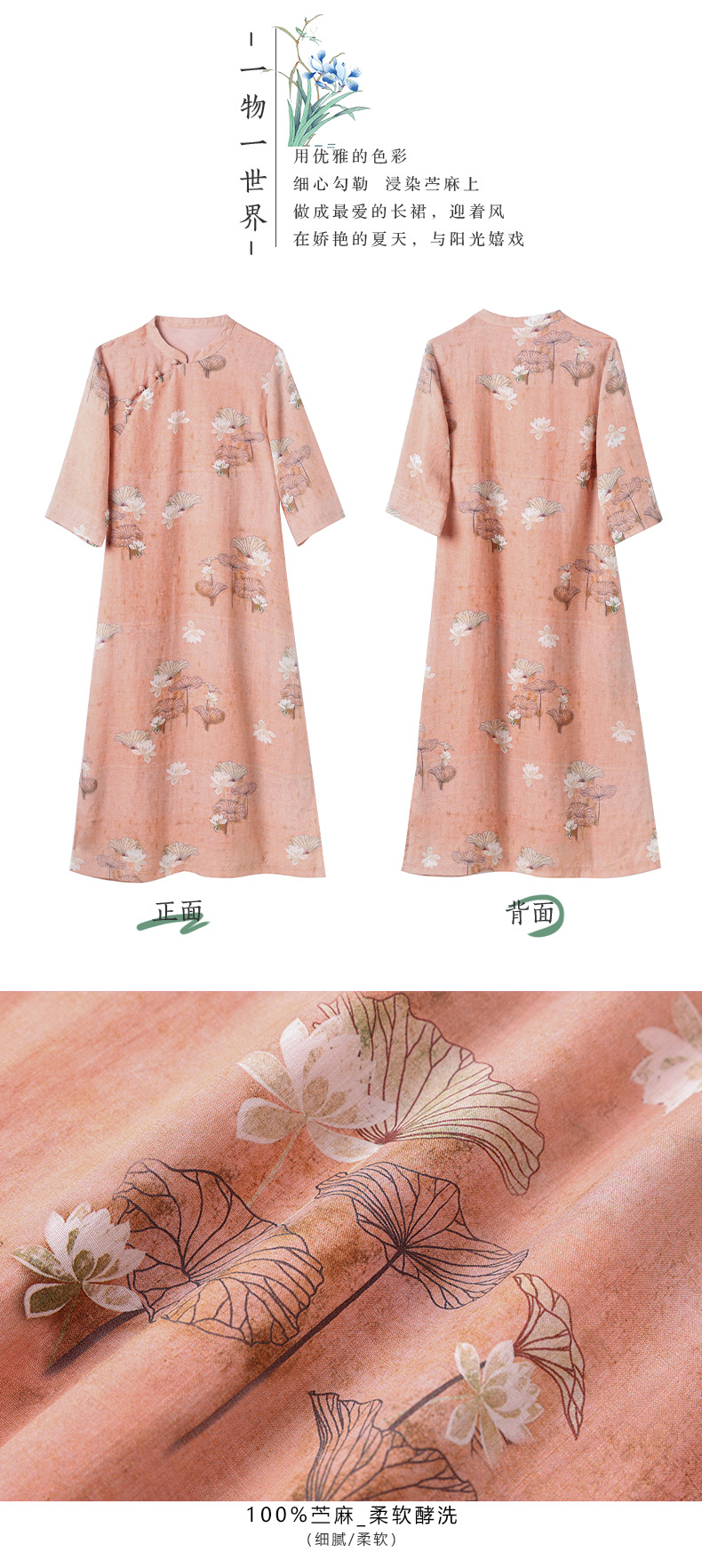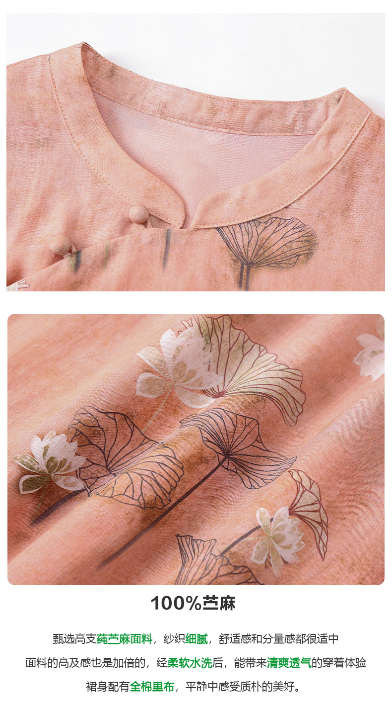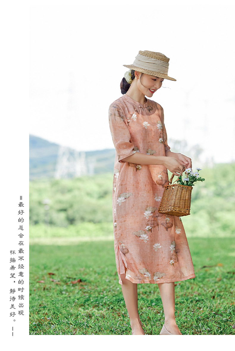 复古中国风,印花改良旗袍裙开叉夏新款荷花中袖立领苎麻连衣裙YM-S402-1