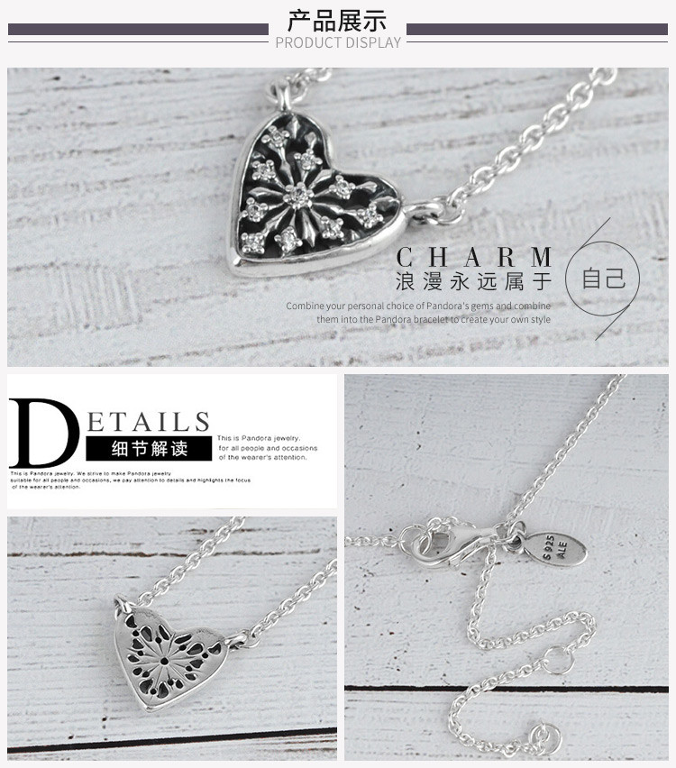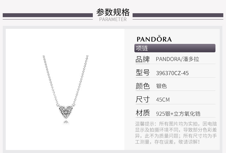 PANDORA/潘多拉 女士925 银心形吊坠锁骨项链396370CZ 银色