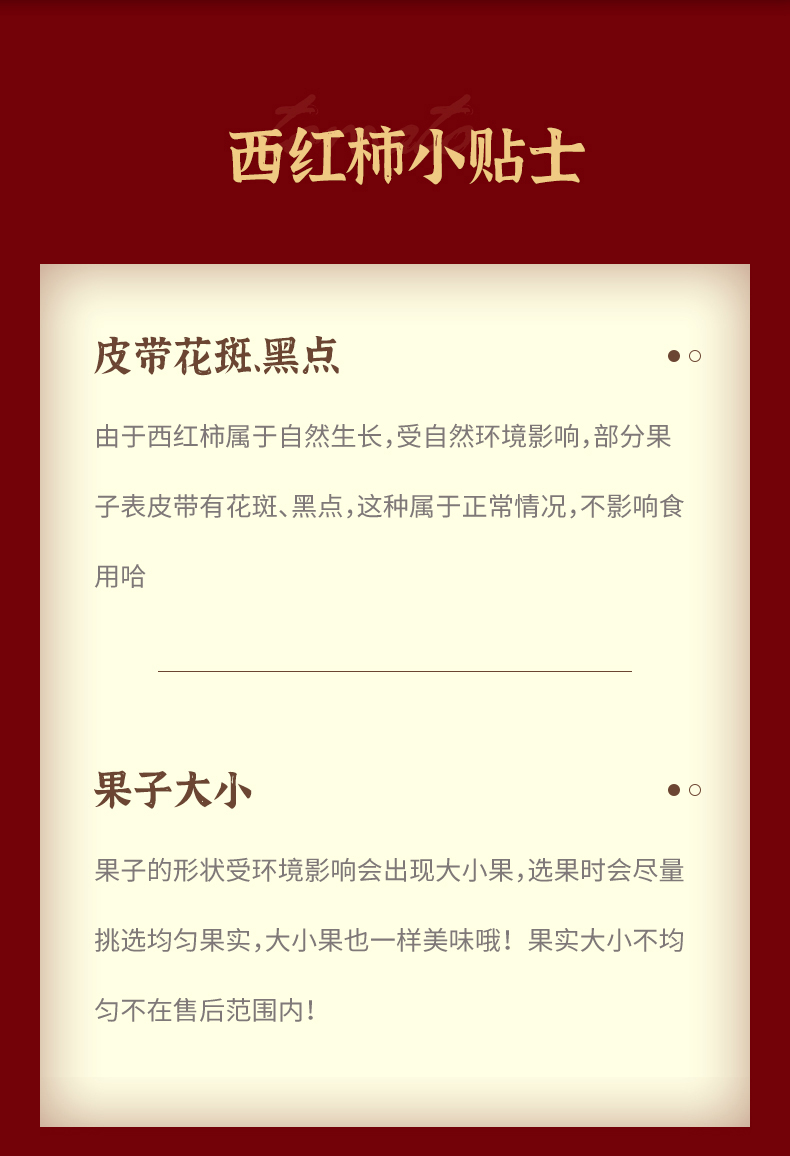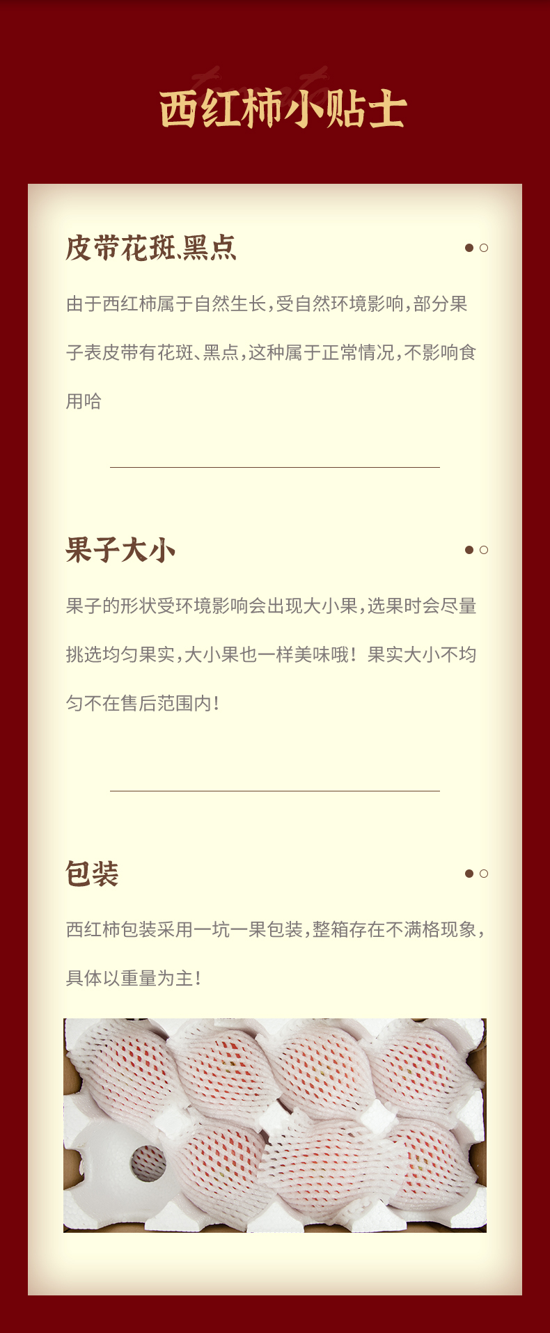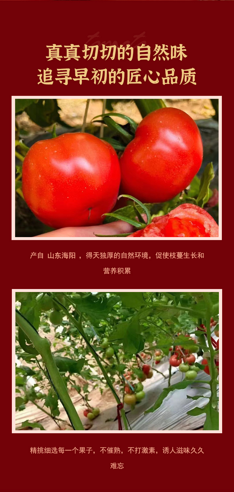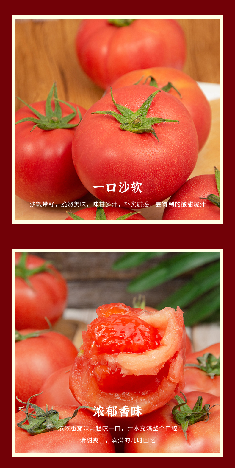 西红柿口感、大小、籽粒受品种、地理位置、季节(温差)、光照时长等因素影响,每一批次有差异是正常的,因食用时间不同,酸甜度、硬度及口感略有差异