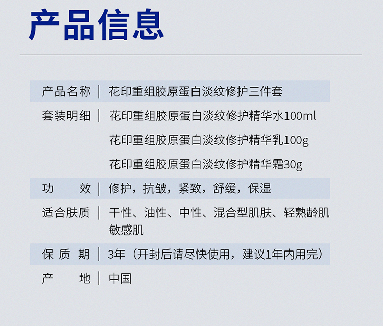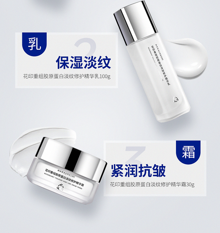 【限时折扣】花印重组胶原蛋白淡纹修护精华套装(水100ml+乳100g+面霜30g) 赠送同款水乳40ml